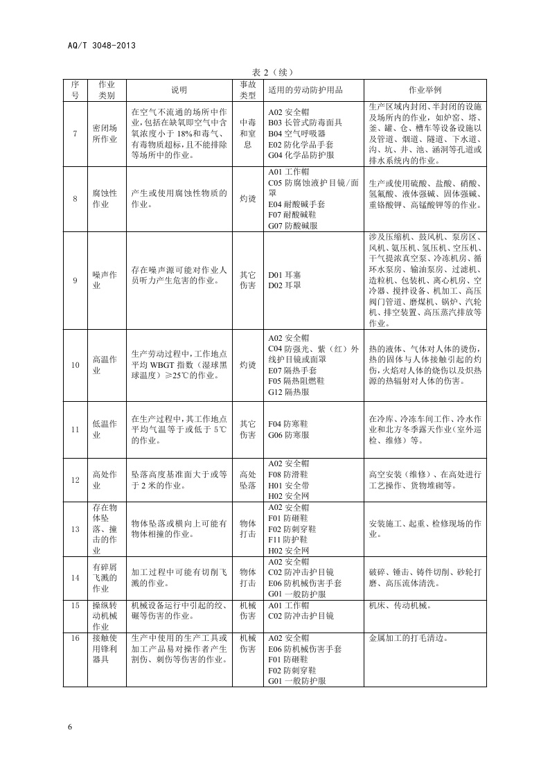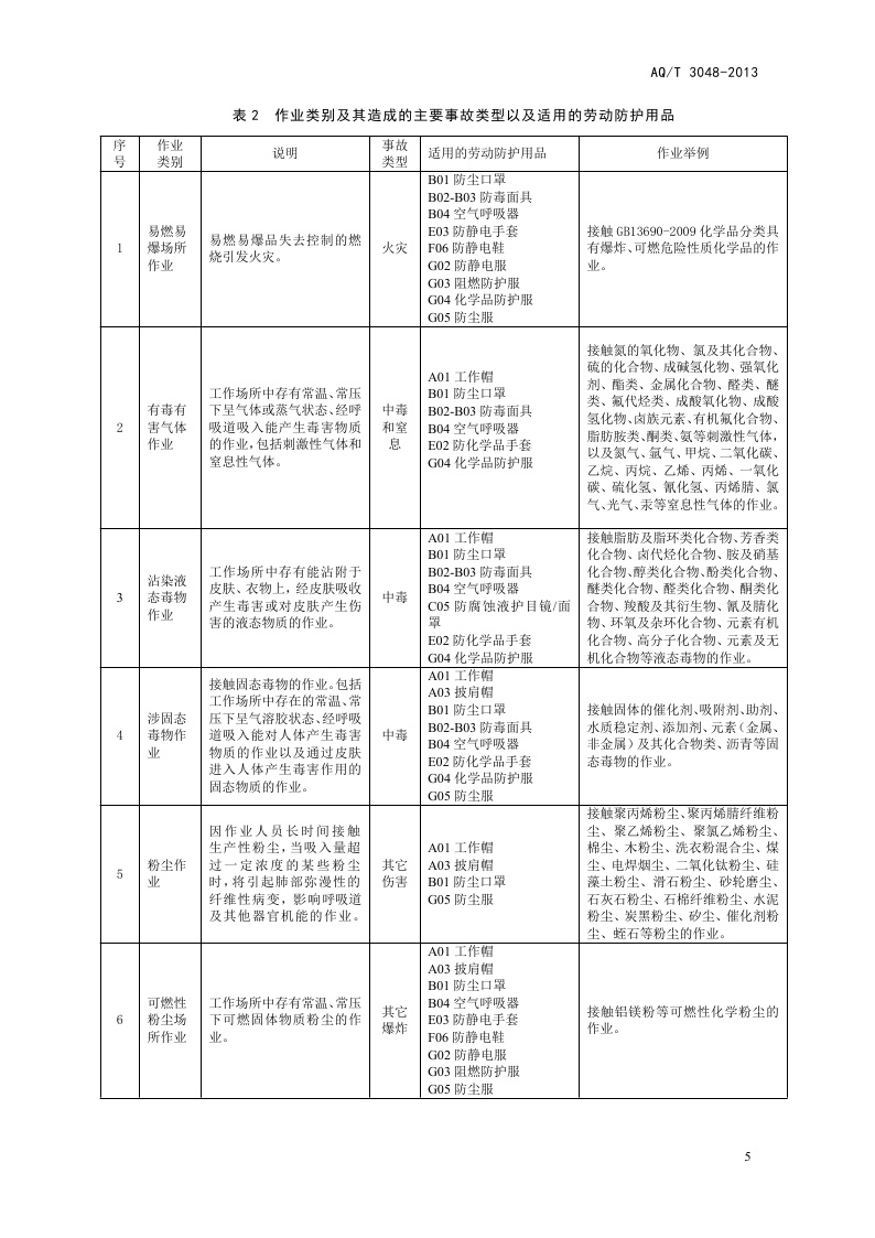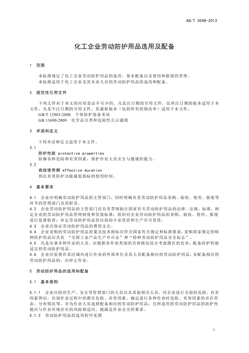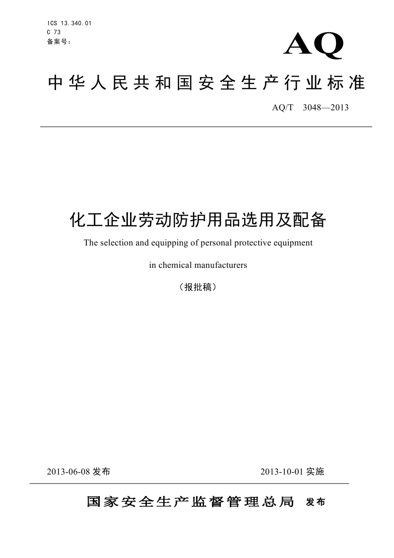 《化工企业劳动防护用品选用及配备(报批稿)》(AQ∕T3048-2013)