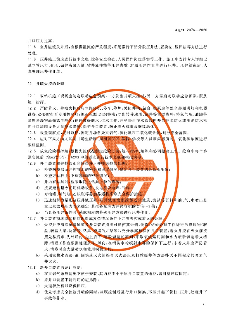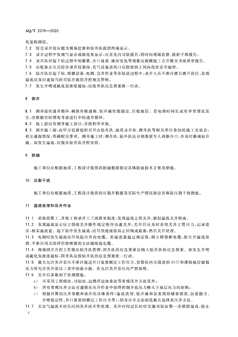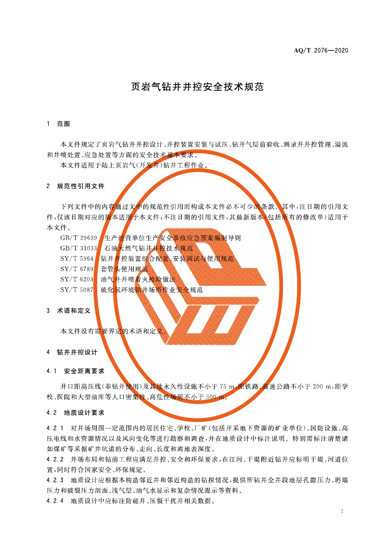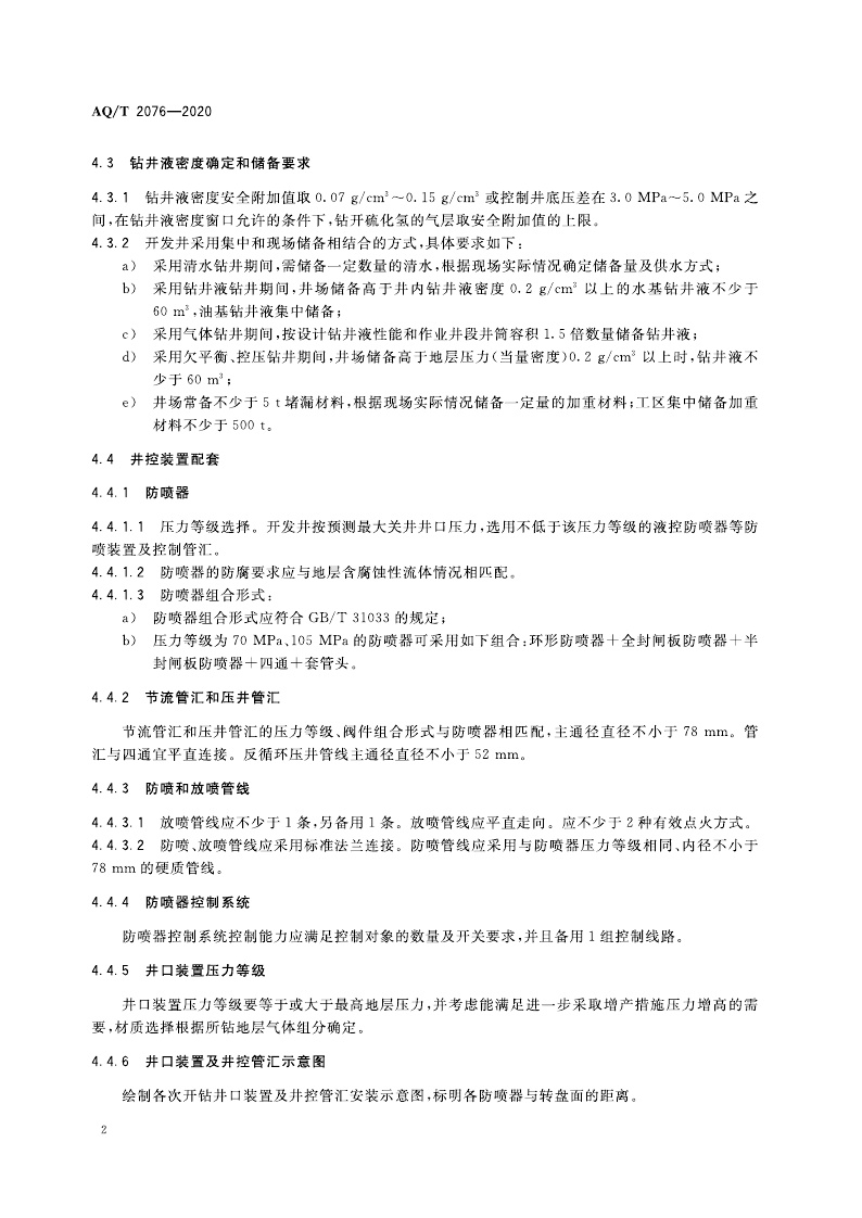 《页岩气钻井井控安全技术规范》(AQ / T2076-2020)