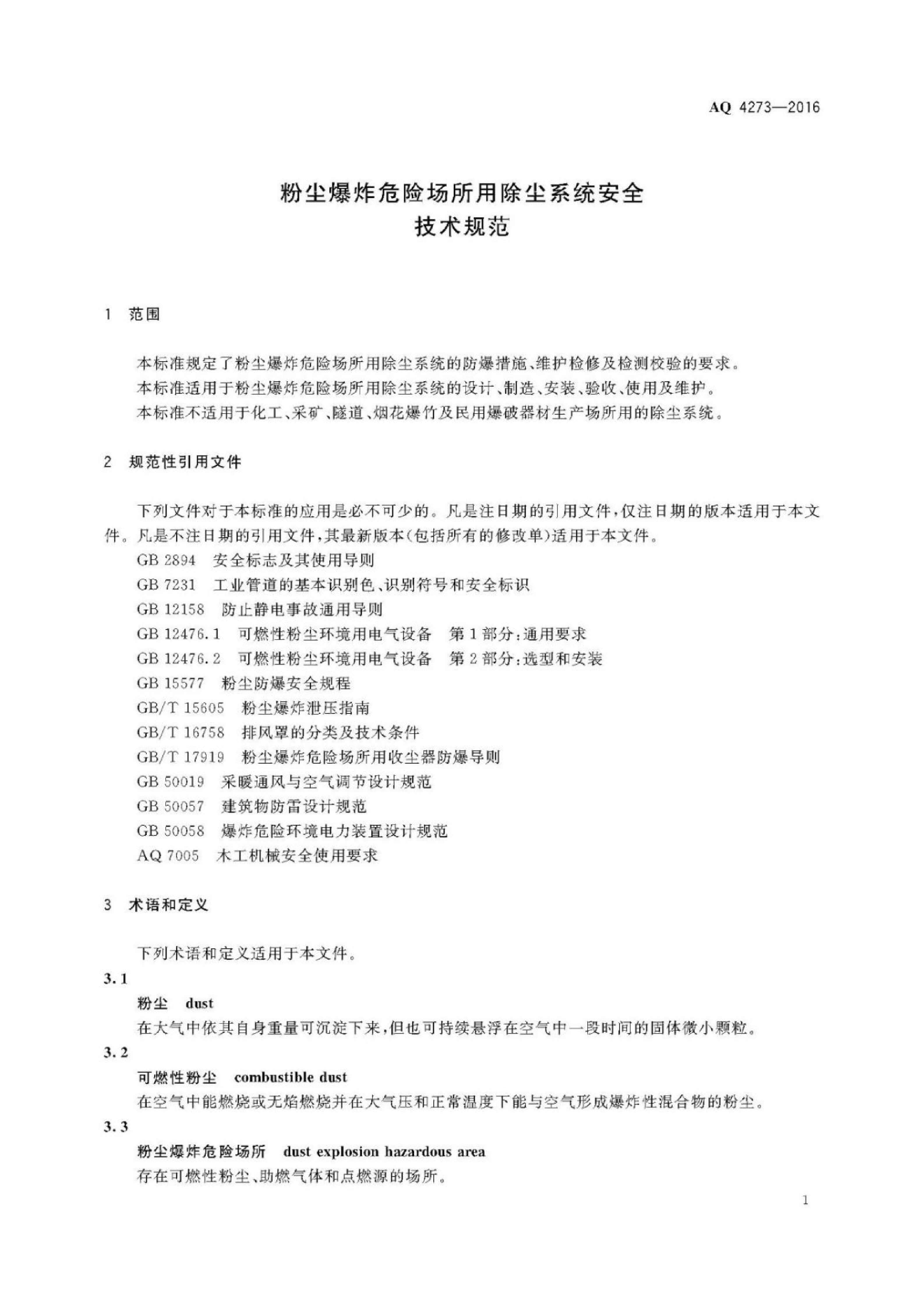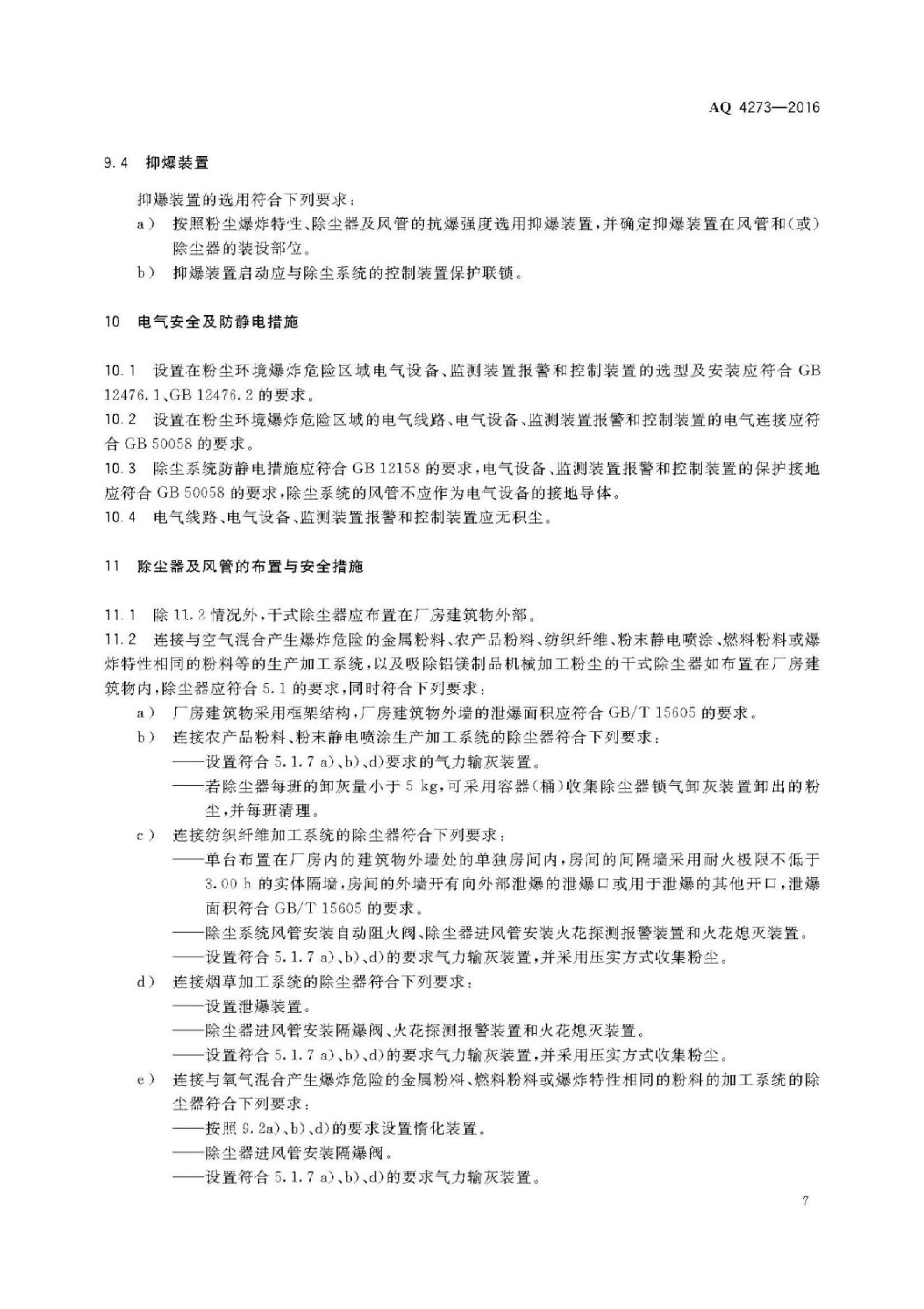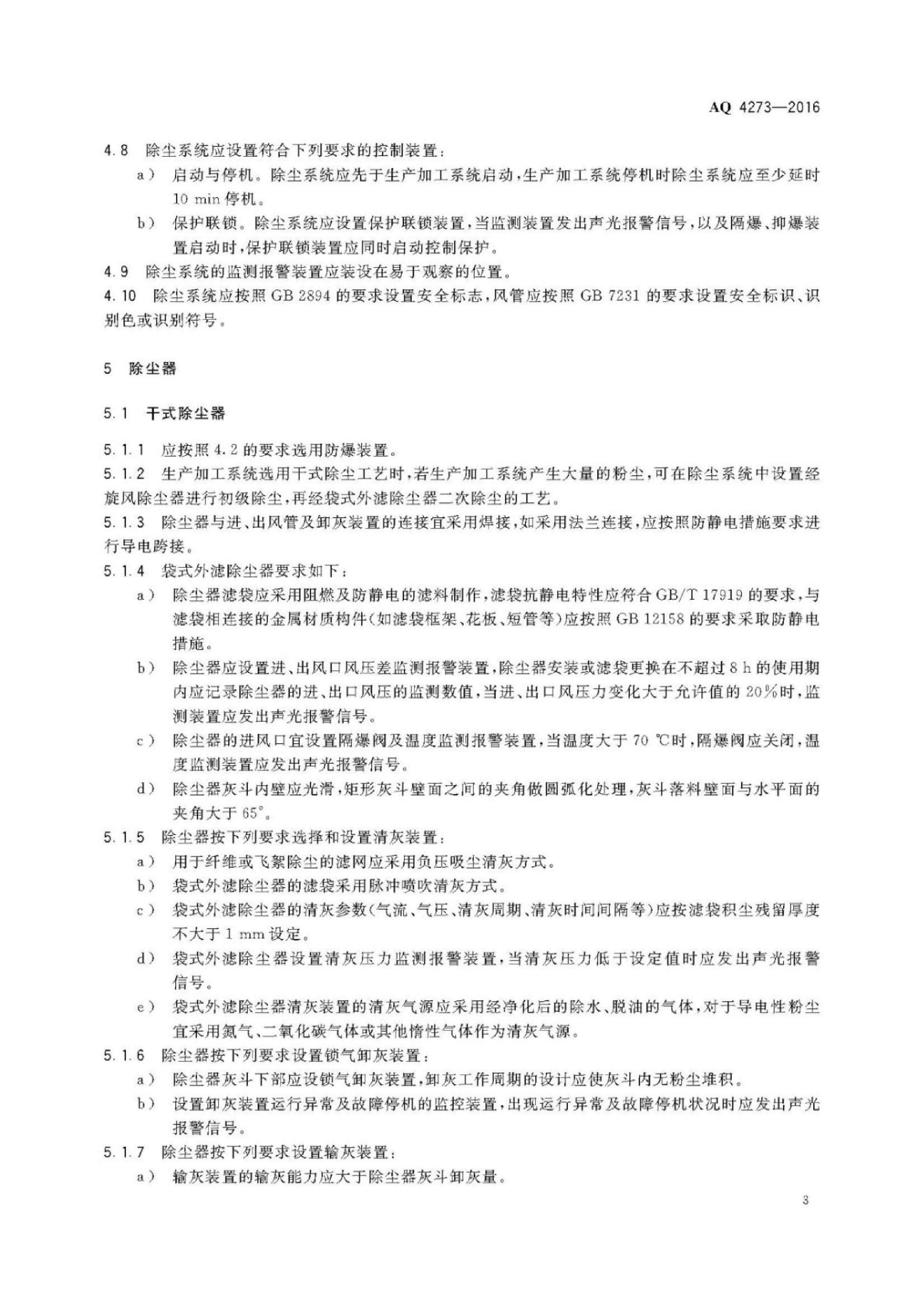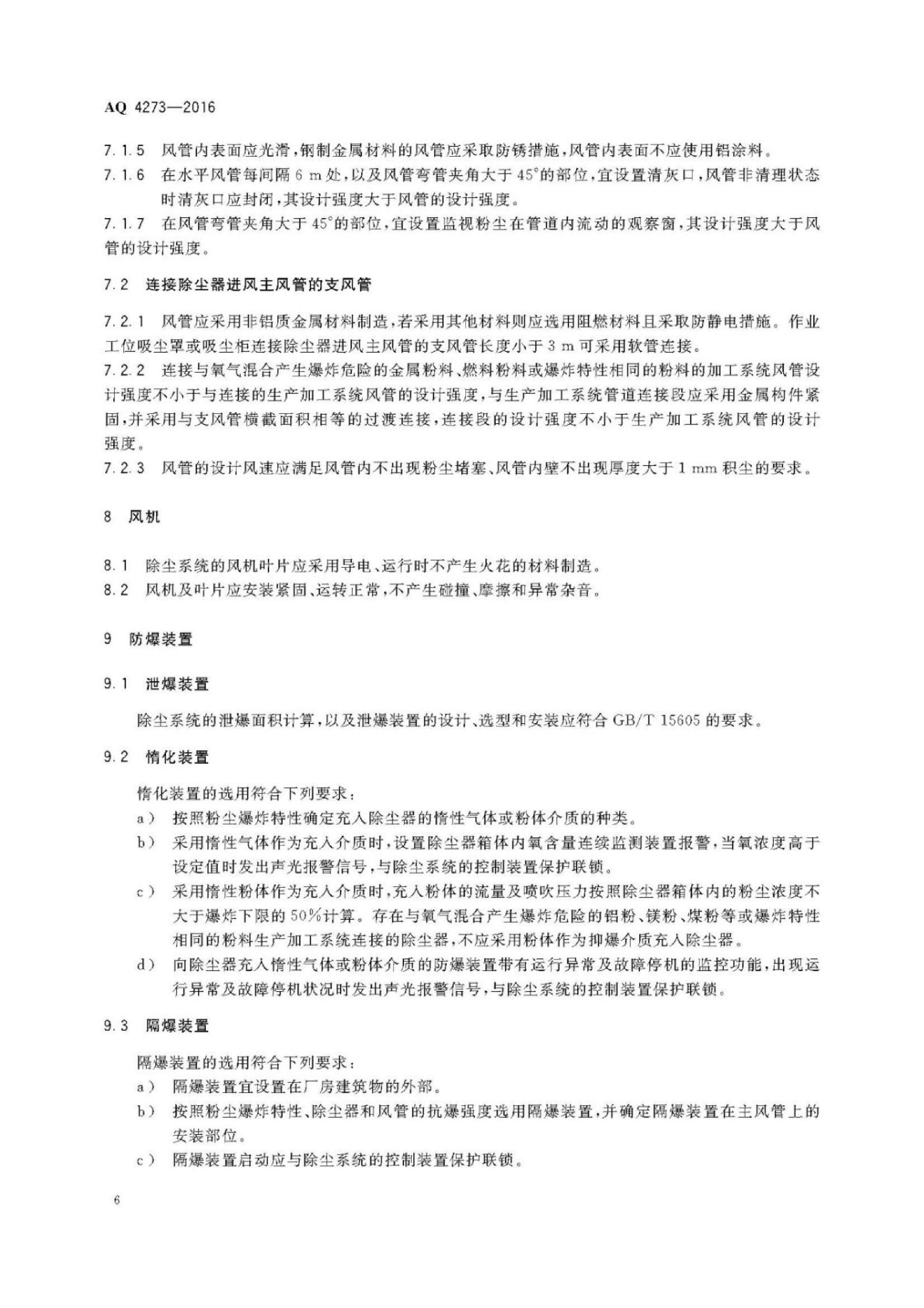 《粉尘爆炸危险场所用除尘系统安全技术规范》(AQ 4273-2016)