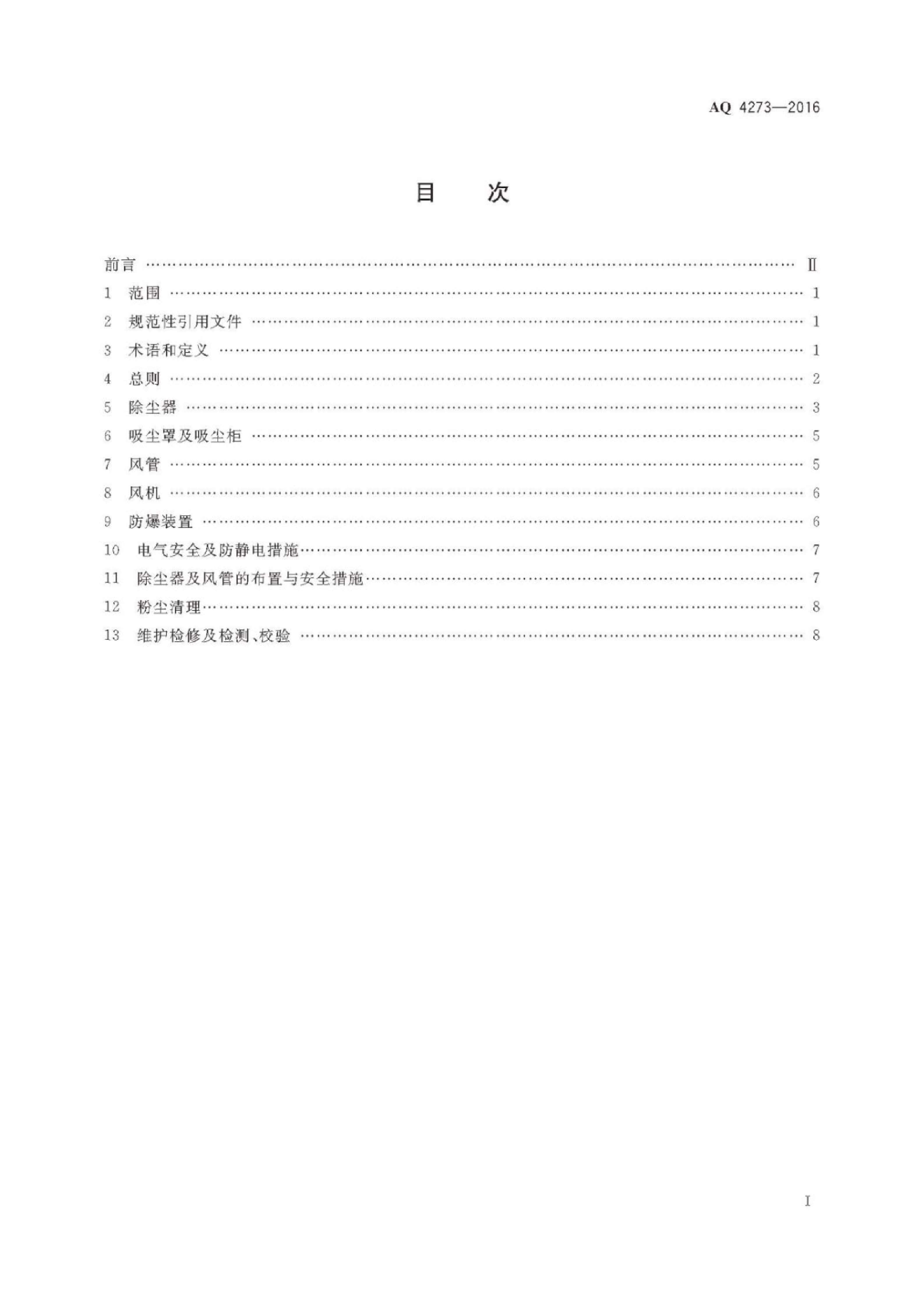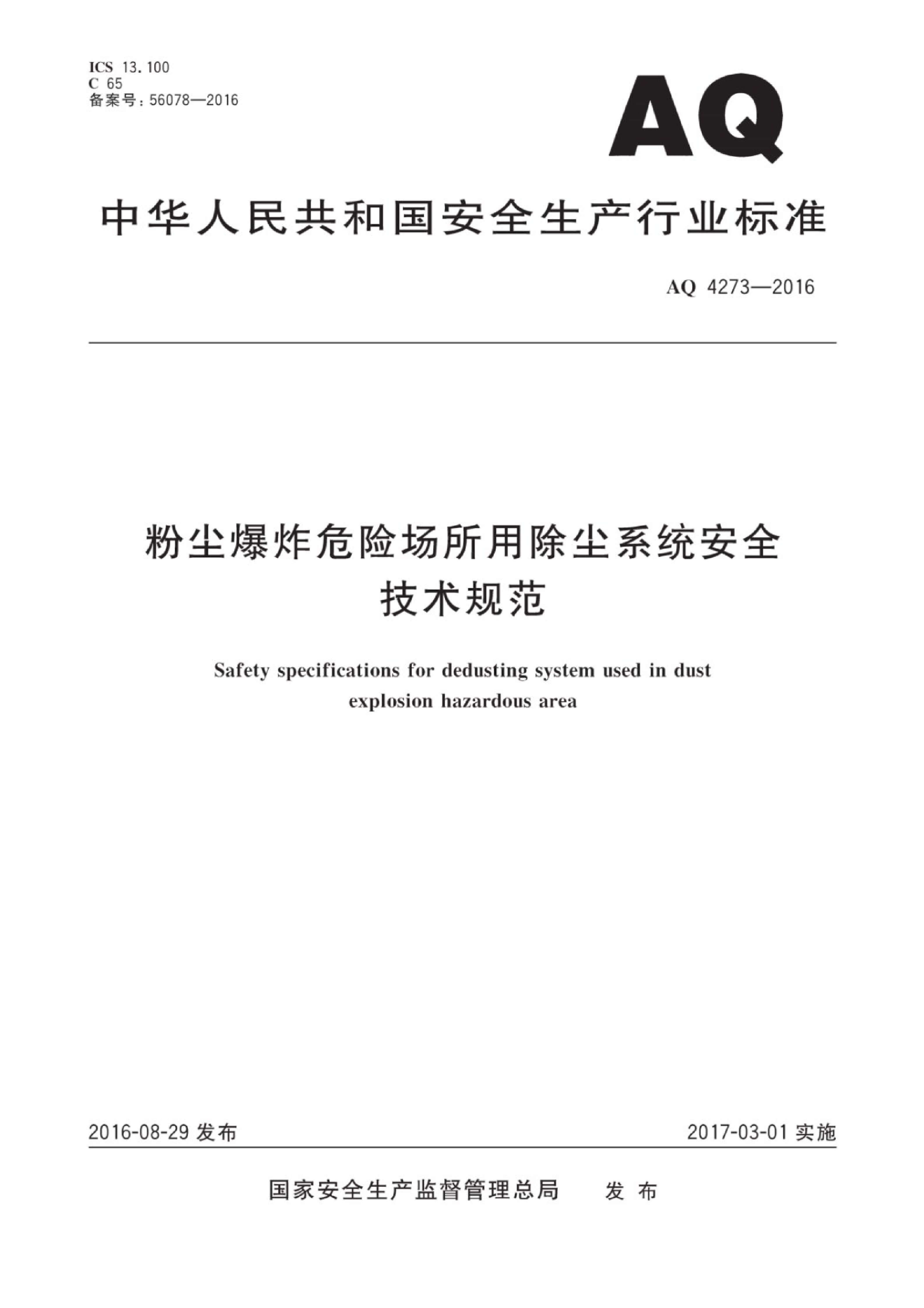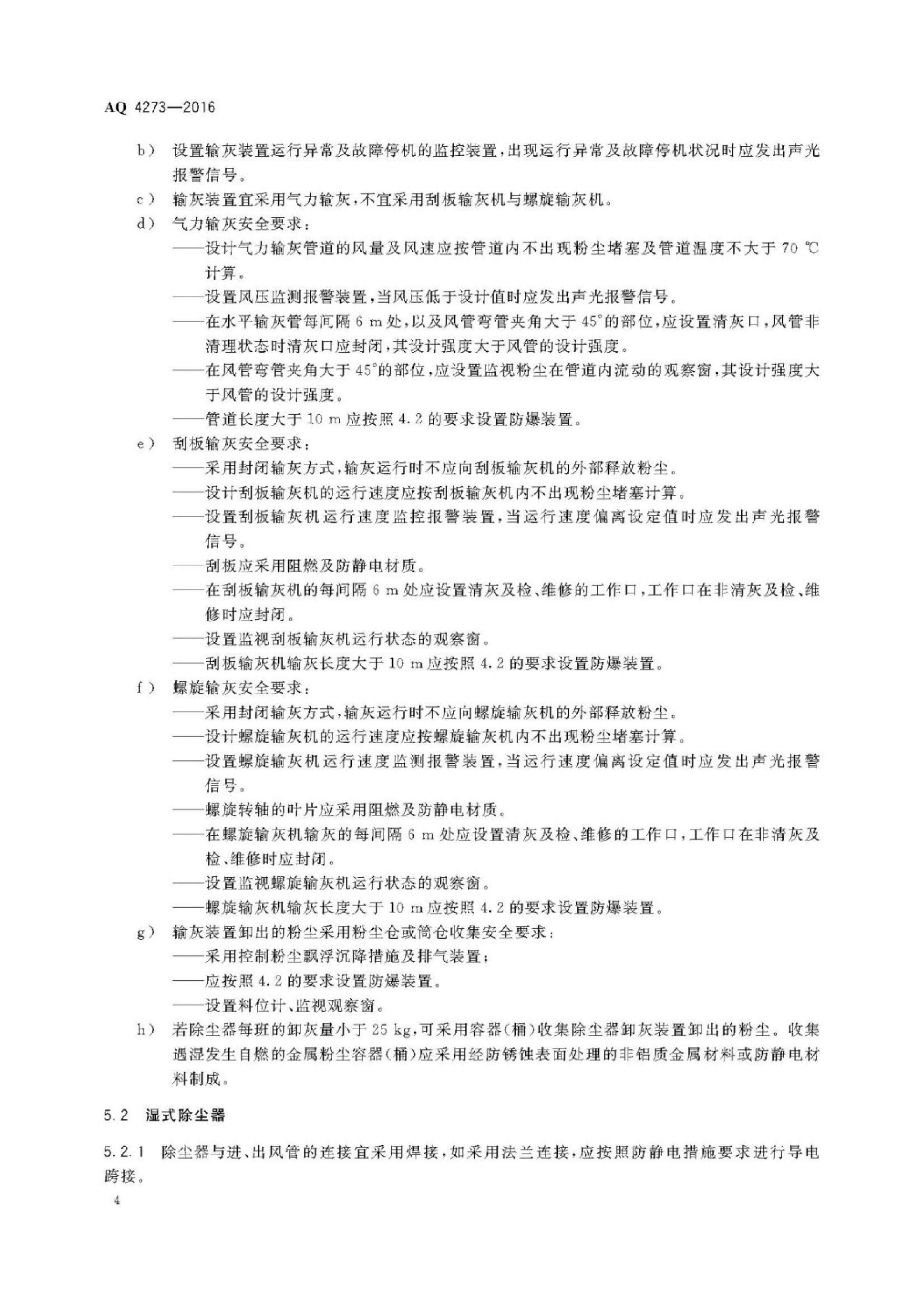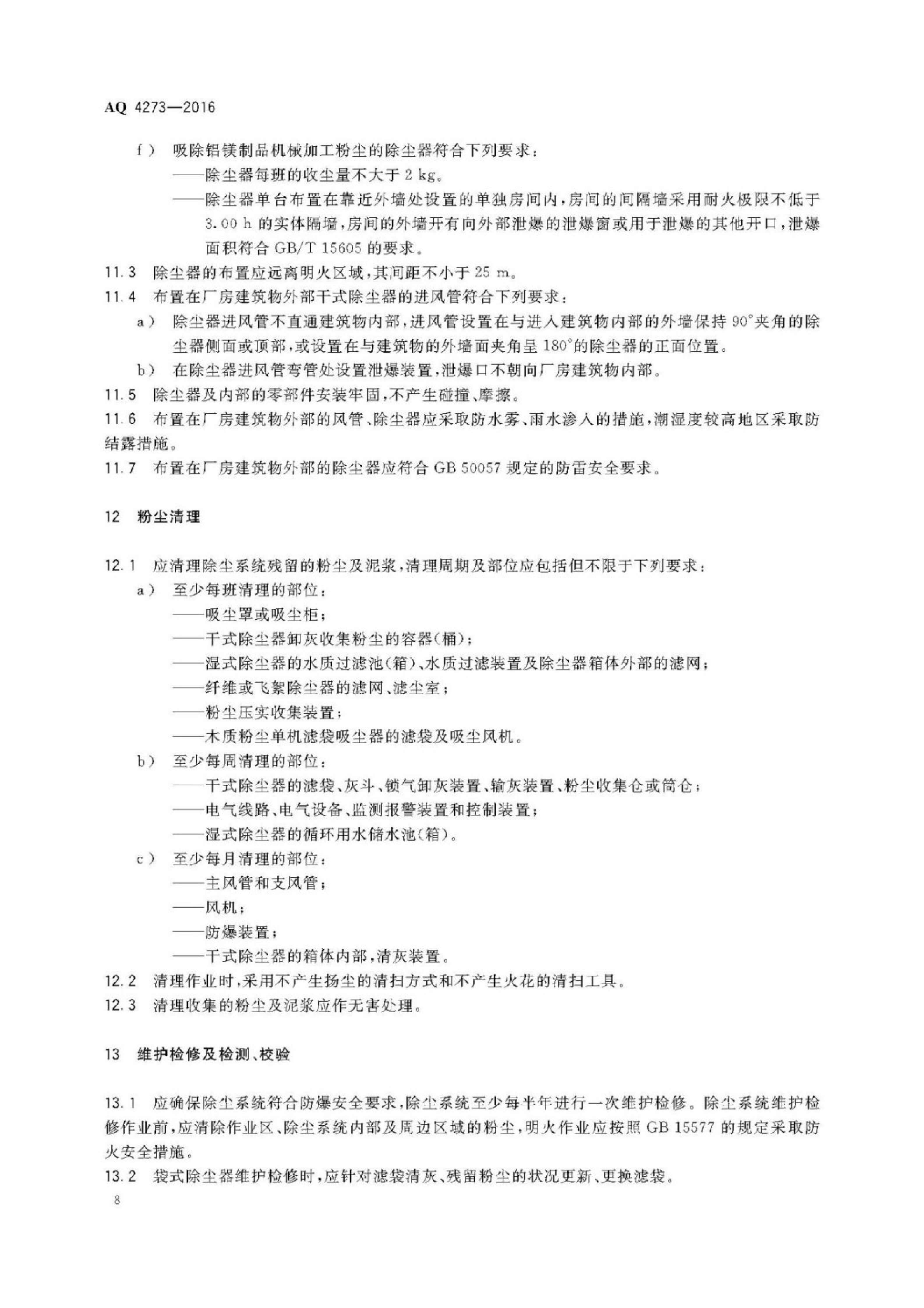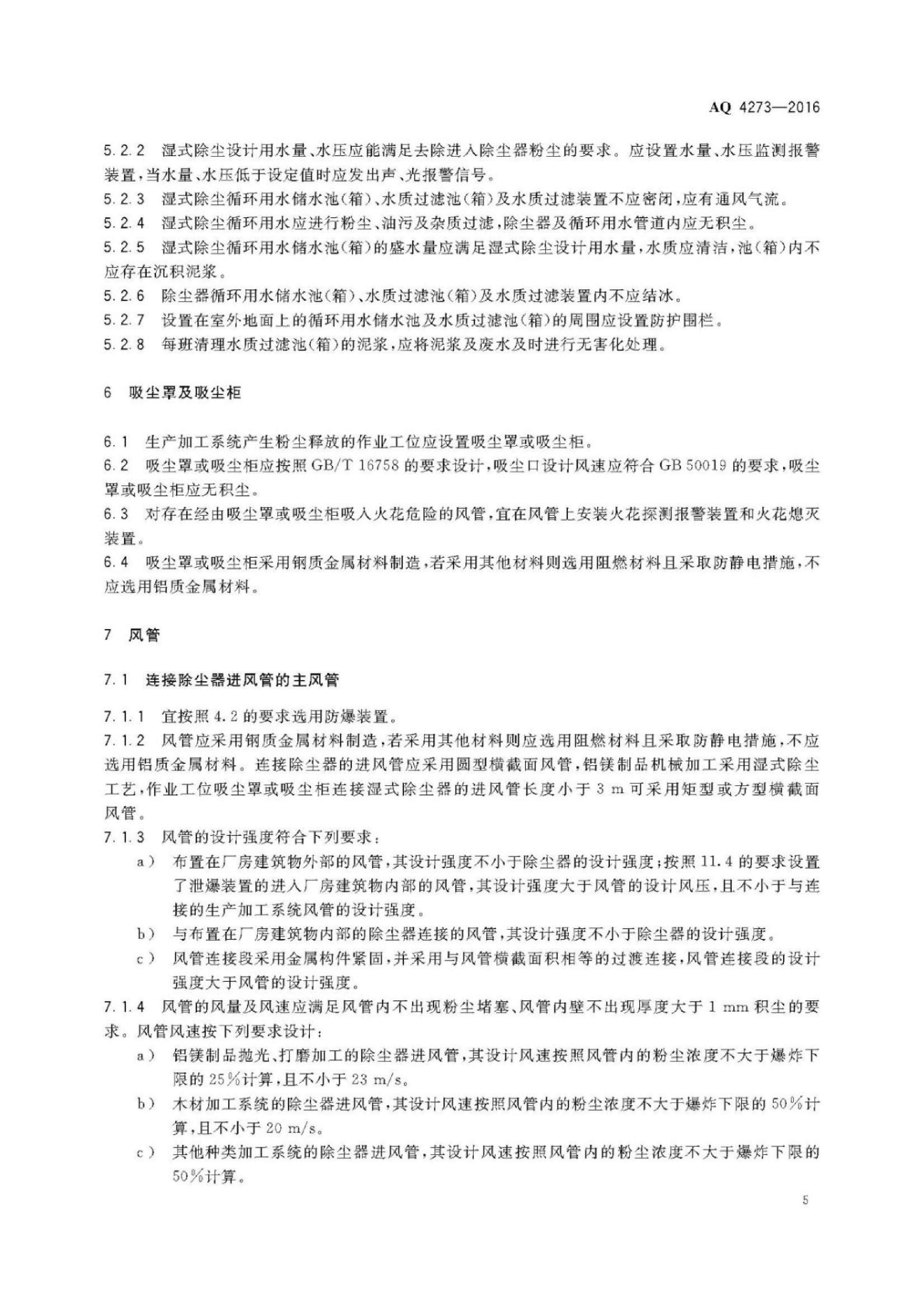 《粉尘爆炸危险场所用除尘系统安全技术规范》(AQ 4273-2016)
