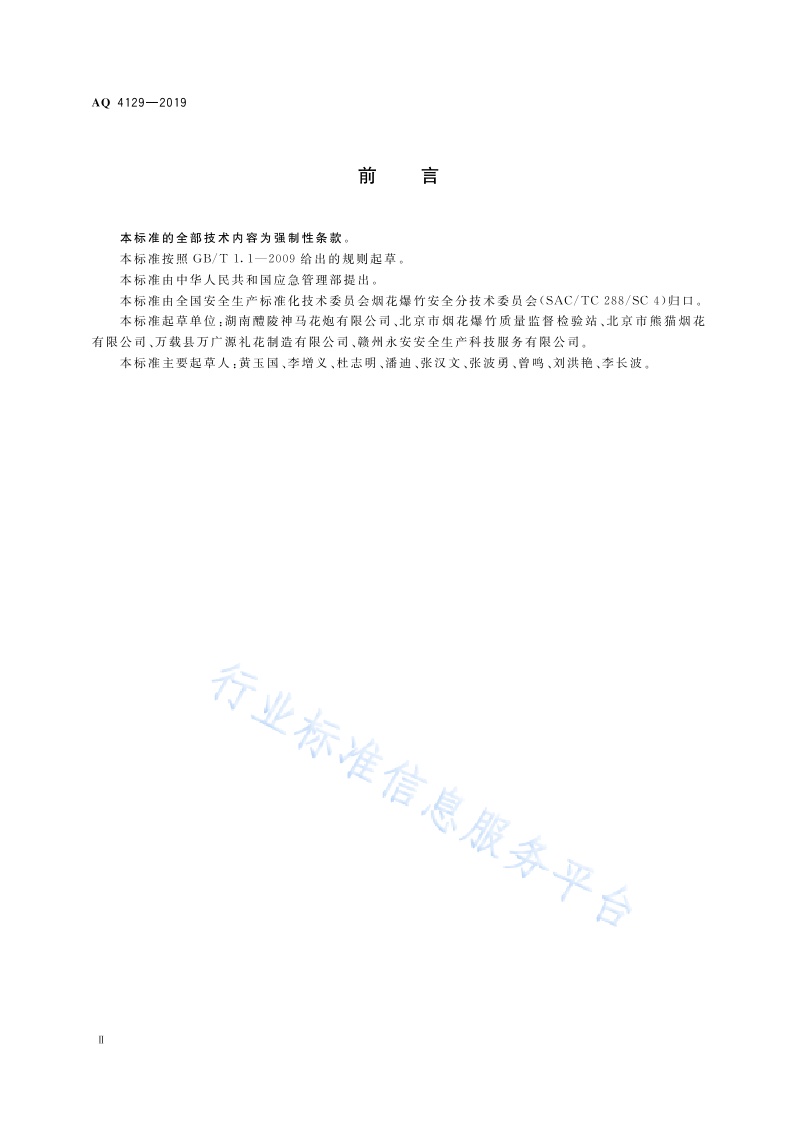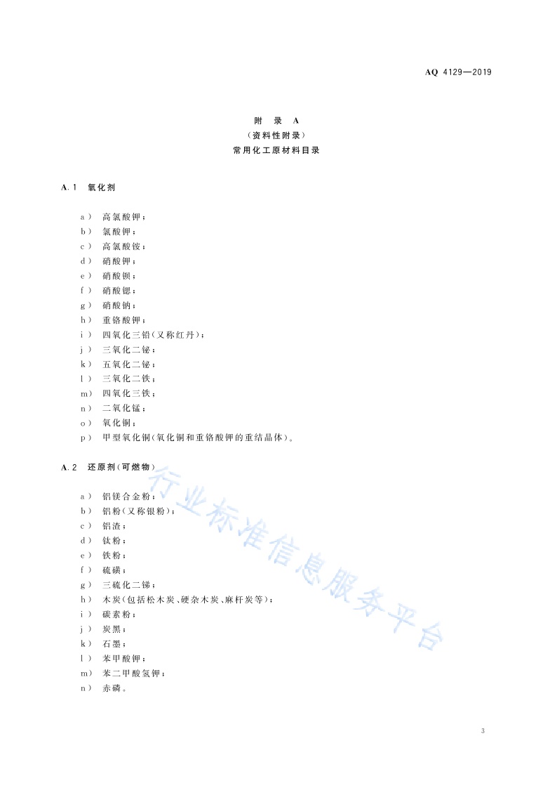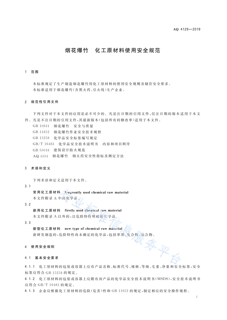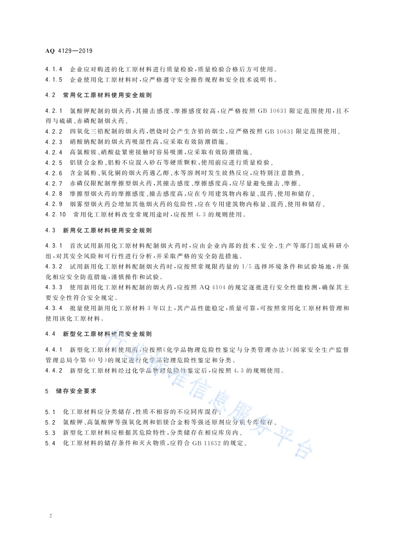 《烟花爆竹化工原材料使用安全规范》(AQ 4129-2019)