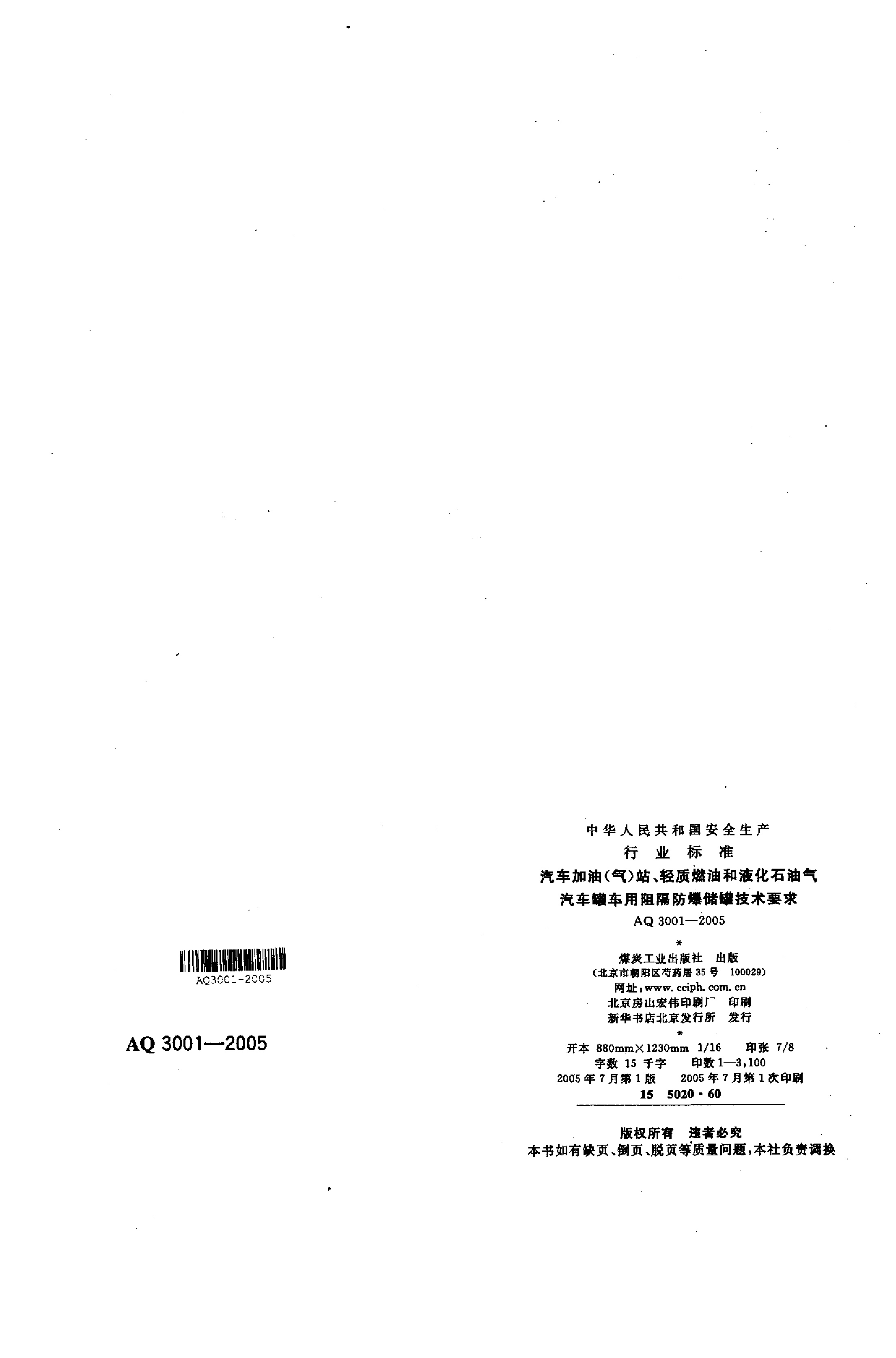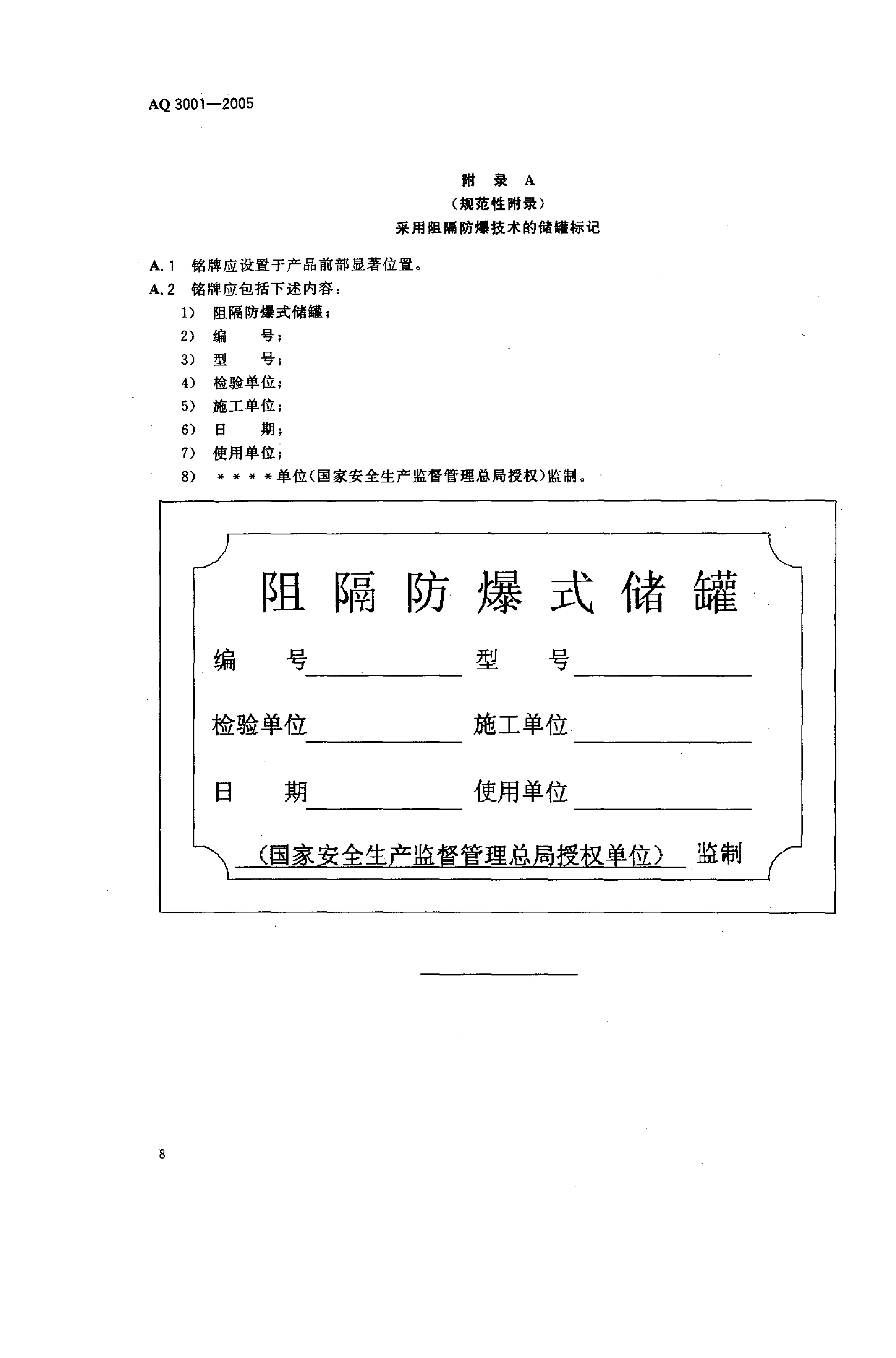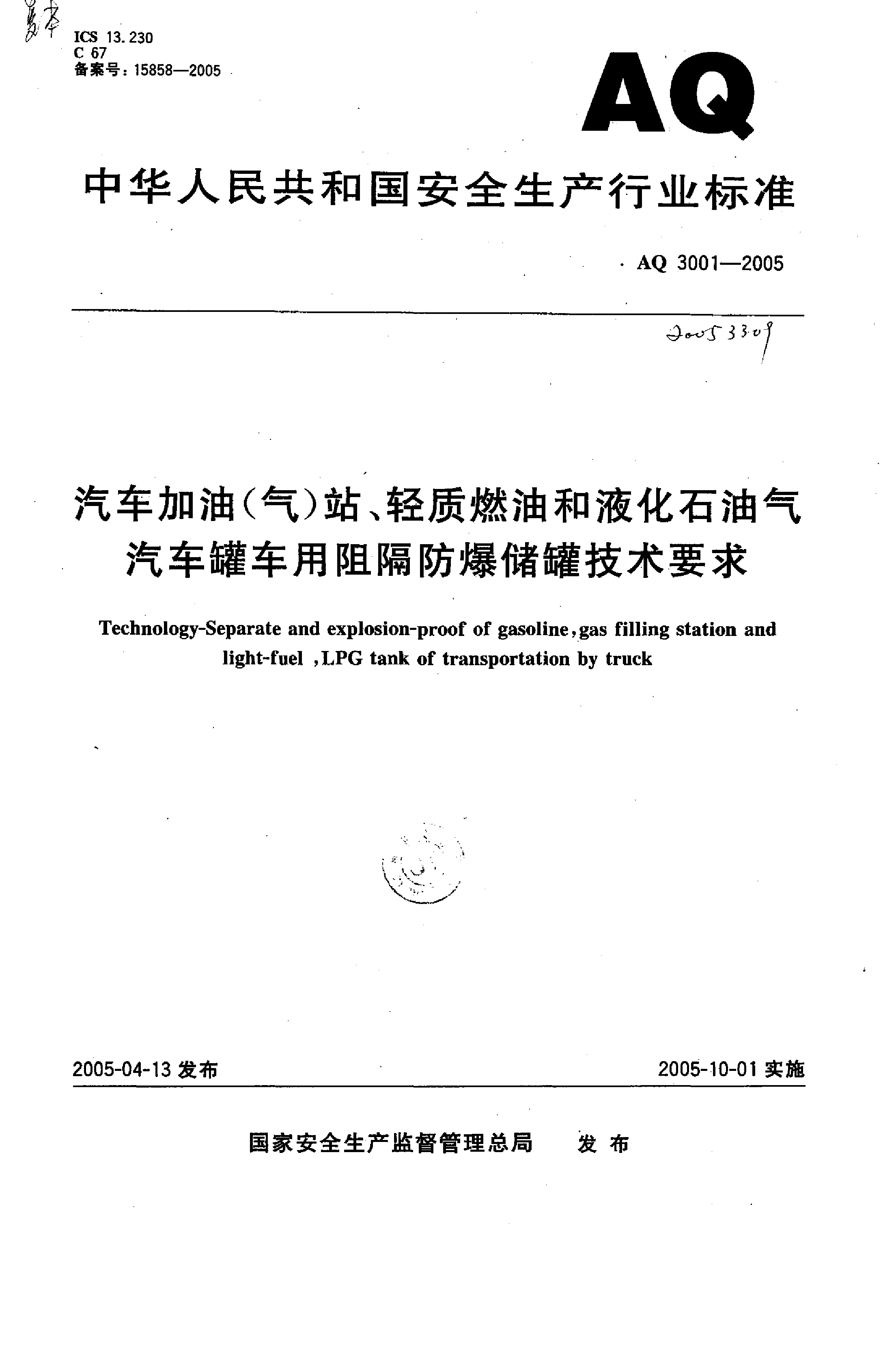 《汽车加油(气)站、轻质燃油和液化石油气汽车罐车用阻隔防爆储罐技术要求》(AQ 3001-2005)