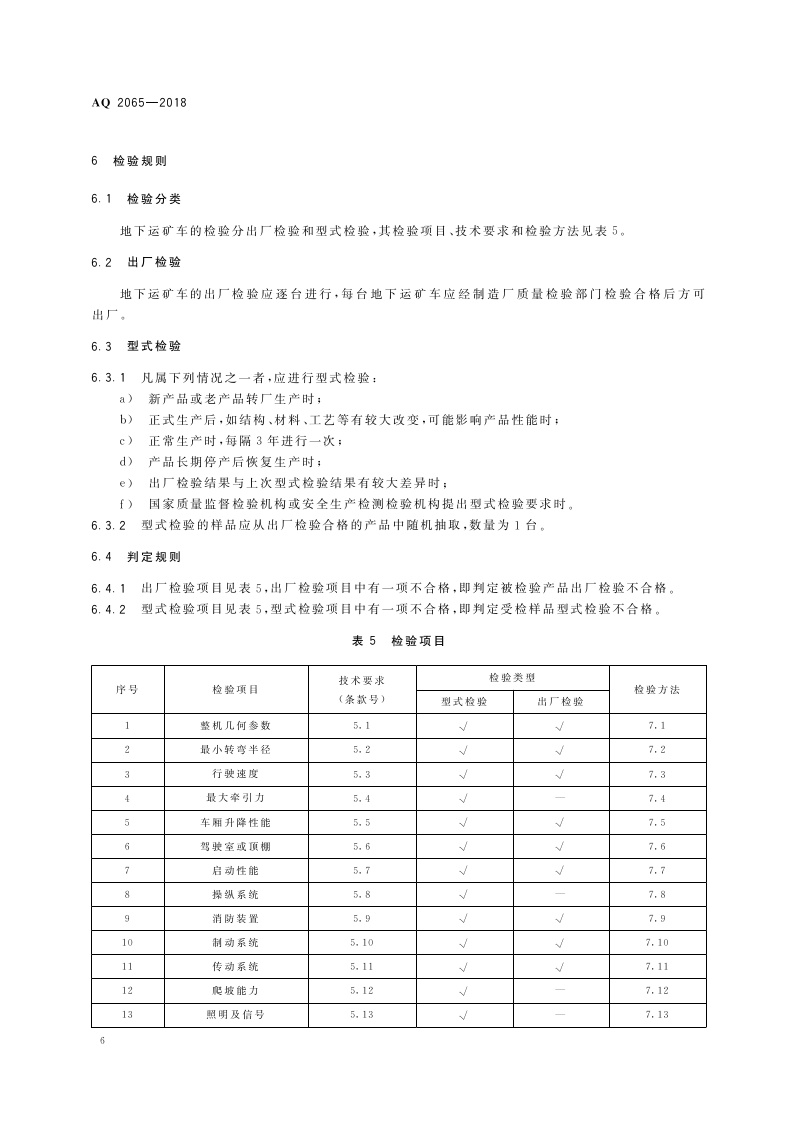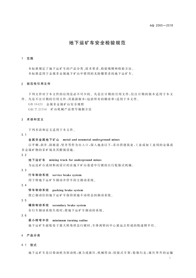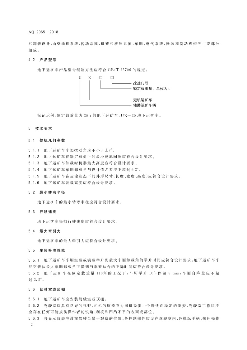 《地下运矿车安全检验规范》(AQ 2065-2018)