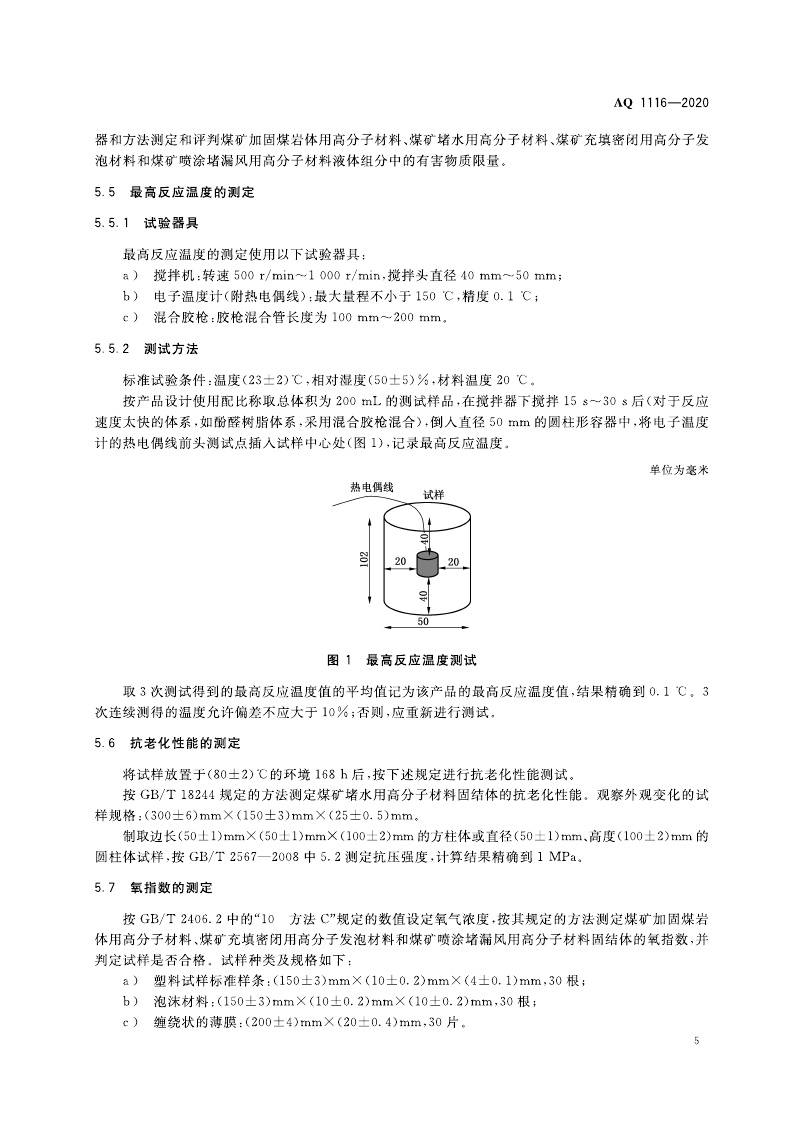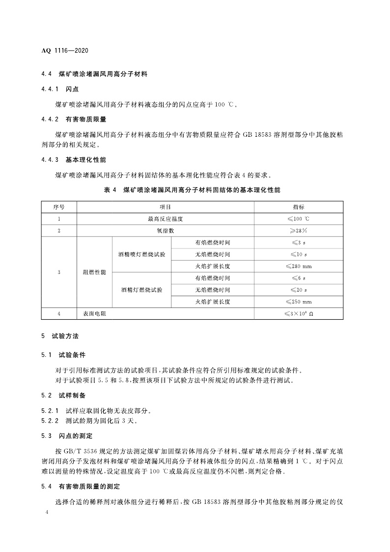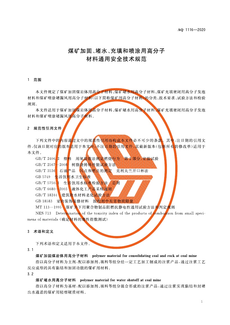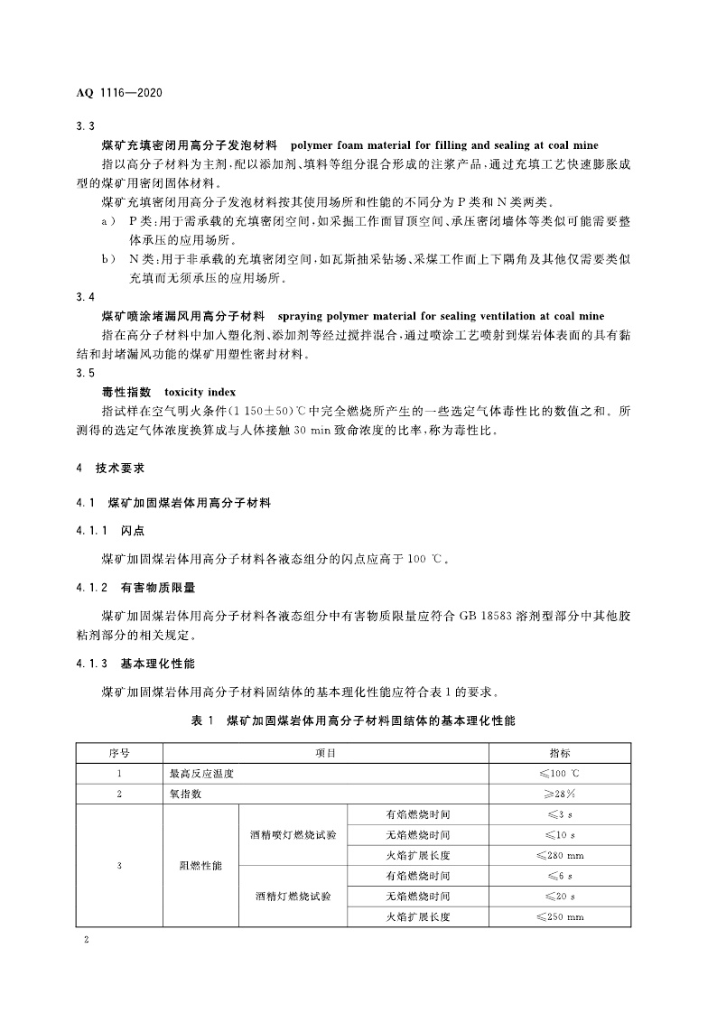 《煤矿加固、堵水、充填和喷涂用高分子材料通用安全技术规范》(AQ 1116-2020)
