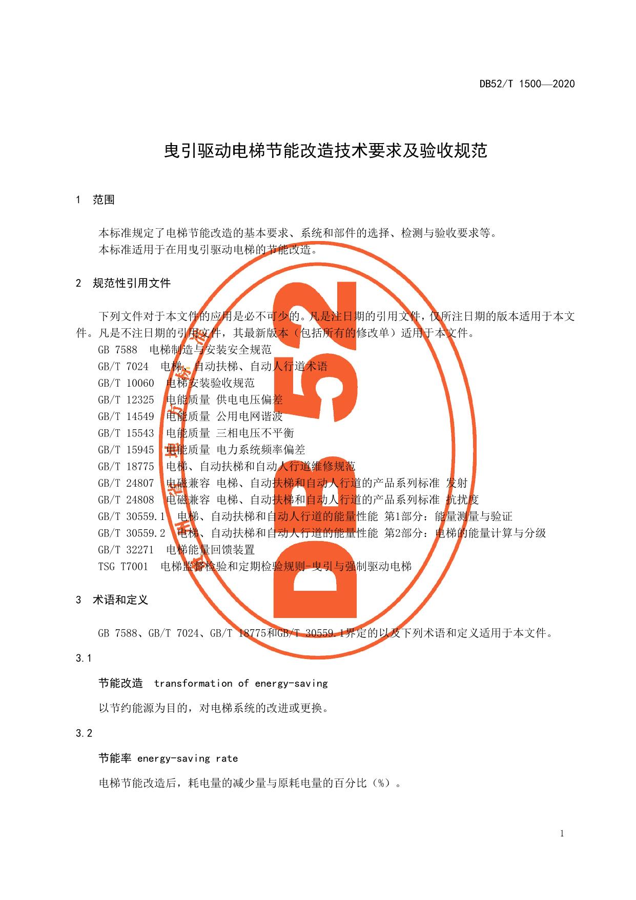 《曳引驱动电梯节能改造技术要求及验收规范》(DB52/T 1500-2020)