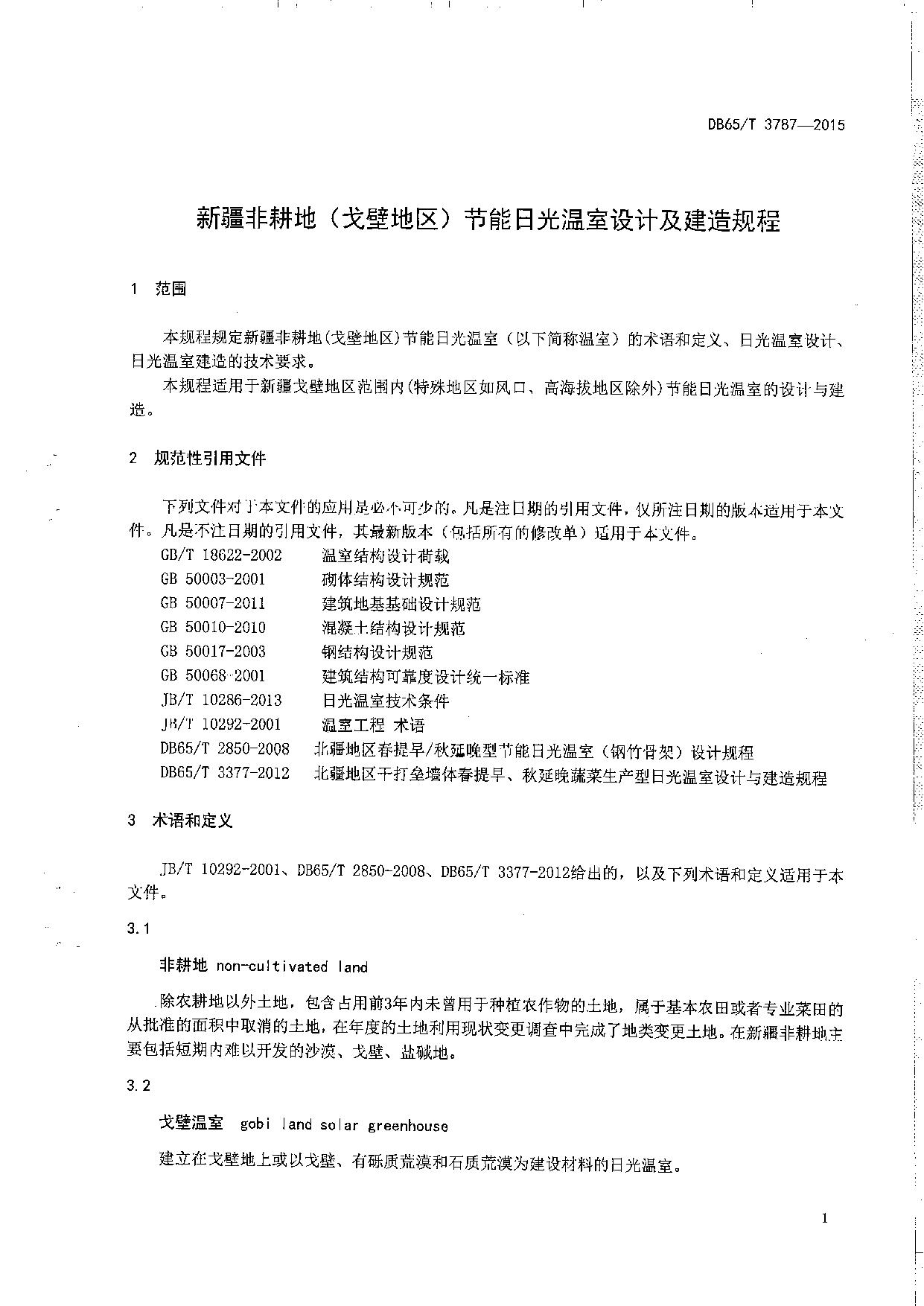 《新疆非耕地(戈壁地区)节能日光温室设计及建造规程》(DB65/T 3787-2015)