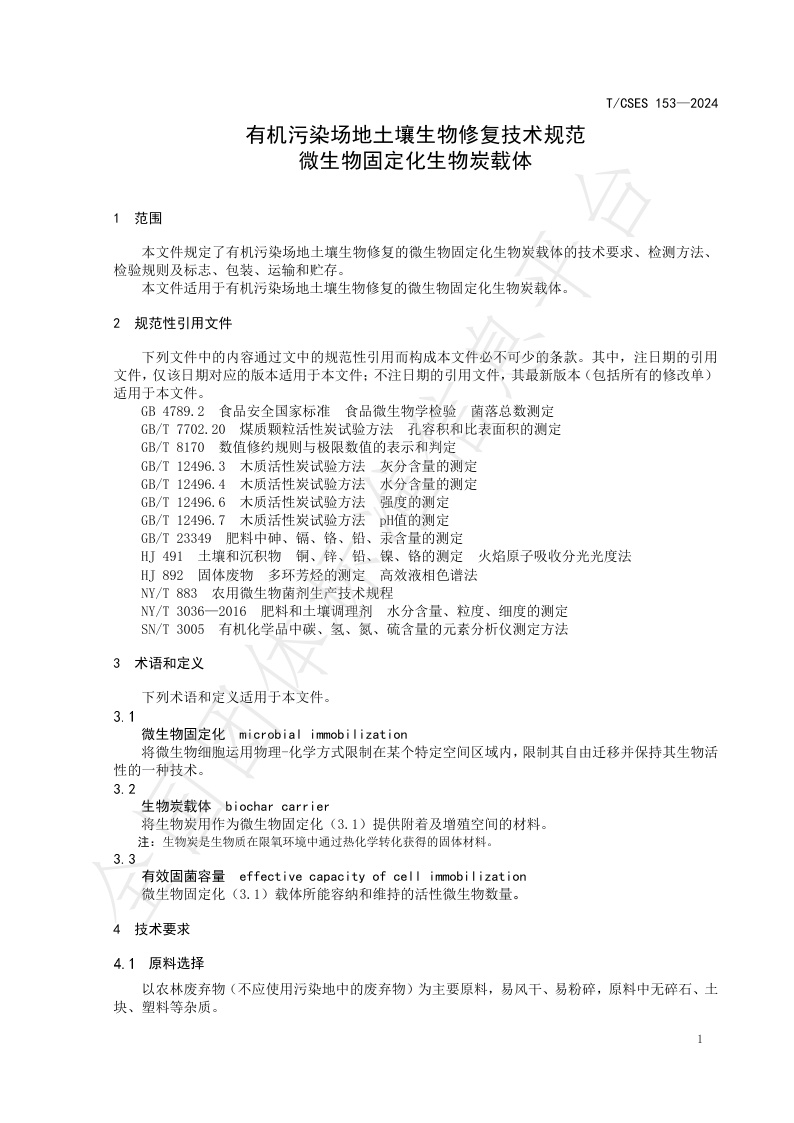 TCSES 153—2024《有机污染场地土壤生物修复技术规范 微生物固定化生物炭载体》