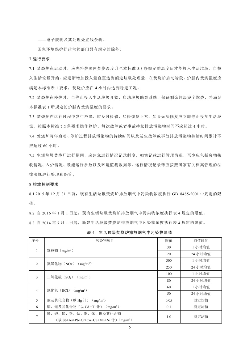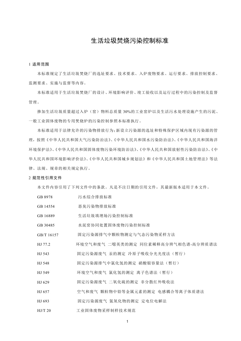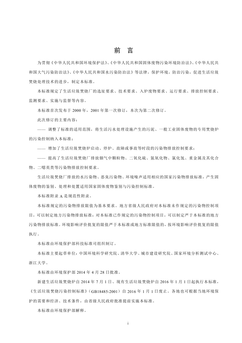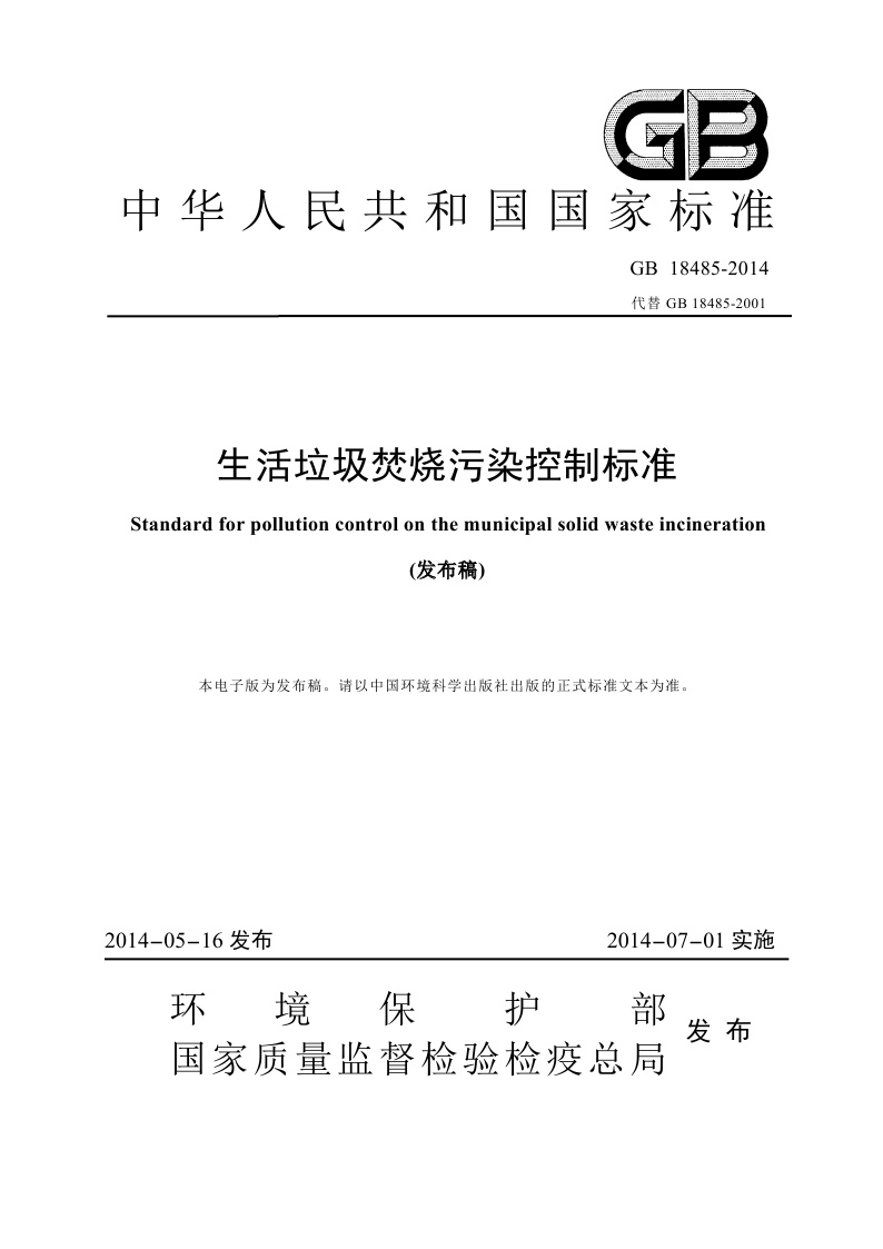 《生活垃圾焚烧污染控制标准》(GB 18485-2014)