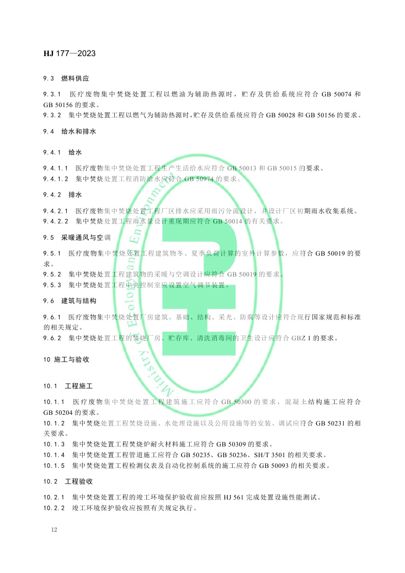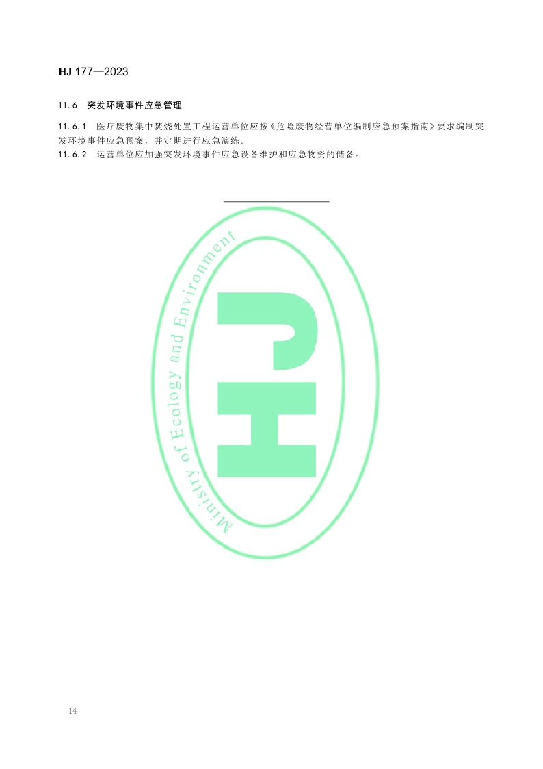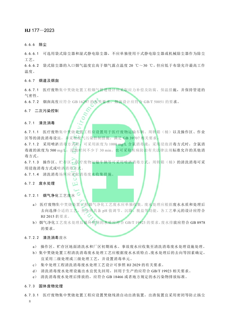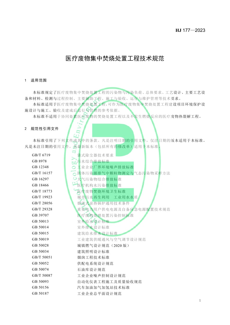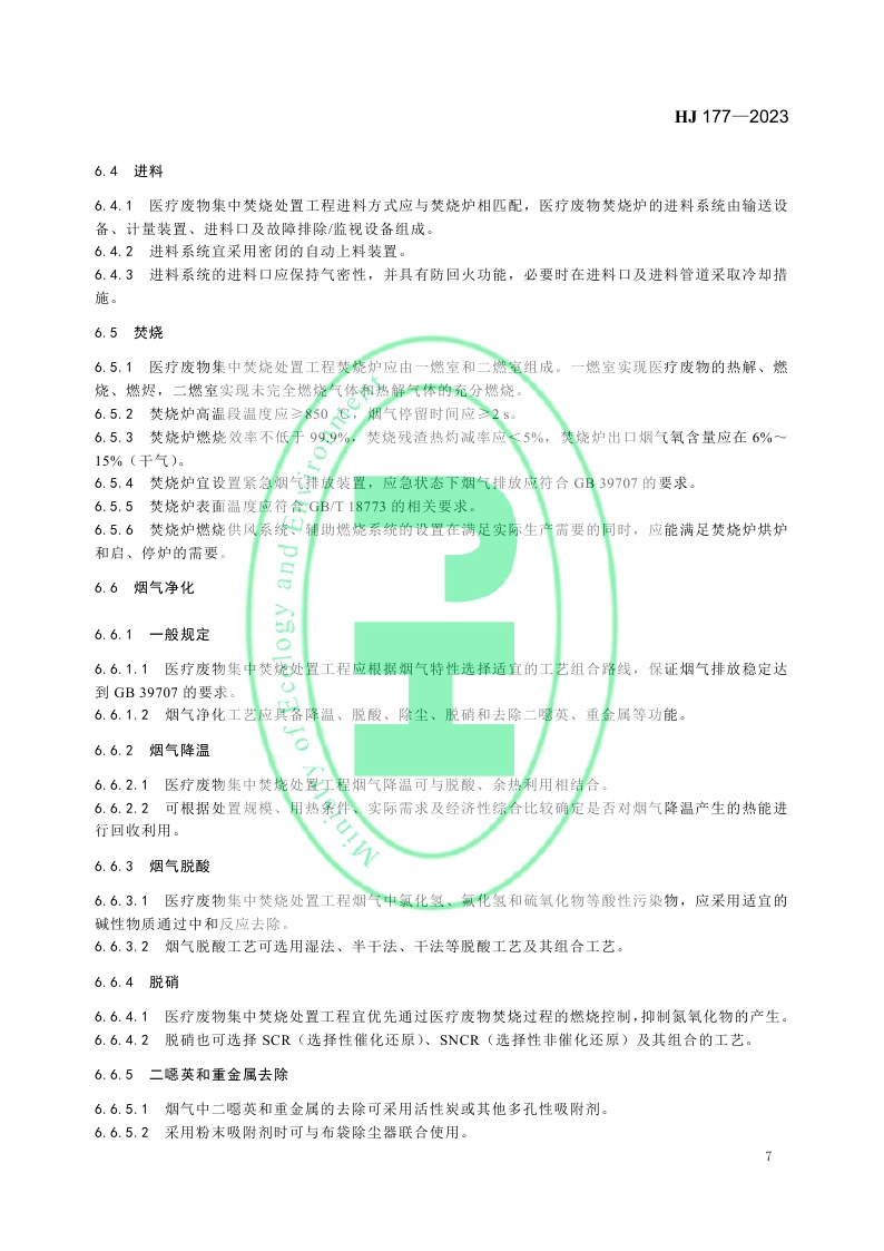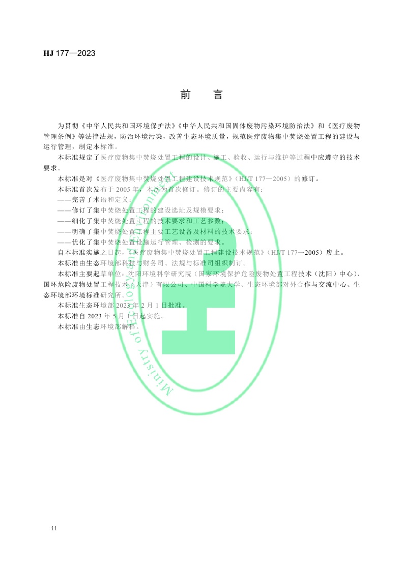 《医疗废物集中焚烧处置工程技术规范》 (HJ 177—2023)