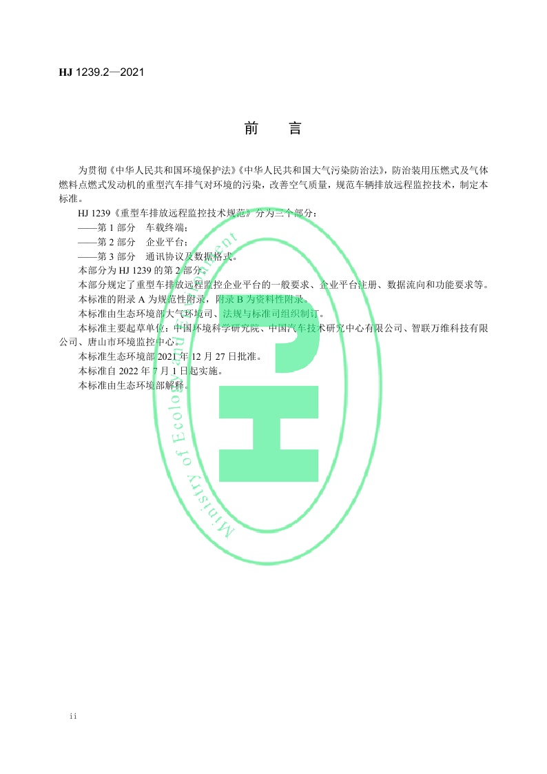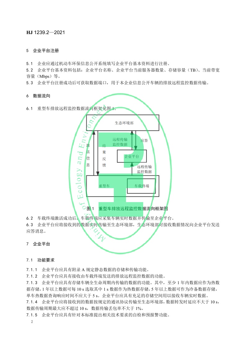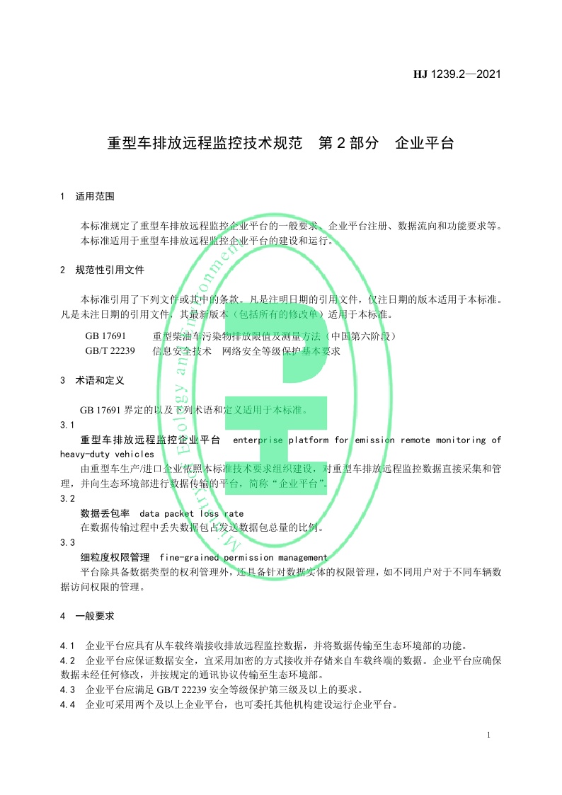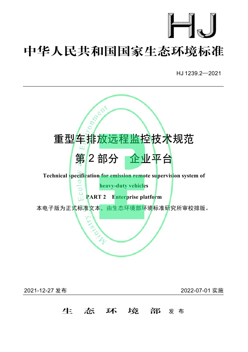 《重型车排放远程监控技术规范第2部分:企业平台》(HJ 1239.2—2021)