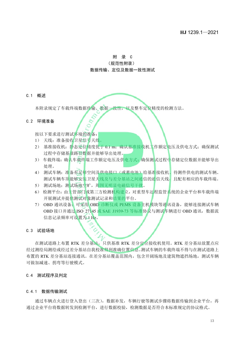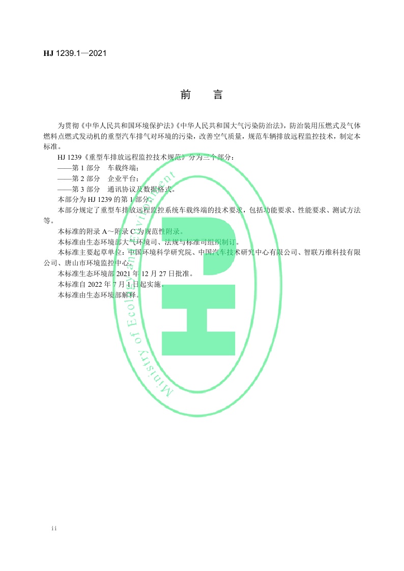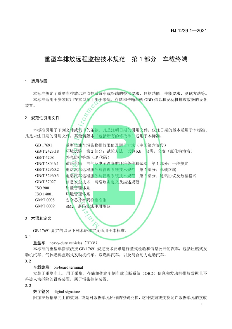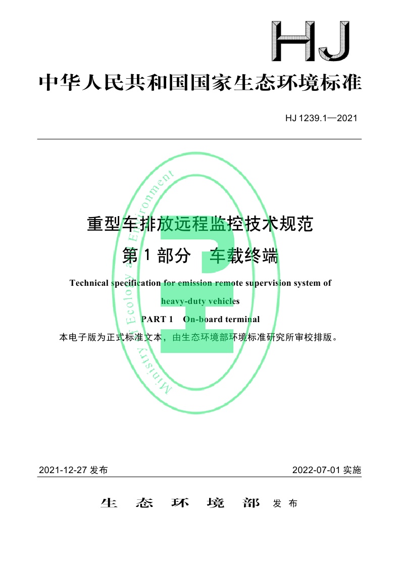 《重型车排放远程监控技术规范第1部分:车载终端》(HJ 1239.1—2021)