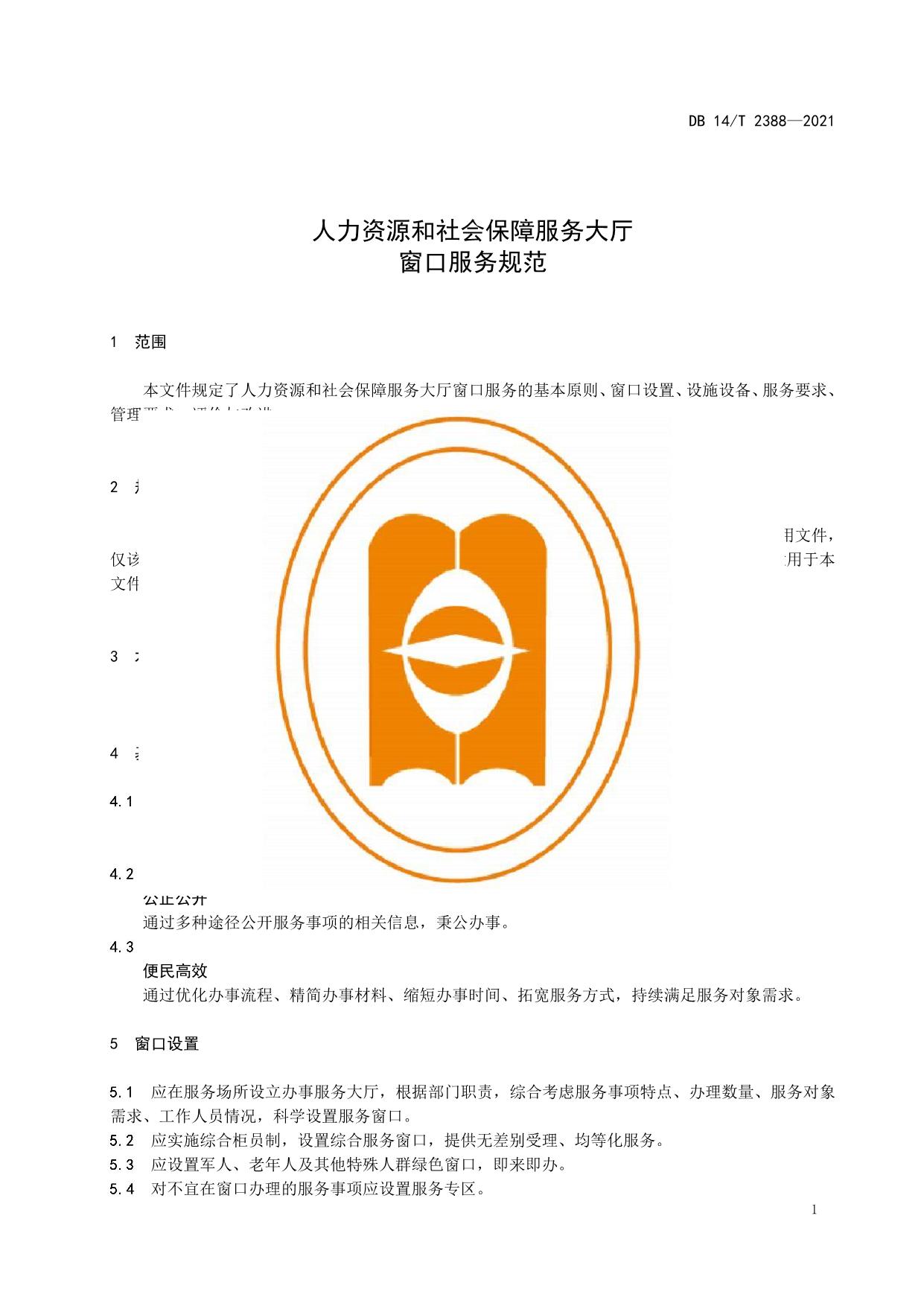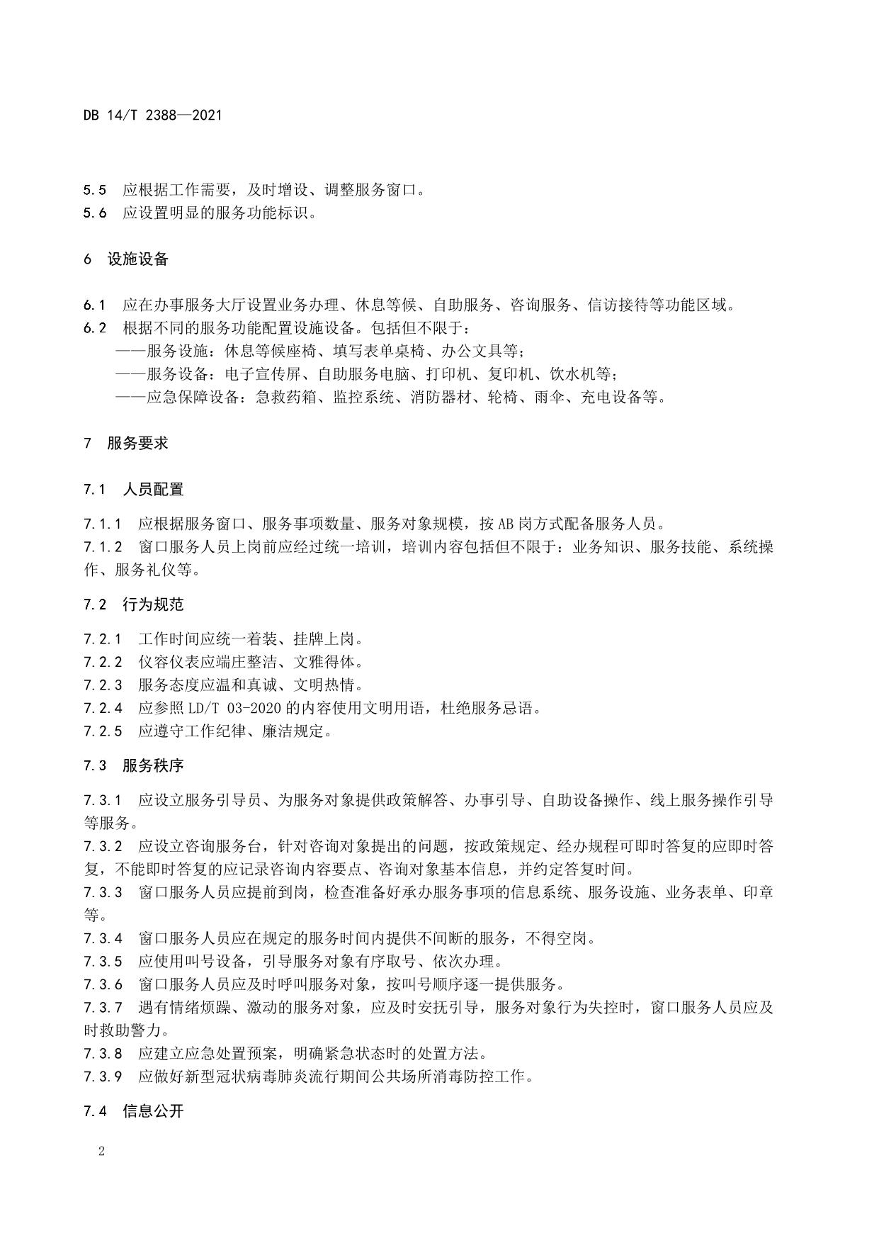 《人力资源和社会保障服务大厅窗口服务规范》(DB14/T 2388-2021)