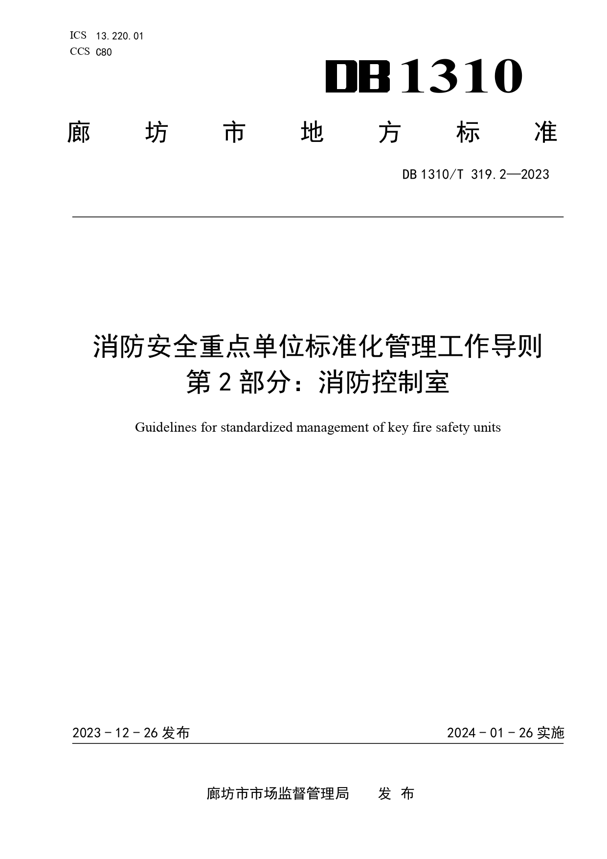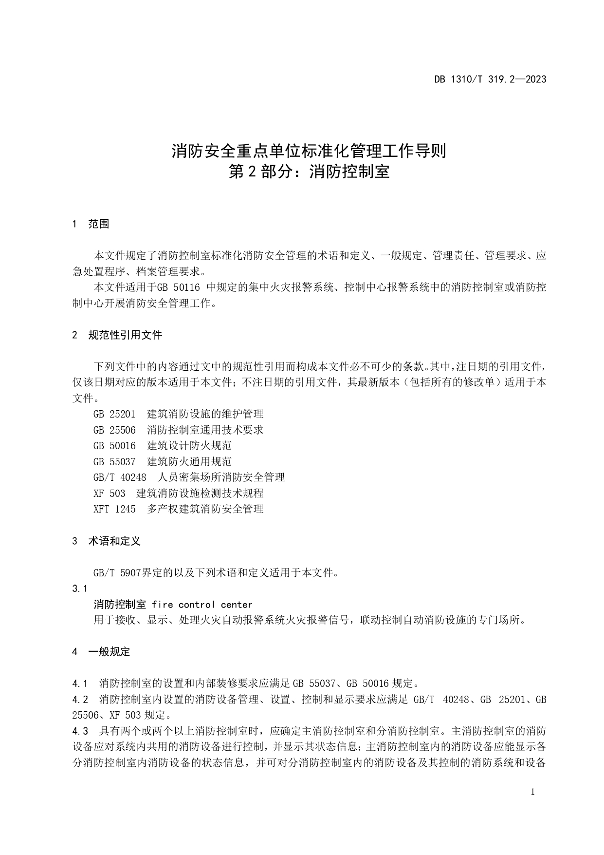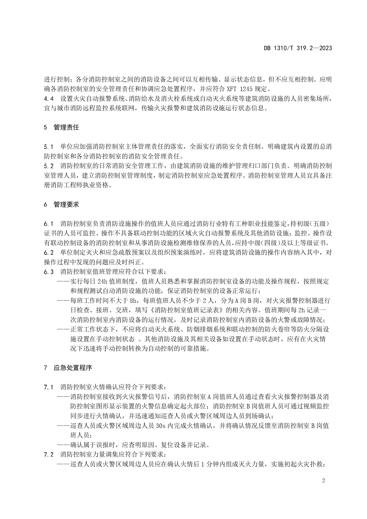 消防安全重点单位标准化管理工作导则 第2部分:消防控制室DB1310/T 319.2-2023