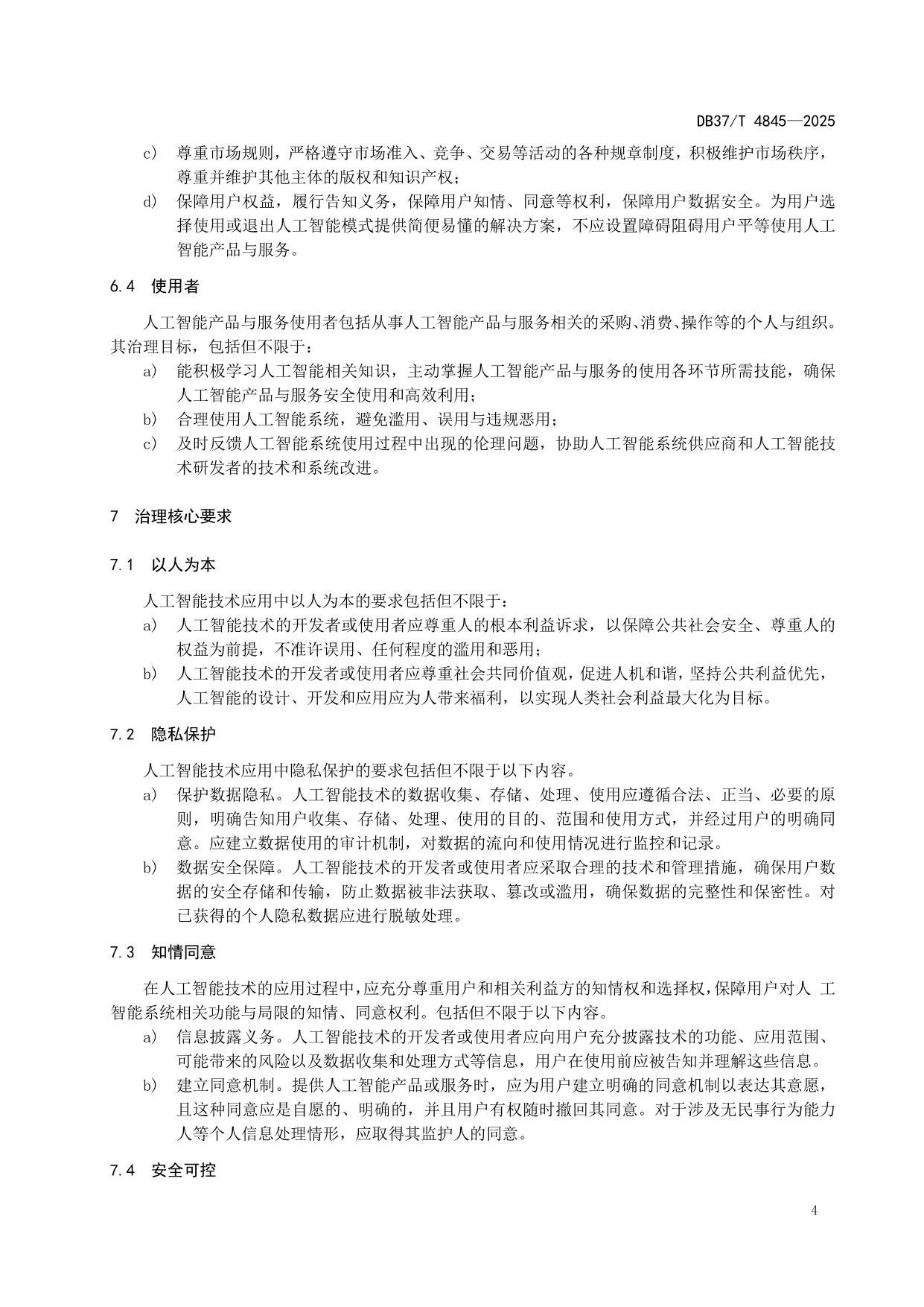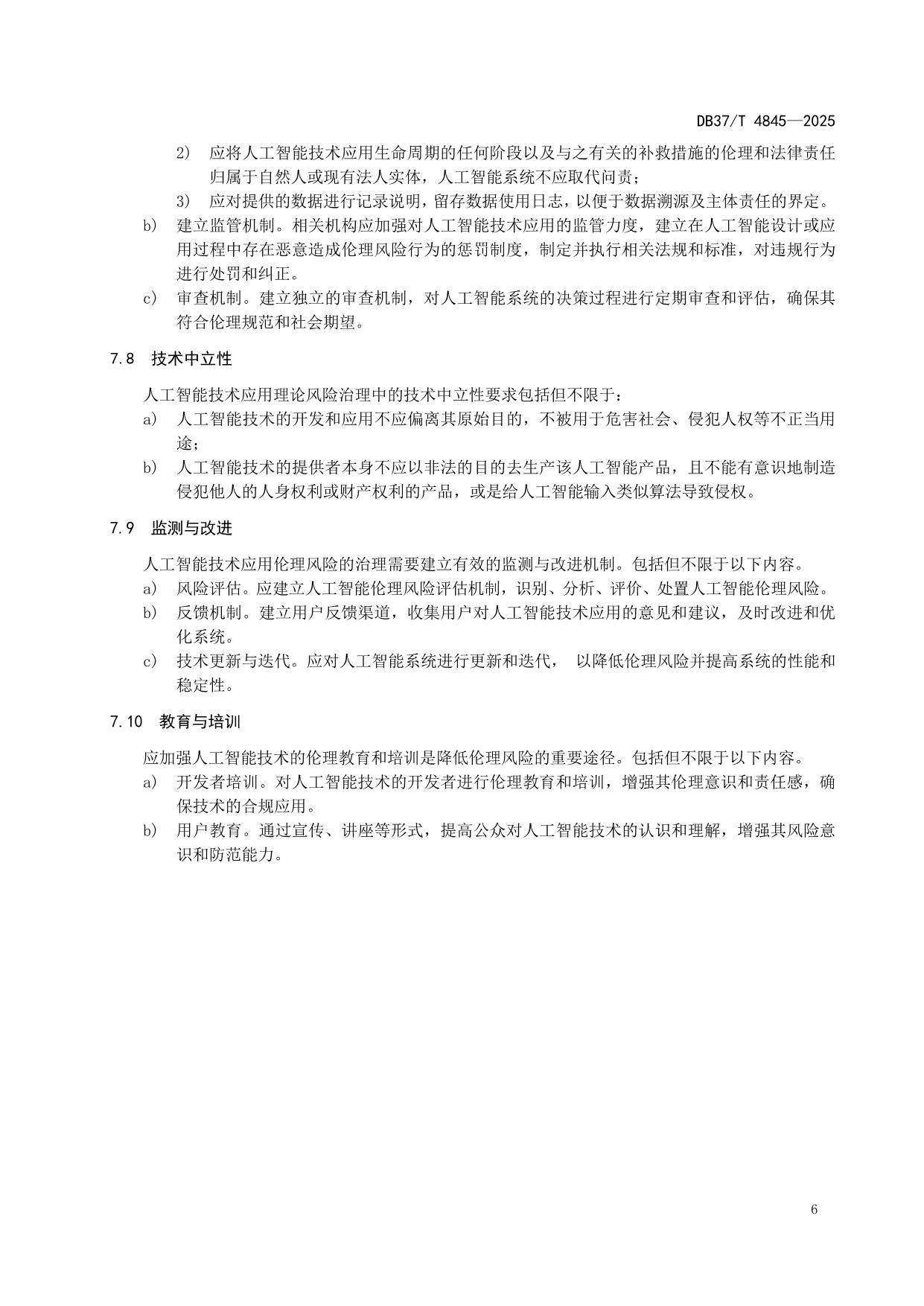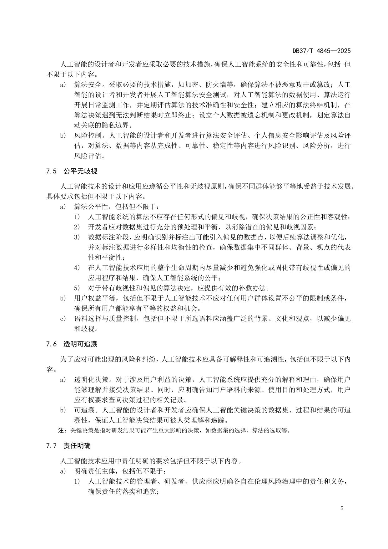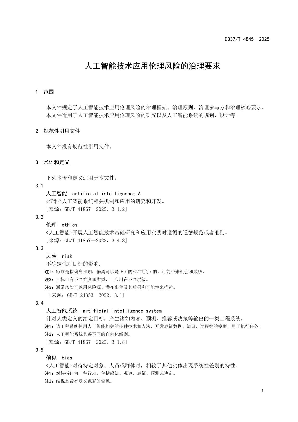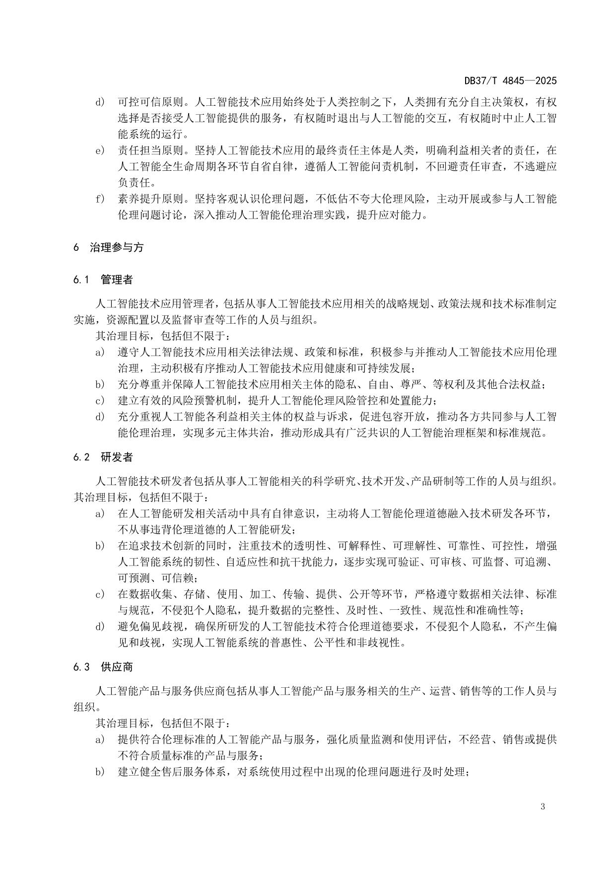 《人工智能技术应用伦理风险的治理要求》(DB37/T 4845—2025)