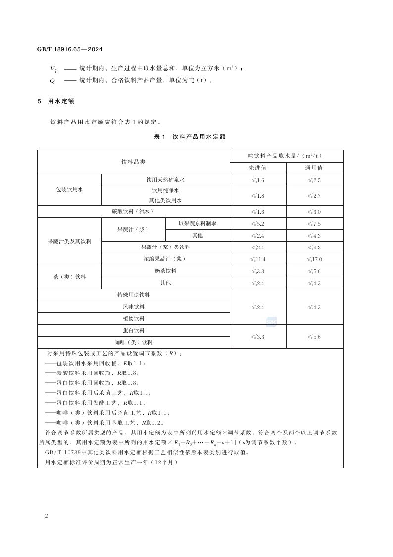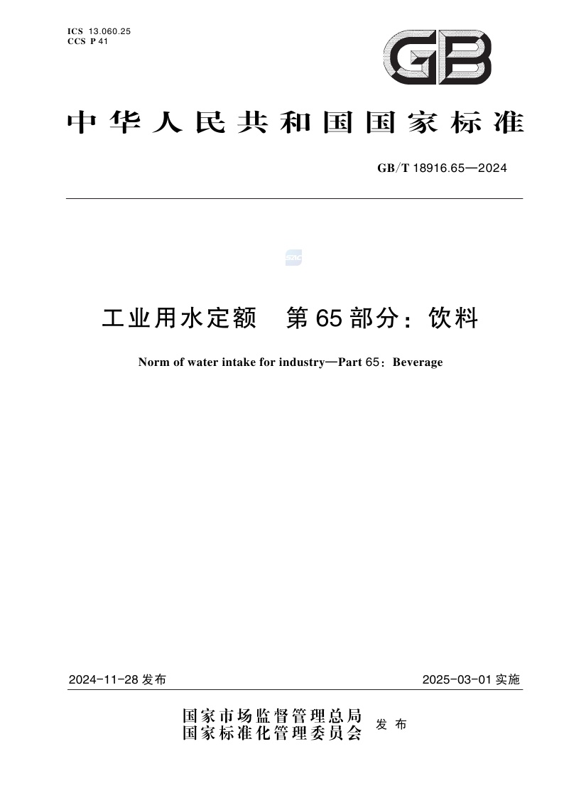《工业用水定额 第65部分:饮料》(GB/T 18916.65-2024)
