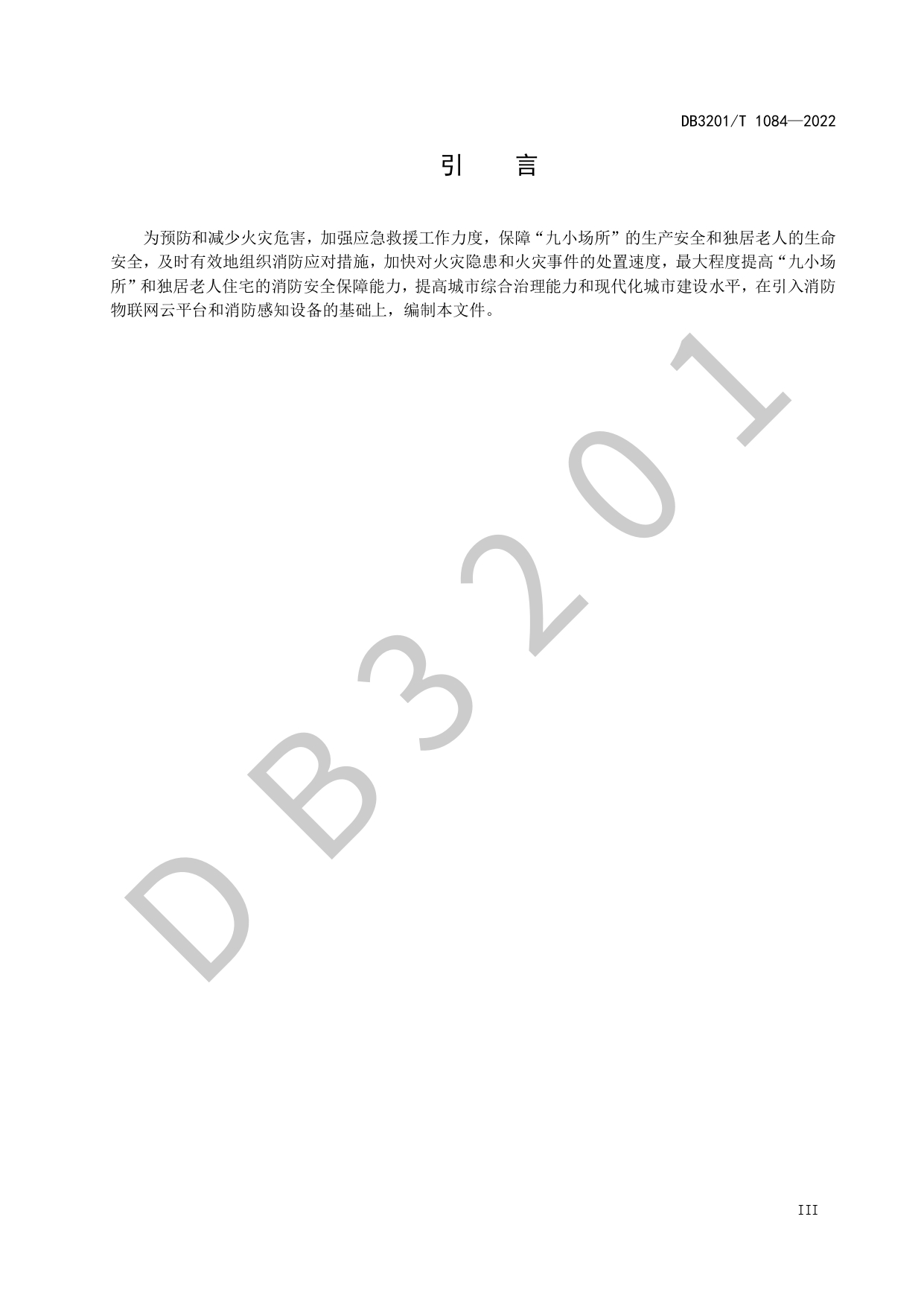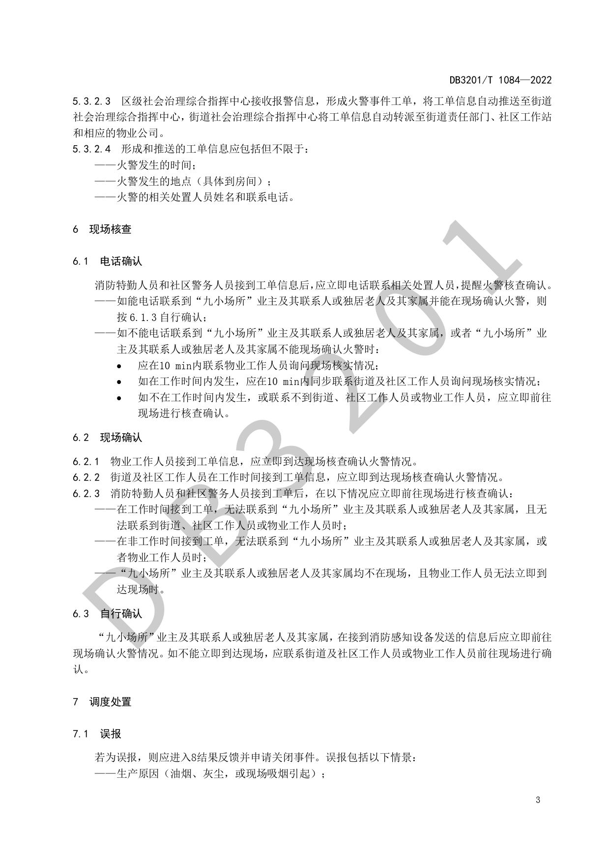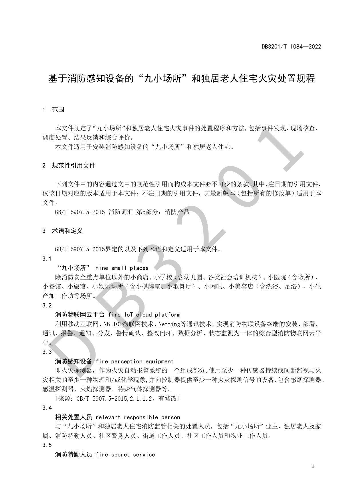 基于消防感知设备的“九小场所”和独居老人住宅火灾处置规程DB3201/T 1084—2022
