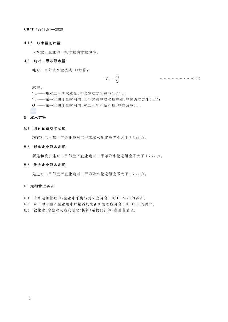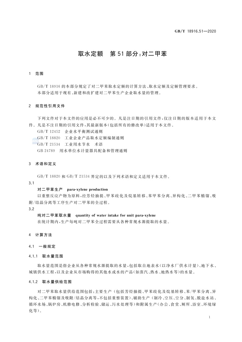 《取水定额 第51部分:对二甲苯》(GB/T 18916.51-2020)