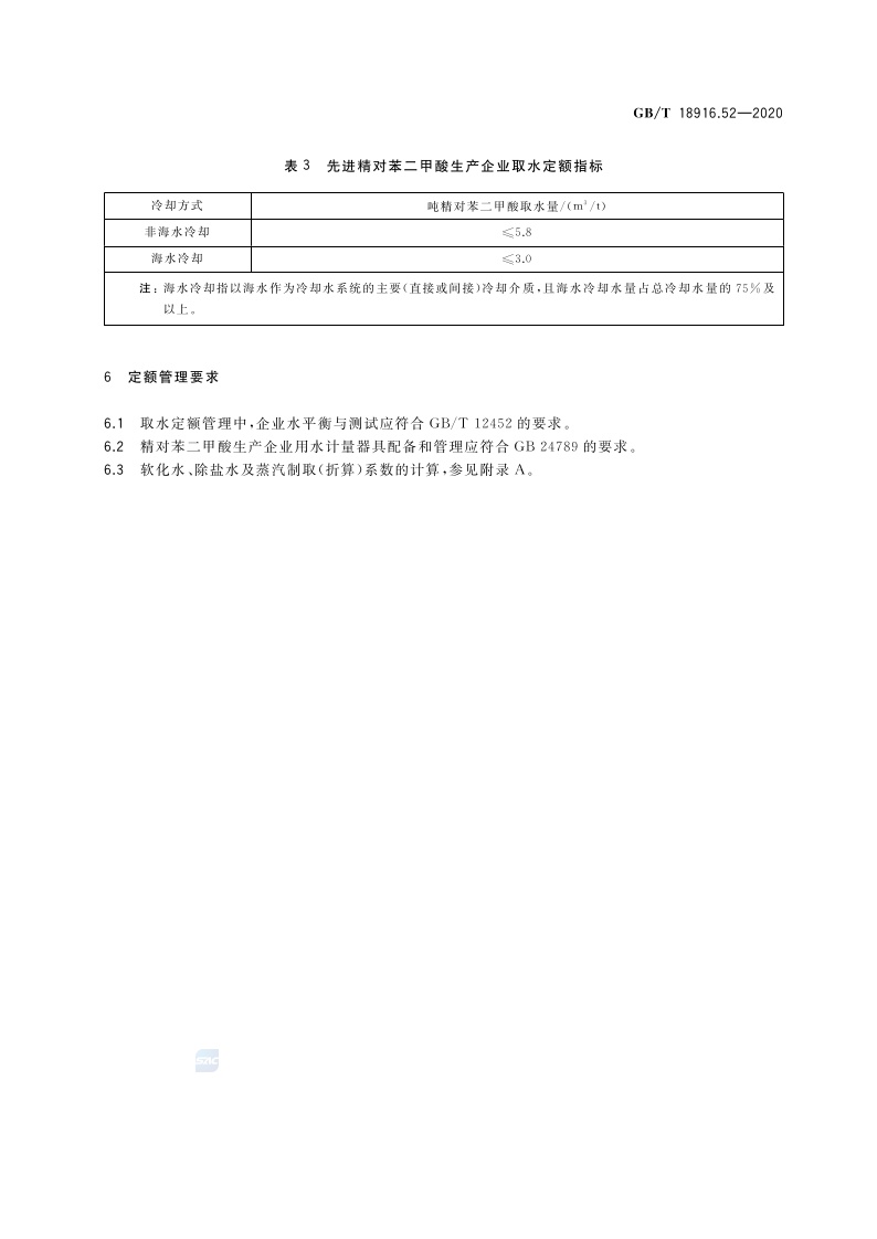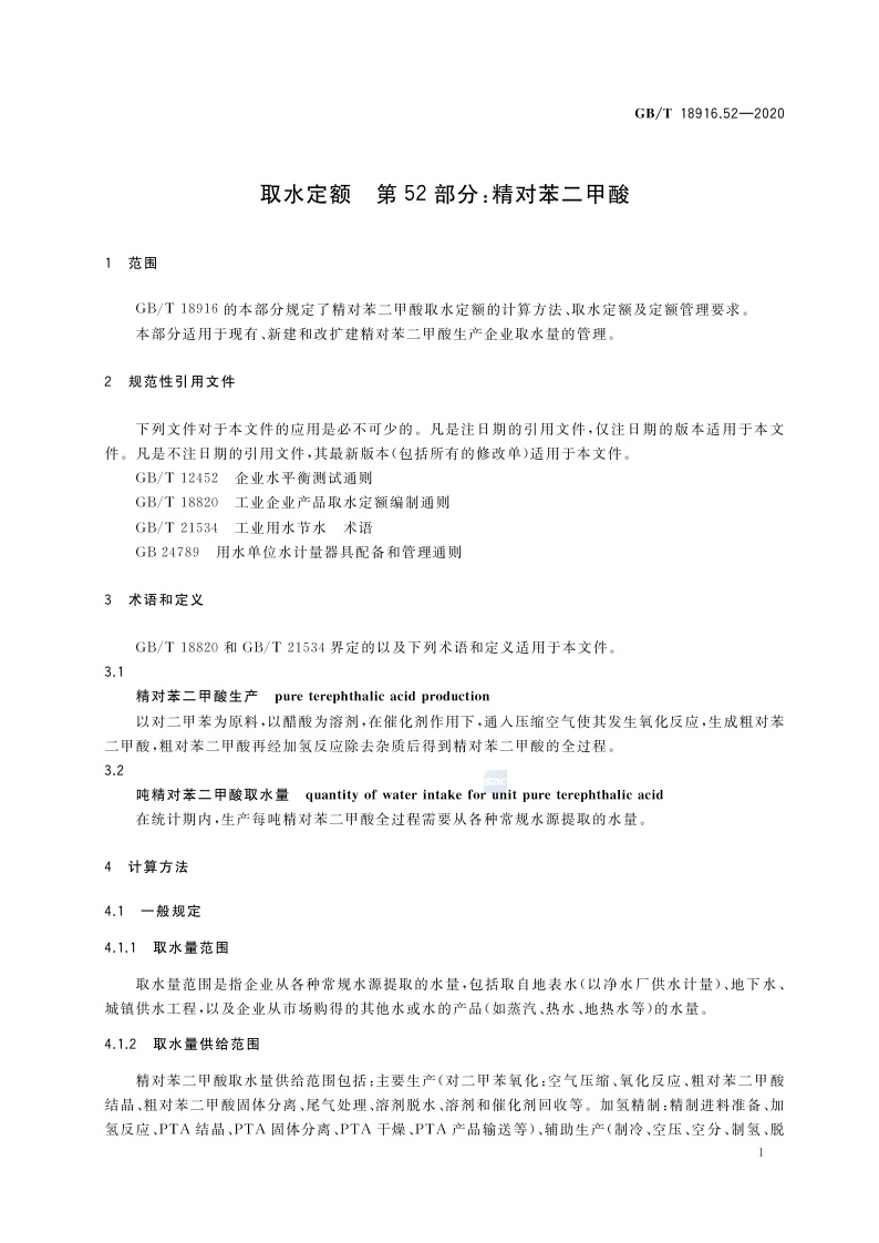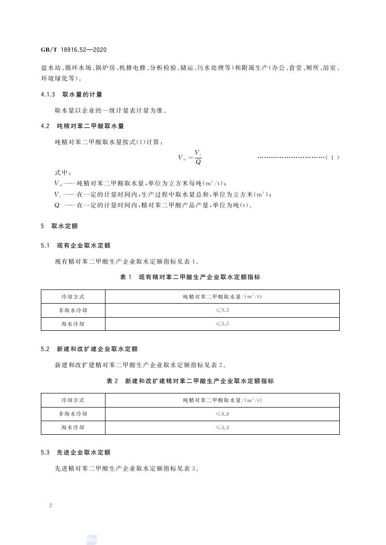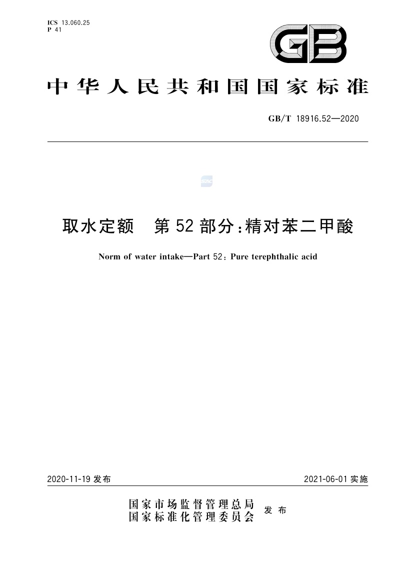 《取水定额 第52部分:精对苯二甲酸》(GB/T 18916.52-2020)