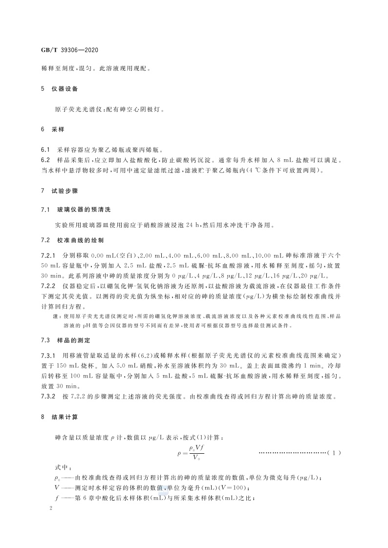 《再生水水质 总砷的测定 原子荧光光谱法》(GB/T 39306-2020)