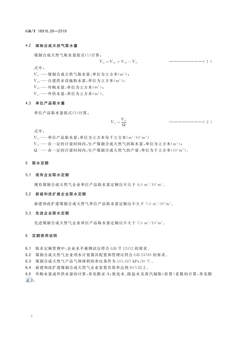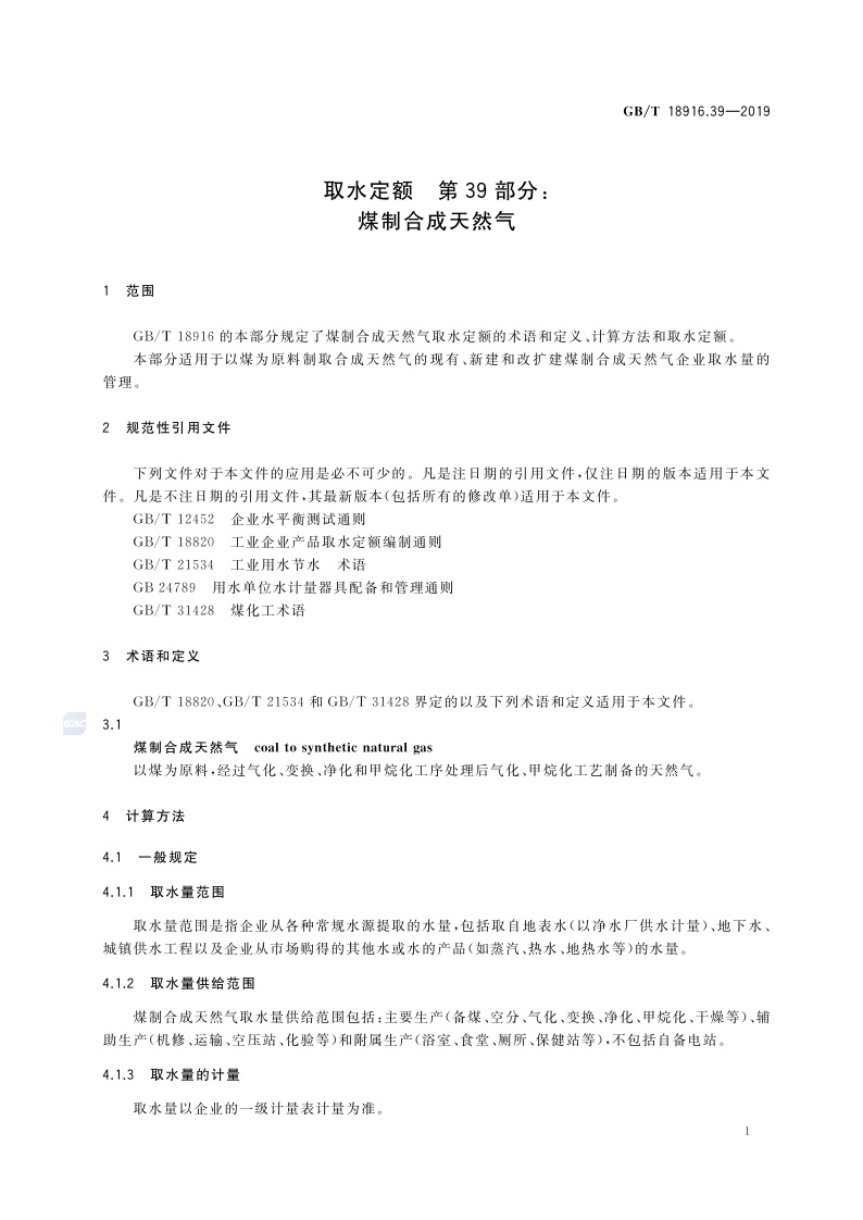 《取水定额 第39部分:煤制合成天然气》(GB/T 18916.39-2019)