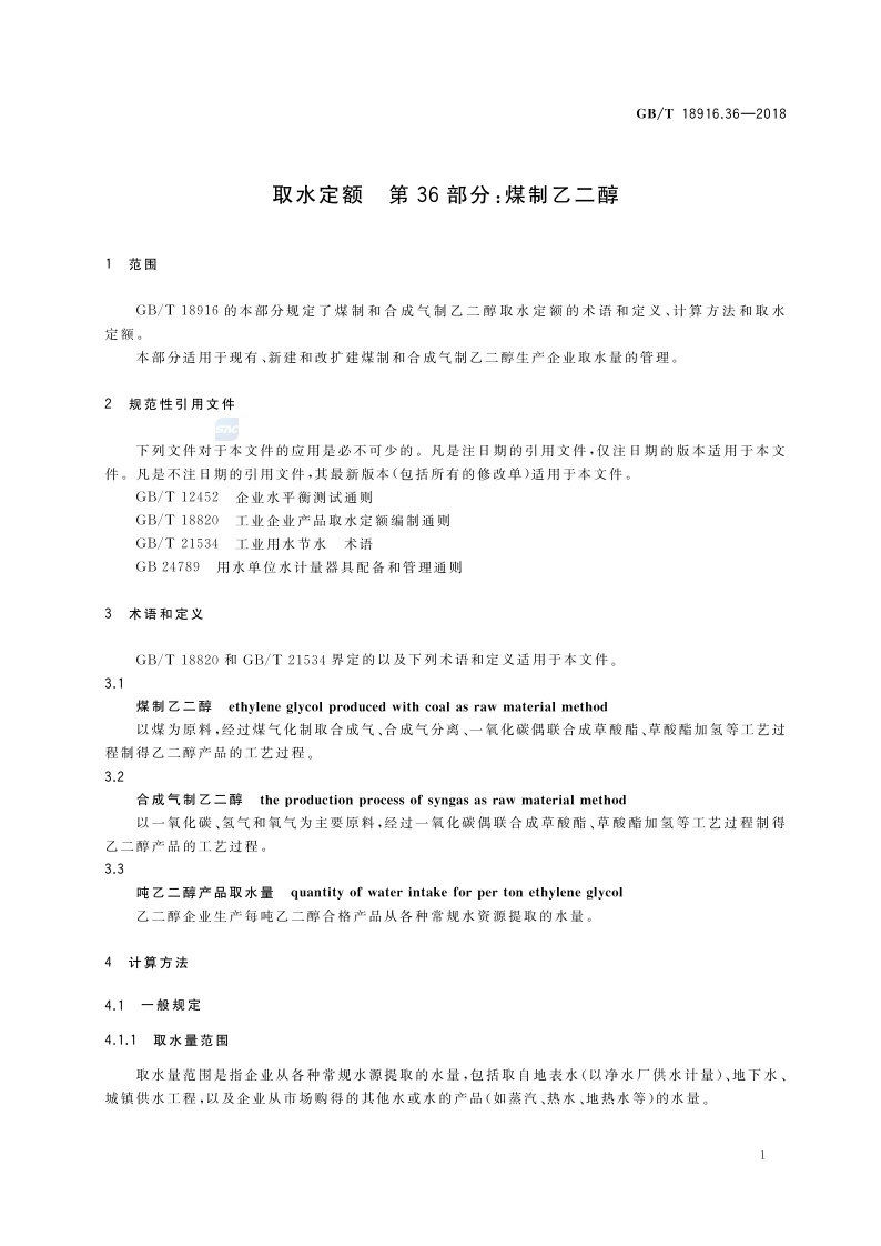 《取水定额 第36部分:煤制乙二醇》(GB/T 18916.36-2018)