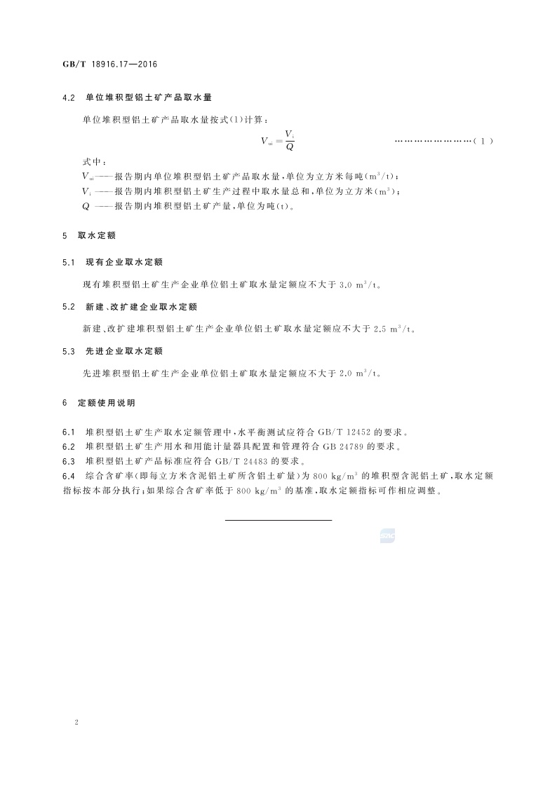 《取水定额 第17部分:堆积型铝土矿生产》(GB/T 18916.17-2016)