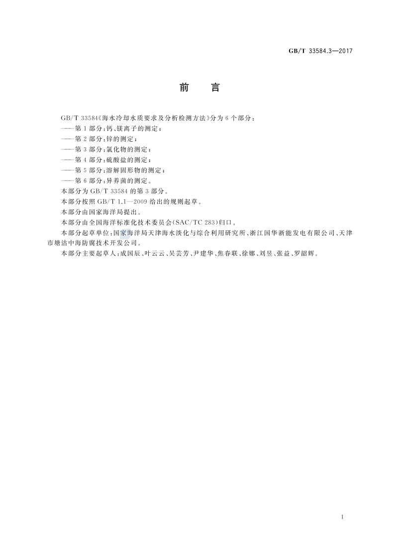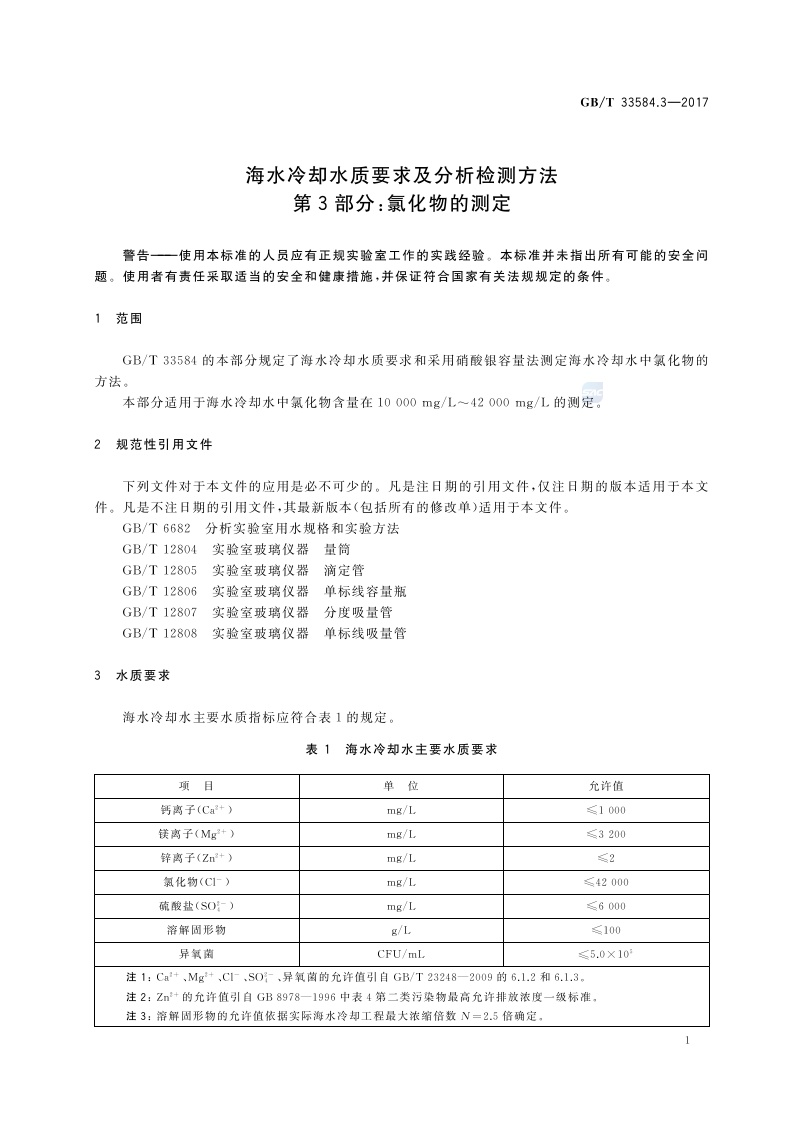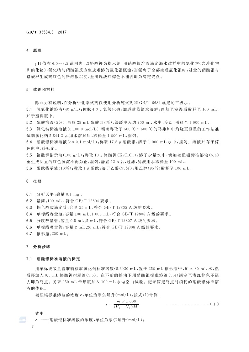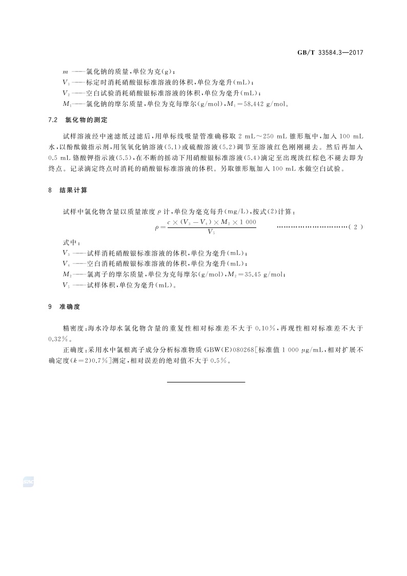《海水冷却水质要求及分析检测方法 第3部分:氯化物的测定》(GB/T 33584.3-2017)