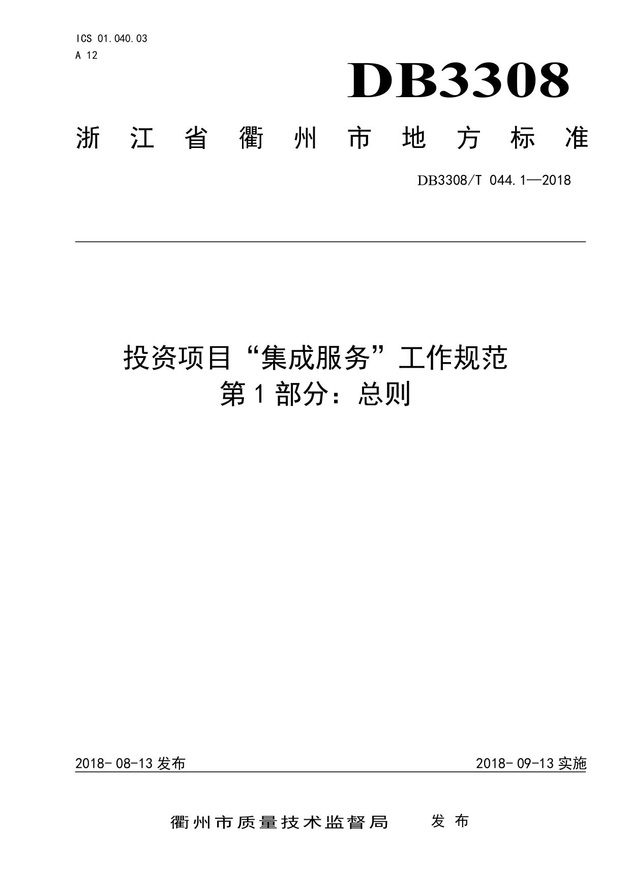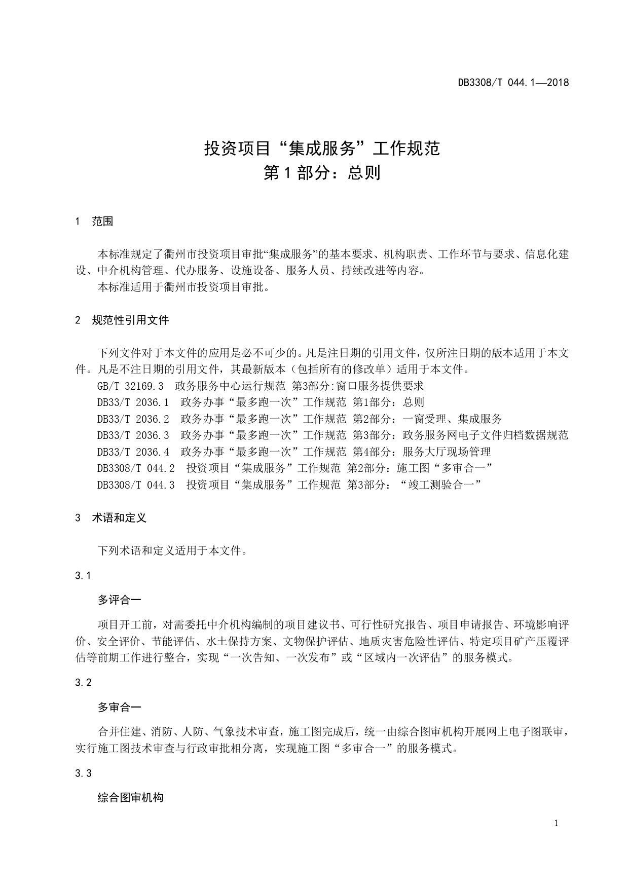 投资项目“集成服务”工作规范 第1部分:总则DB3308/T 044.1-2018