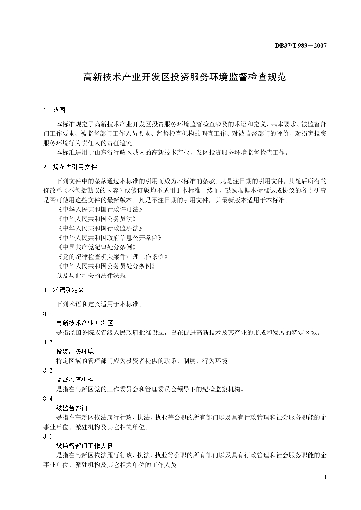高新技术产业开发区投资服务环境监督检查规范DB37/T 989-2007
