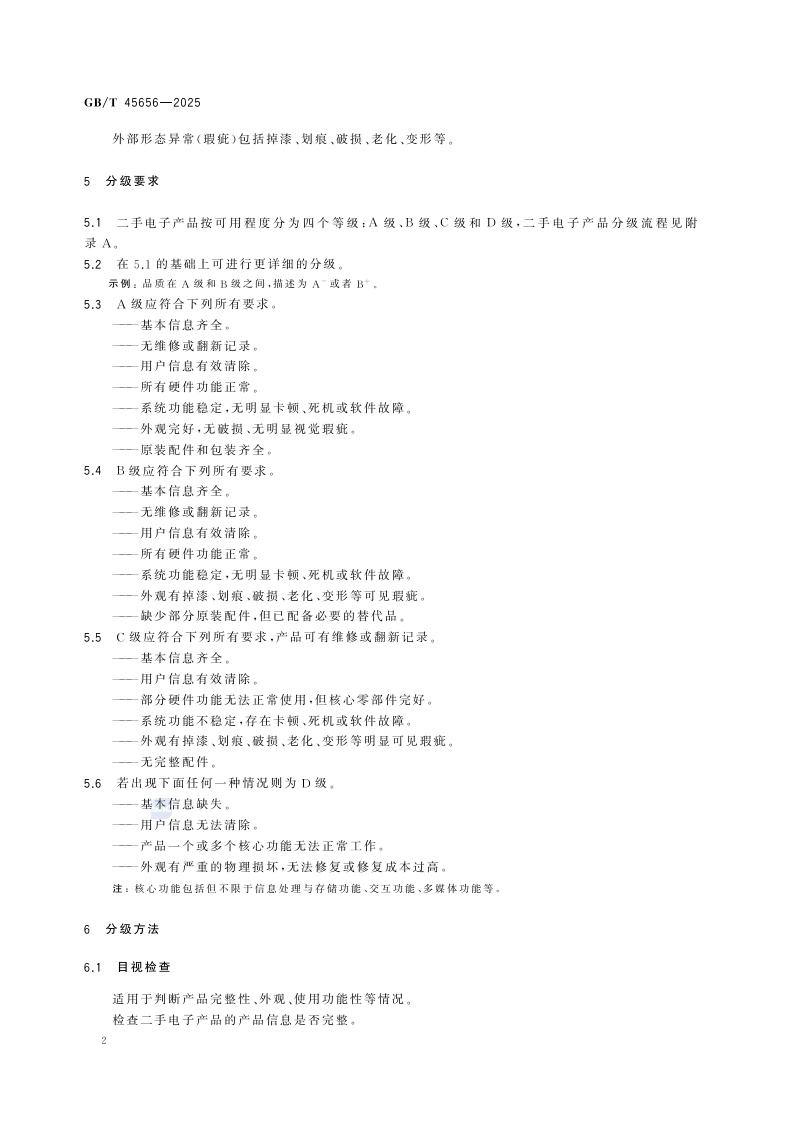 《二手电子产品可用程度分级规范》(GB/T 45656-2025)