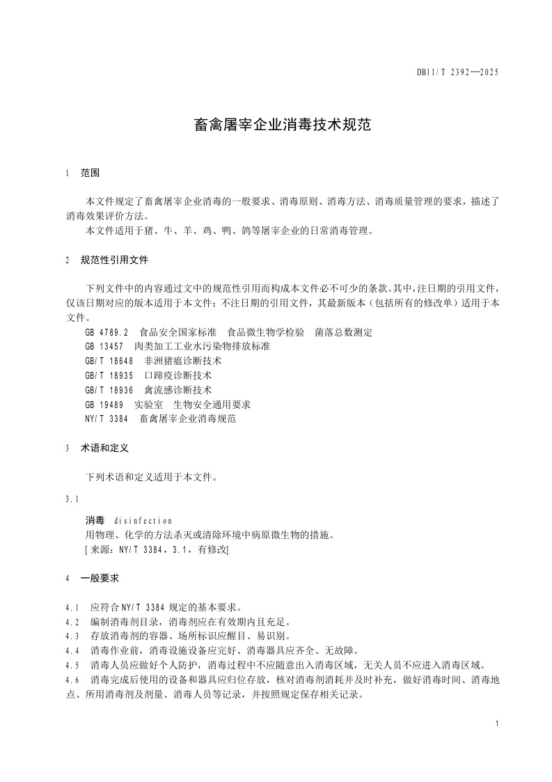 北京市《畜禽屠宰企业消毒技术规范》(DB11/T 2392-2025)