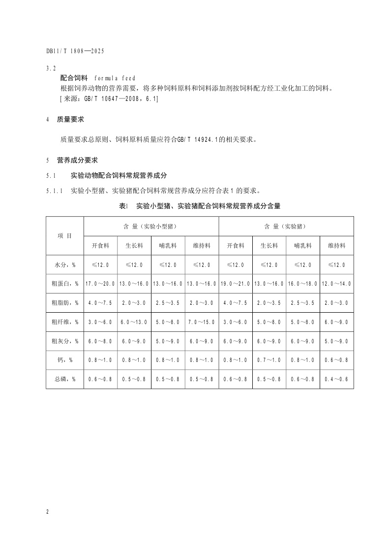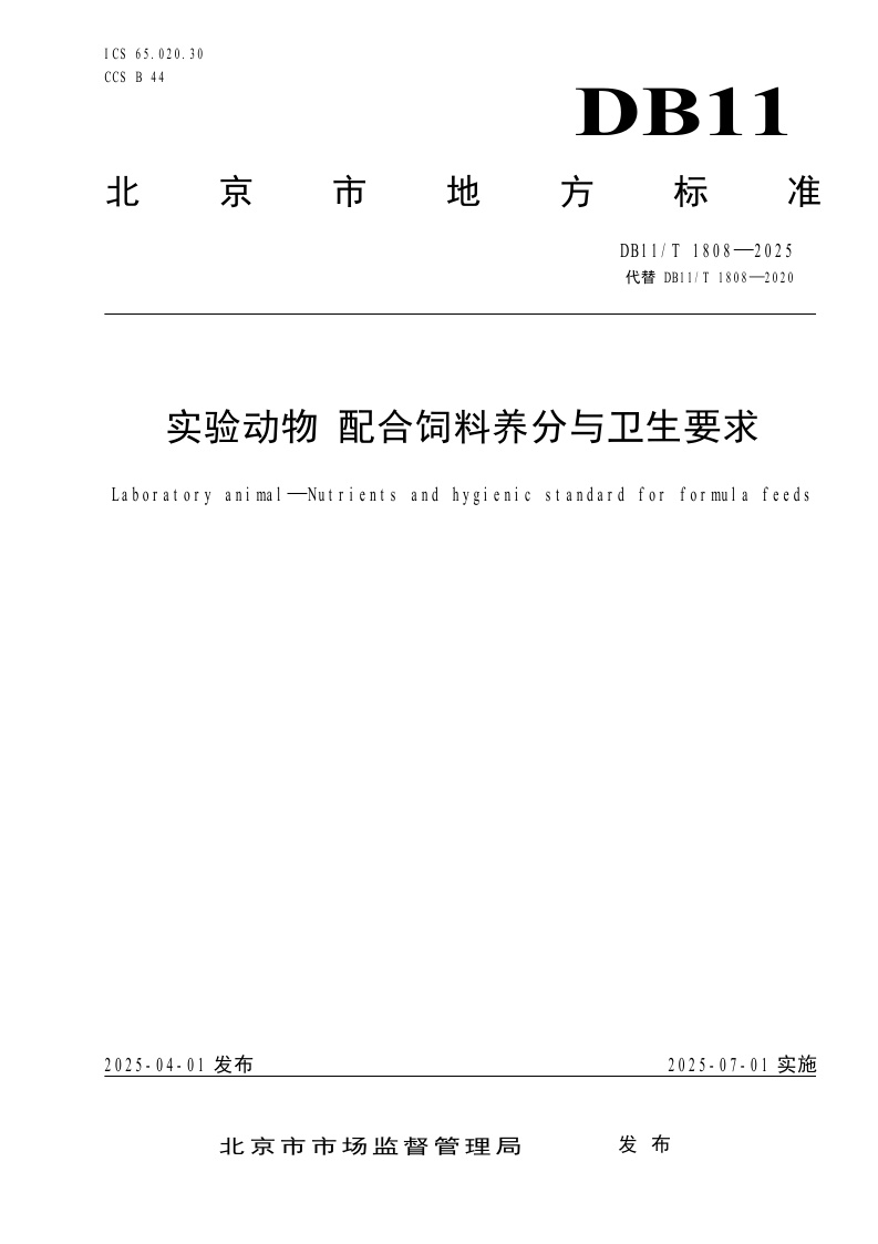 北京市《实验动物 配合饲料养分与卫生要求》(DB11/T 1808-2025)
