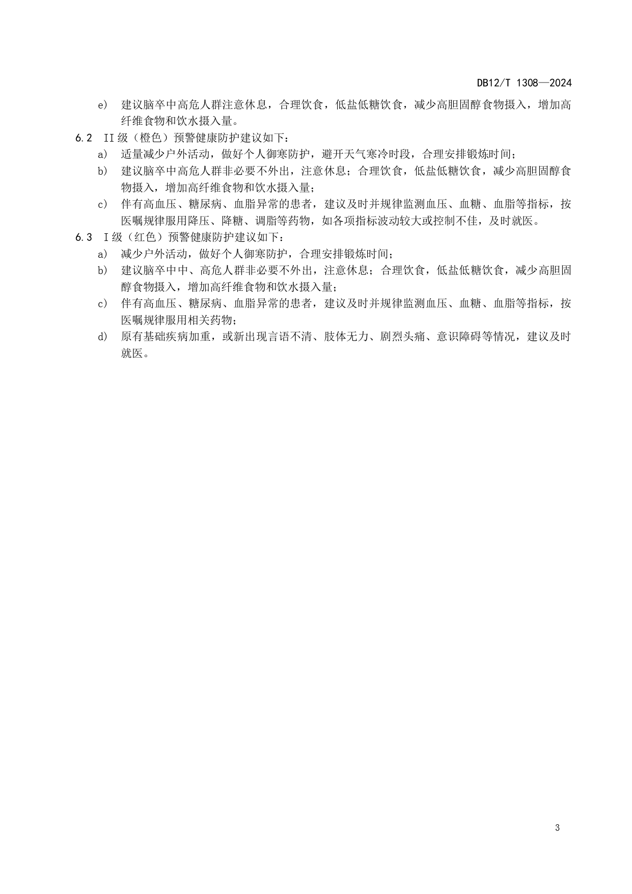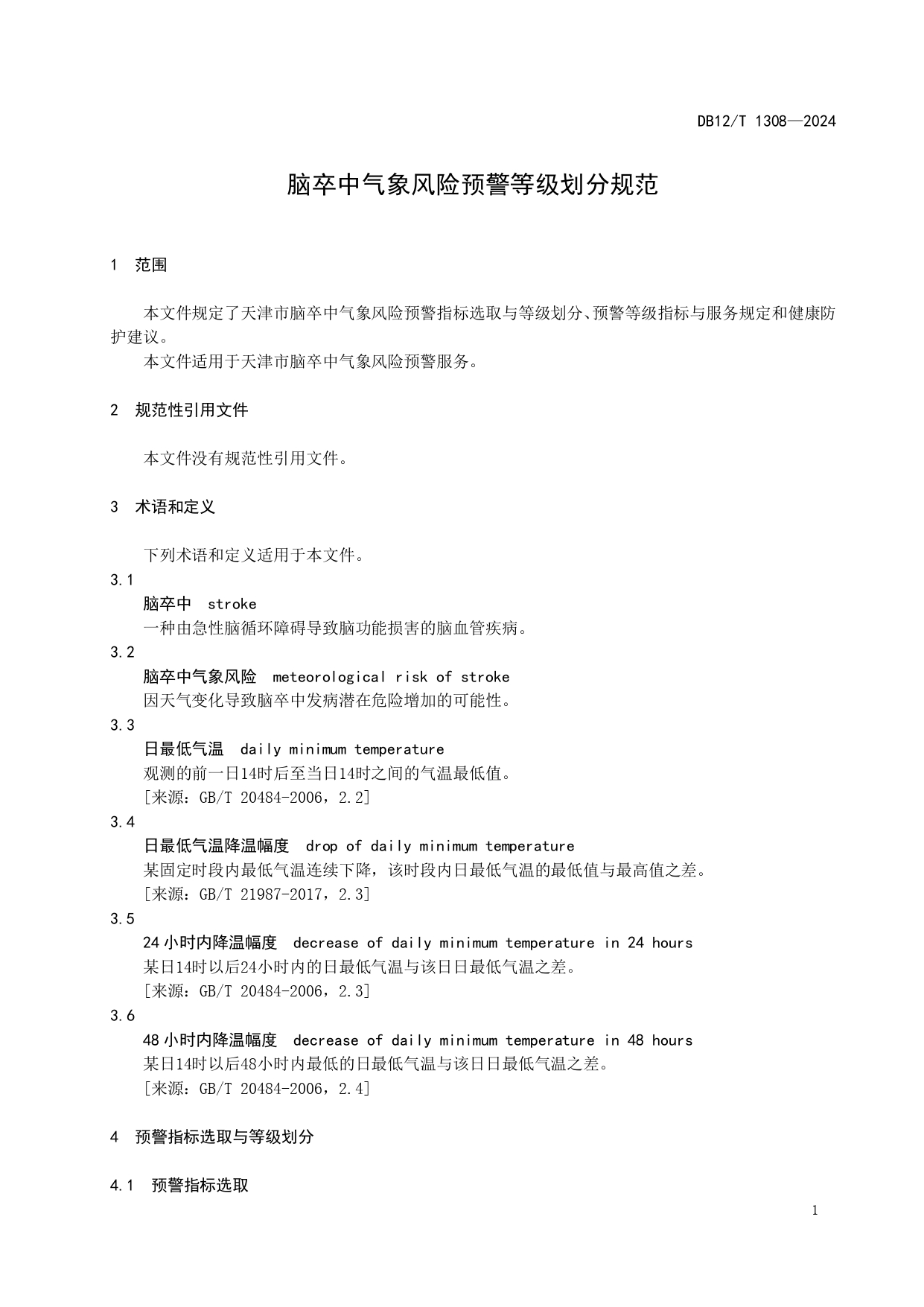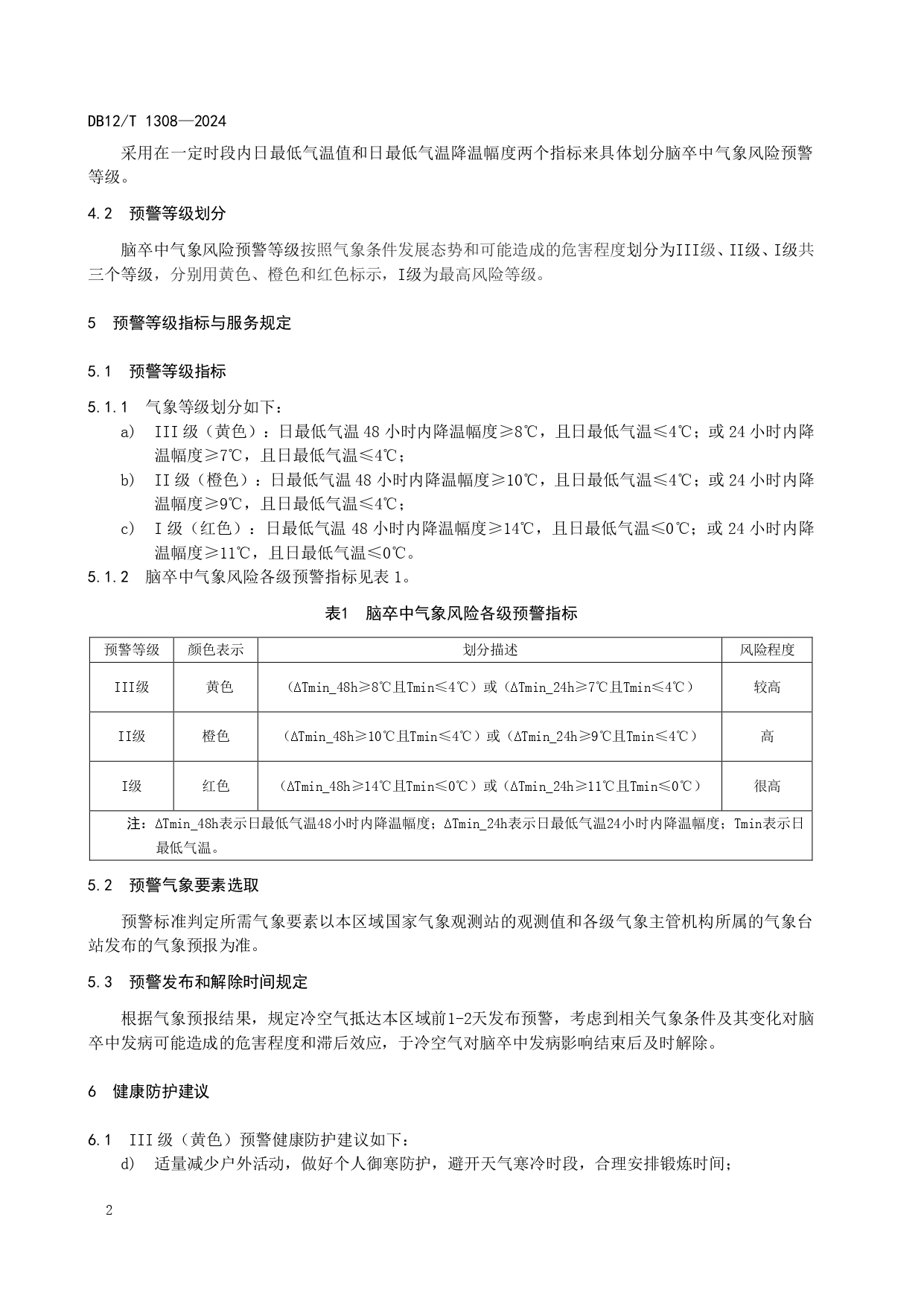 脑卒中气象风险预警等级划分规范DB12/T 1308-2024