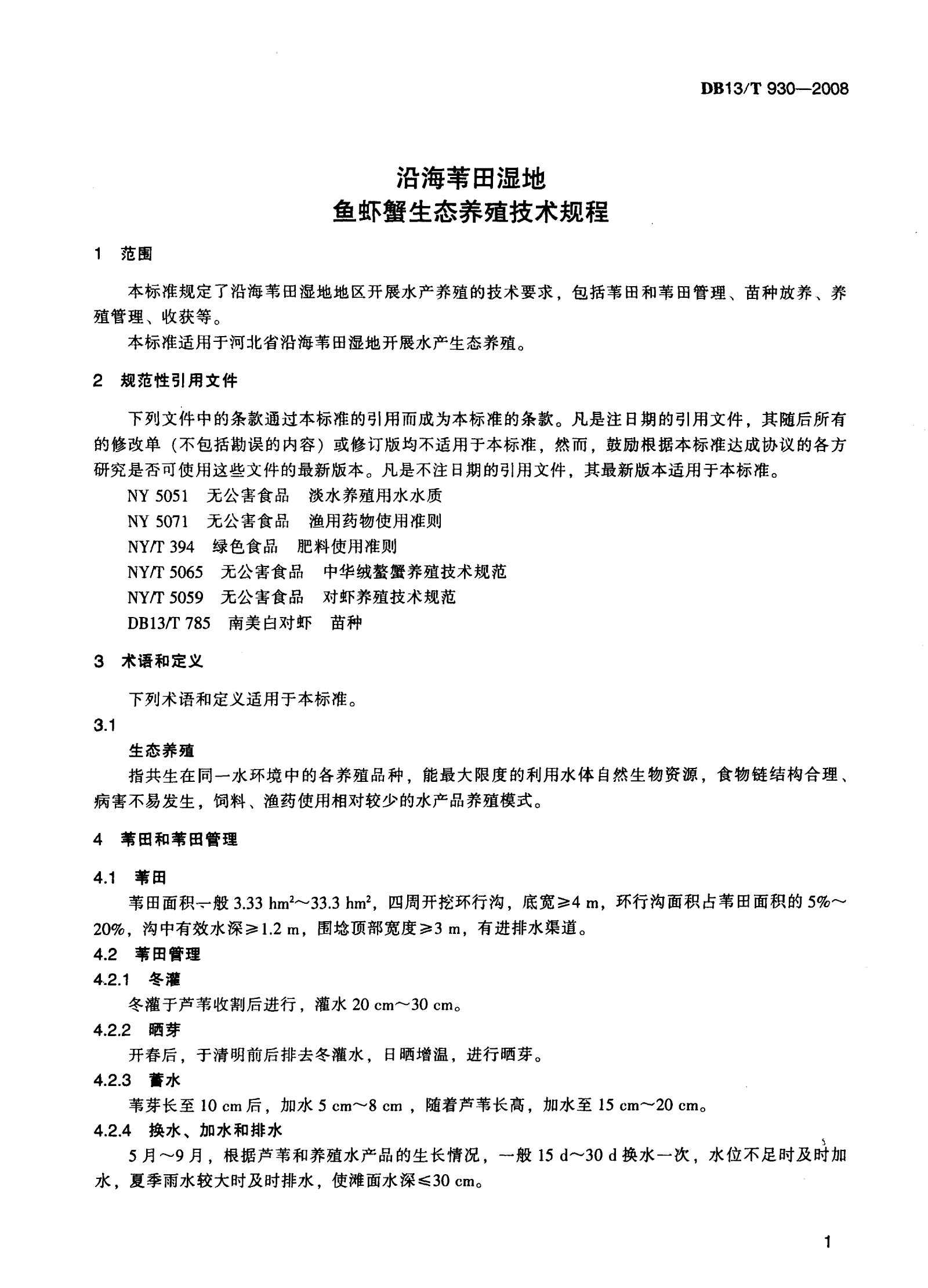 河北省沿海苇田湿地鱼虾蟹生态养殖技术规程