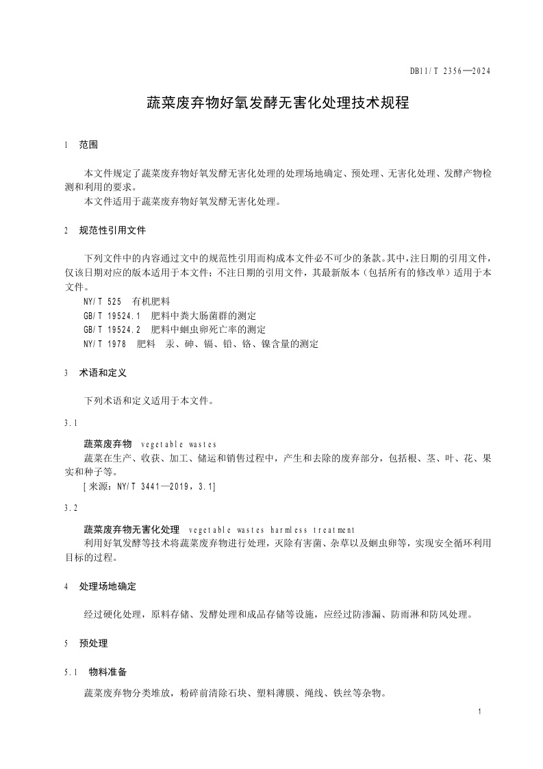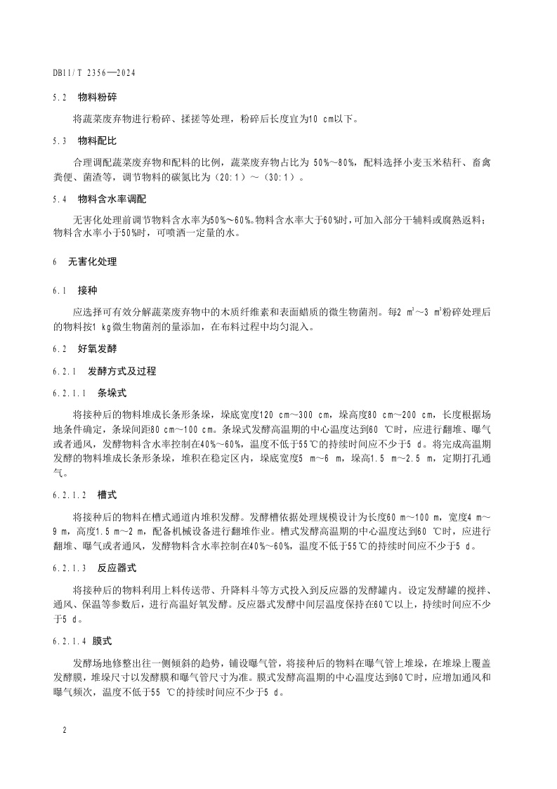 北京市《蔬菜废弃物好氧发酵无害化处理技术规程》(DB11/T 2356-2024)