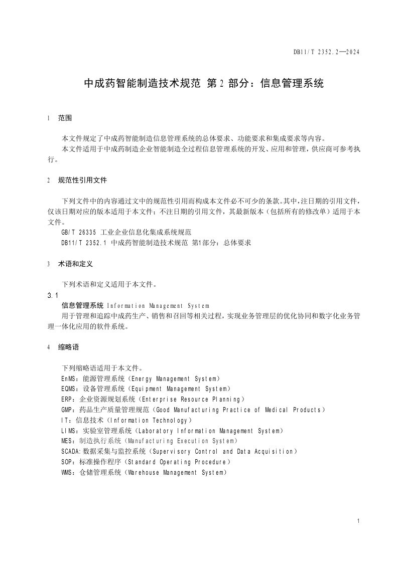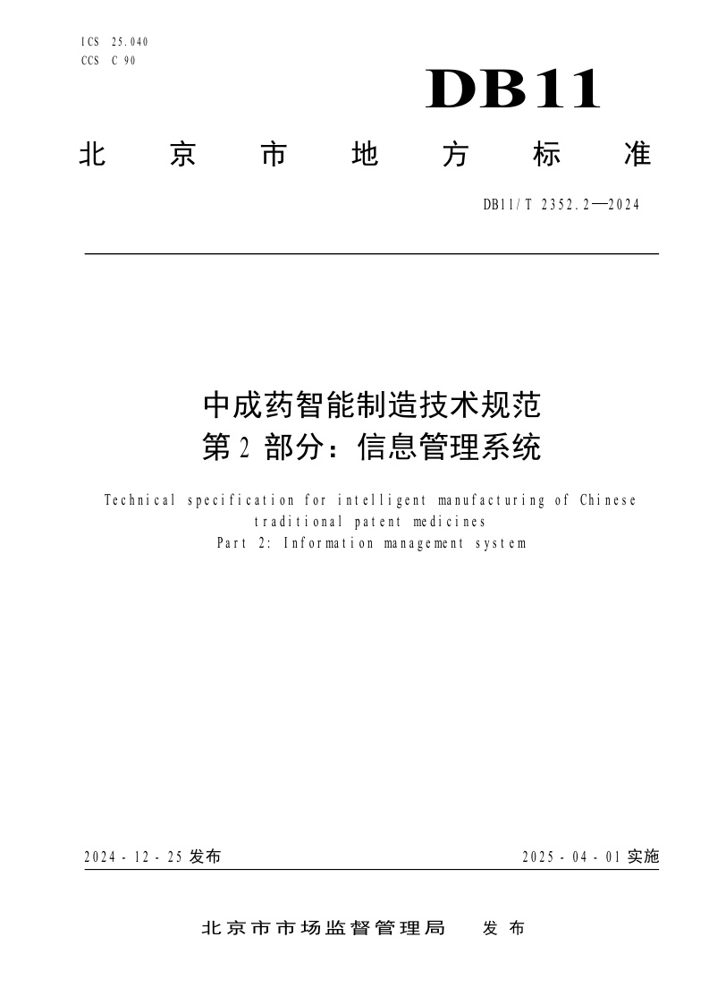 北京市《中成药智能制造技术规范 第2部分:信息管理系统》(DB11/T 2352.2-2024)