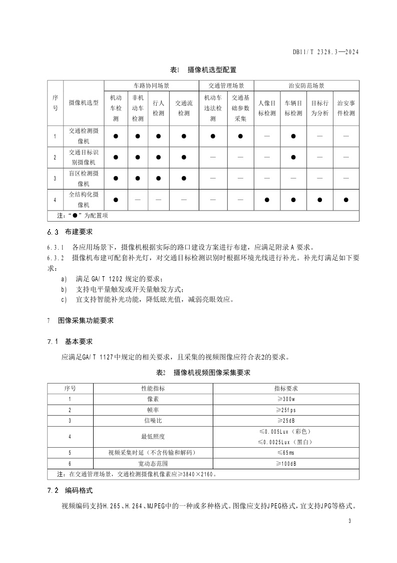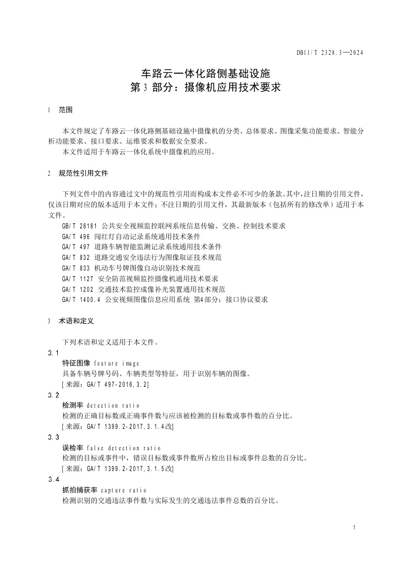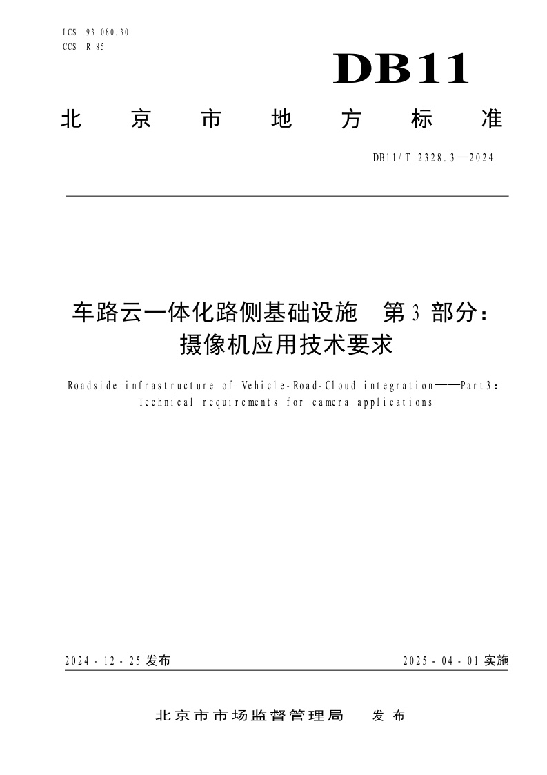 北京市《车路云一体化路侧基础设施 第3部分:摄像机应用技术要求》(DB11/T 2328.3-2024)