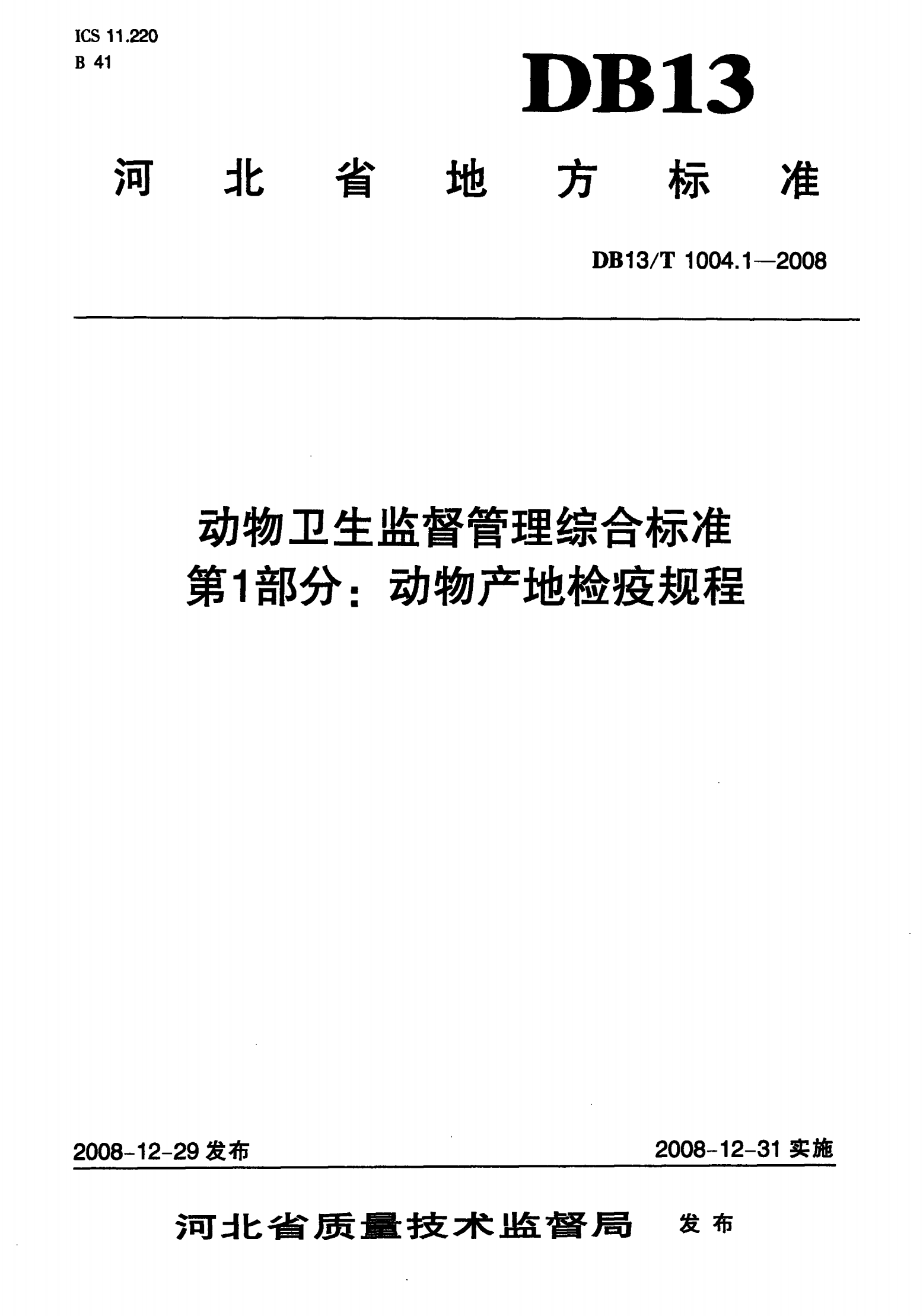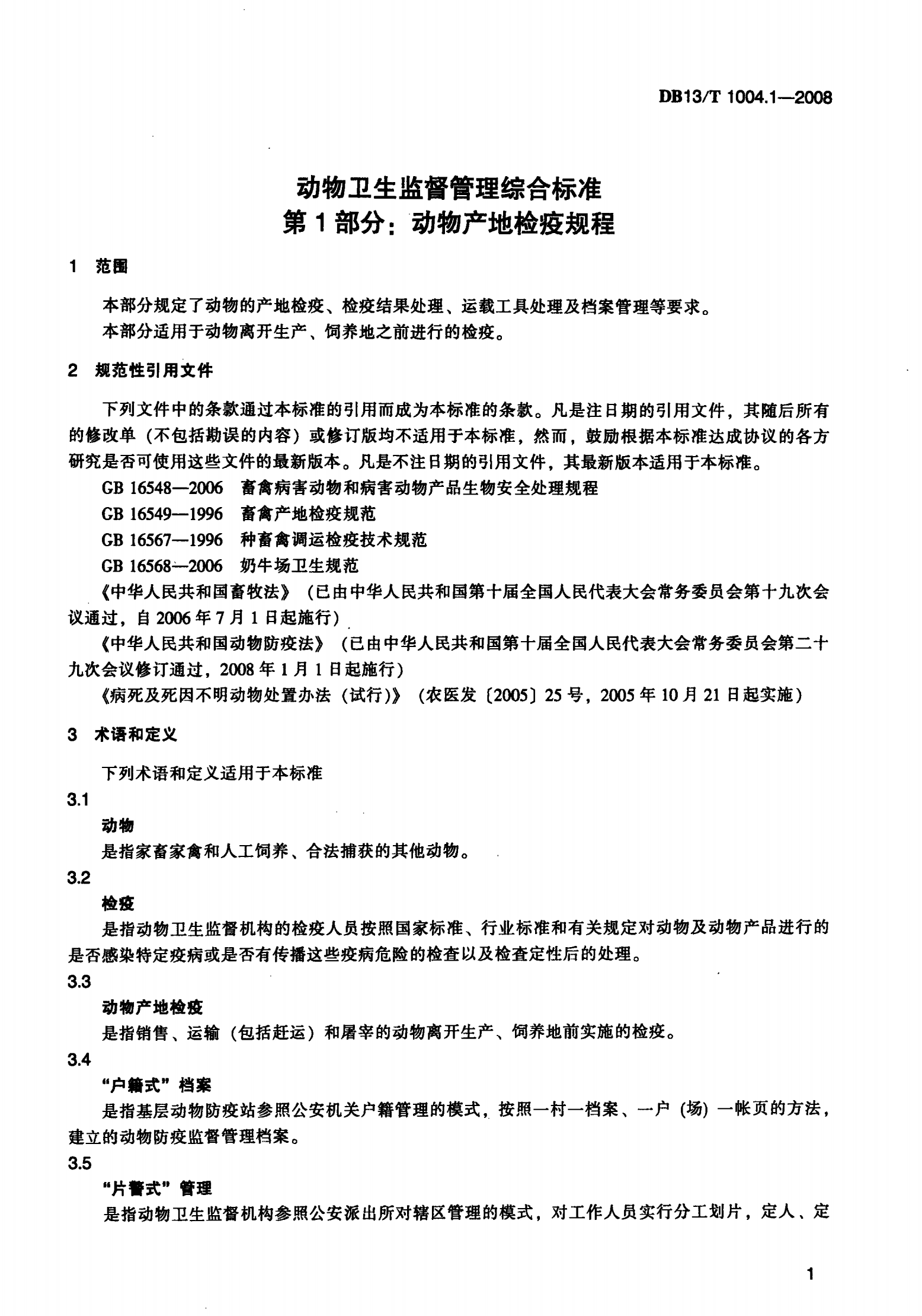 河北省动物卫生监督管理综合标准 第1部分: 动物产地检疫规程