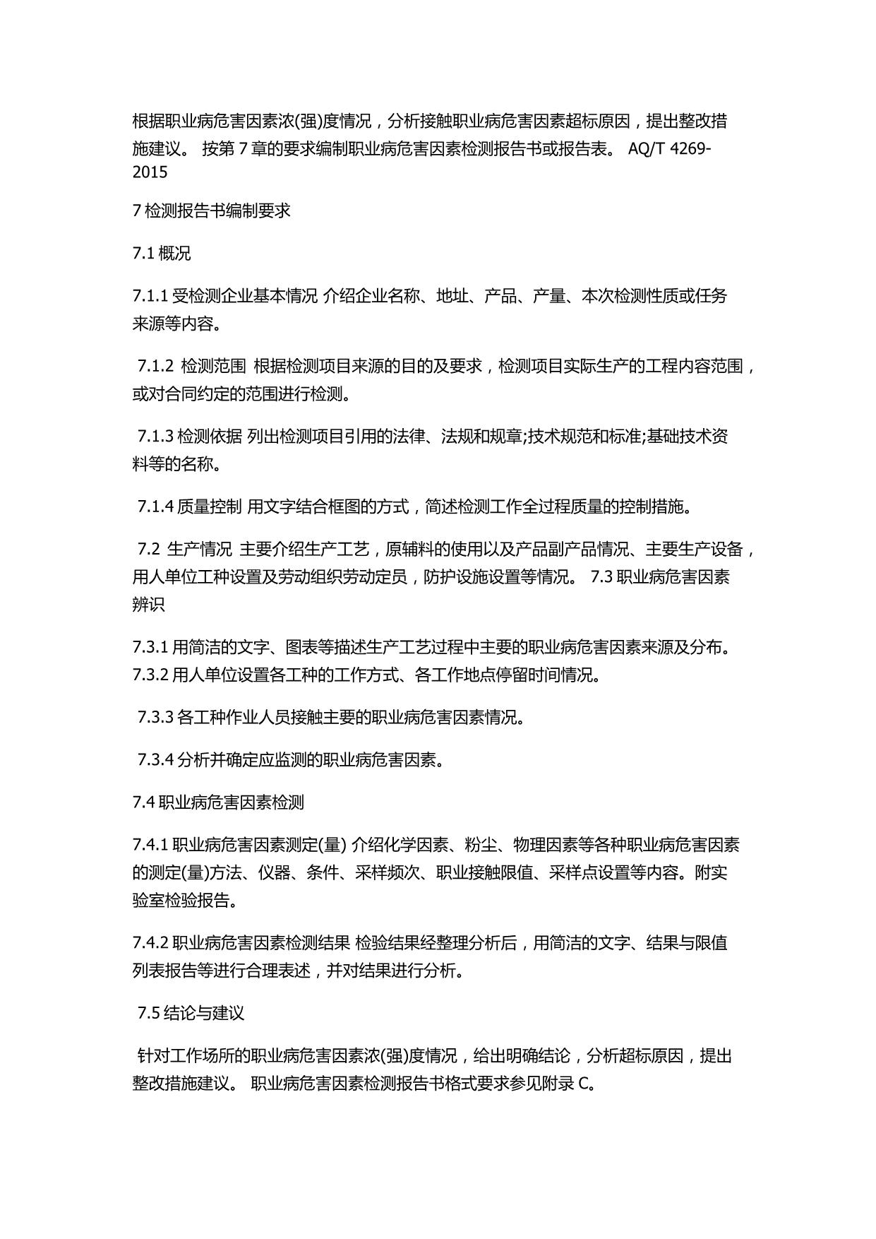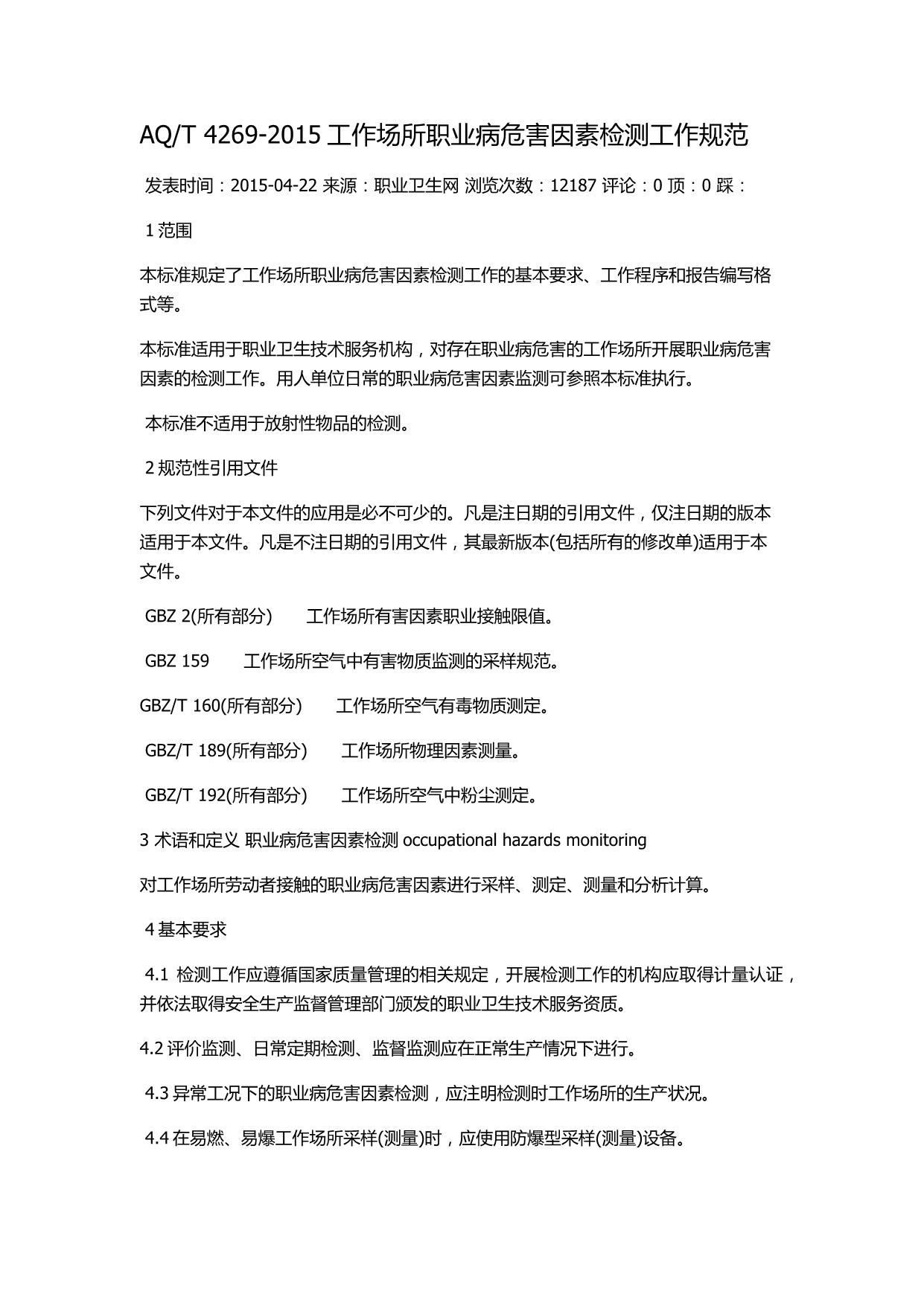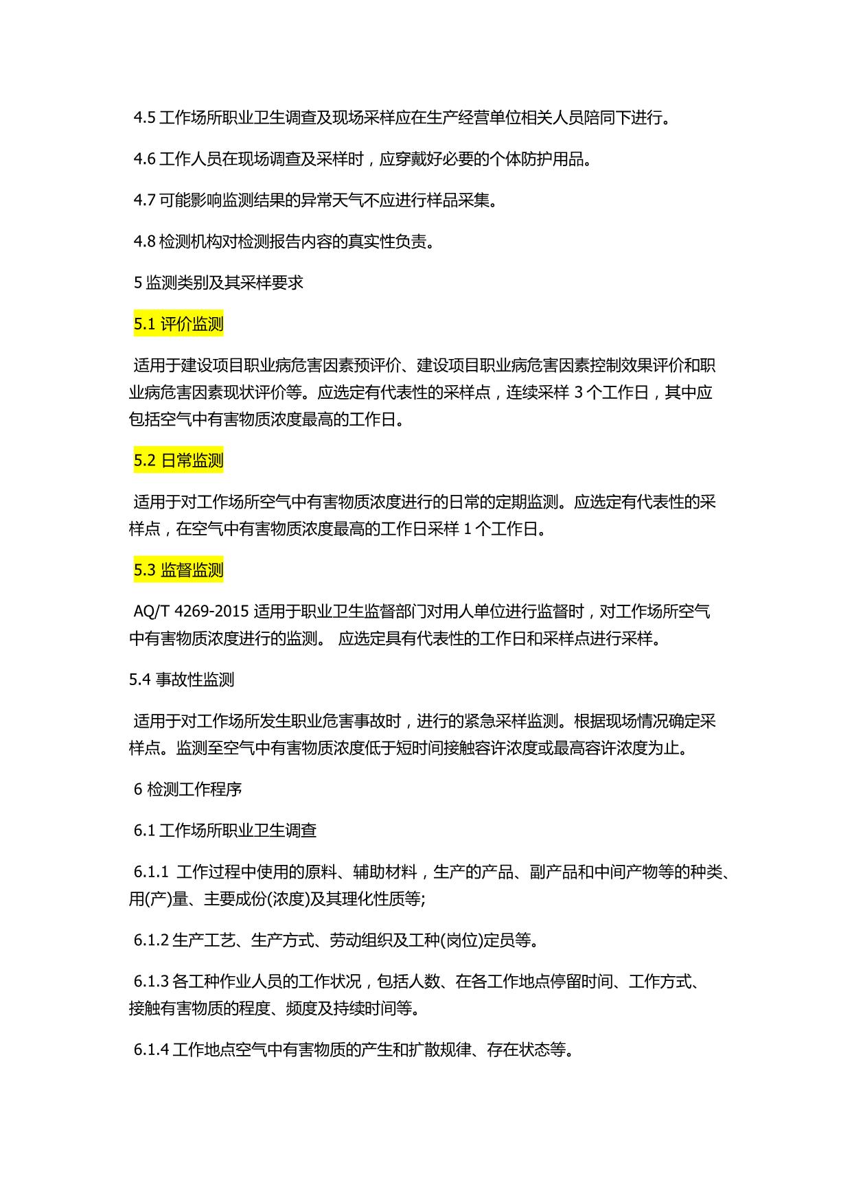 《工作场所职业病危害因素检测工作规范》(AQT4269-2015)