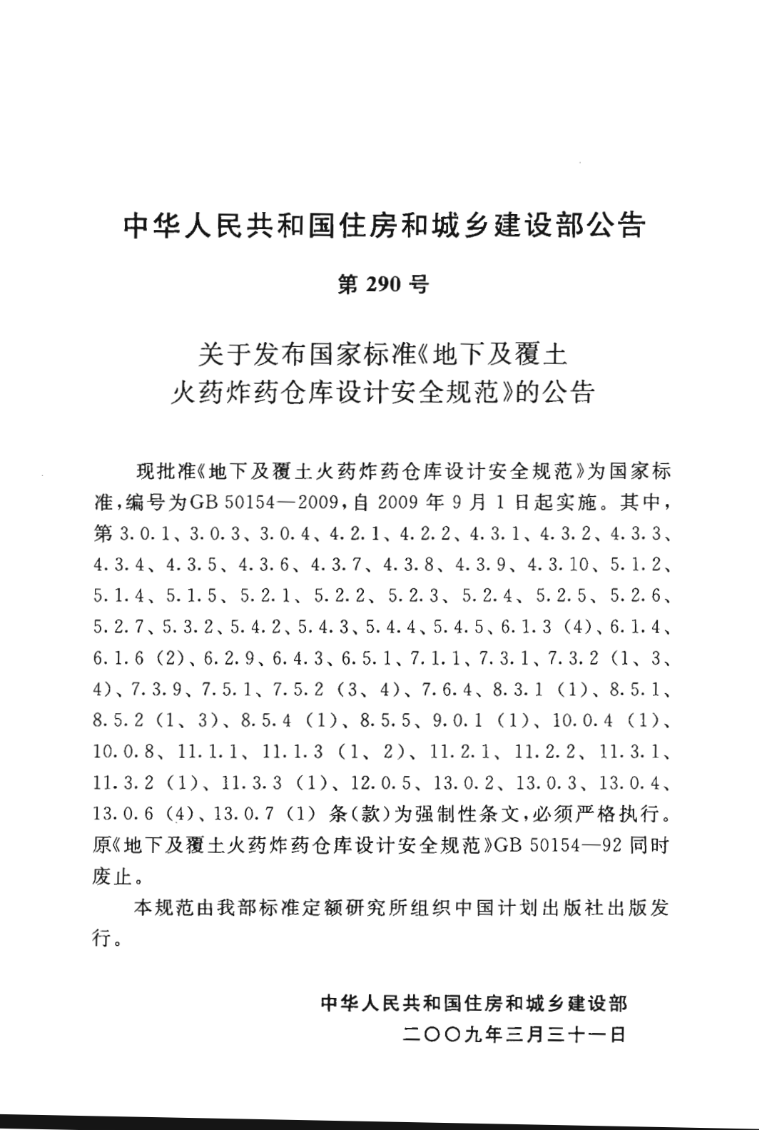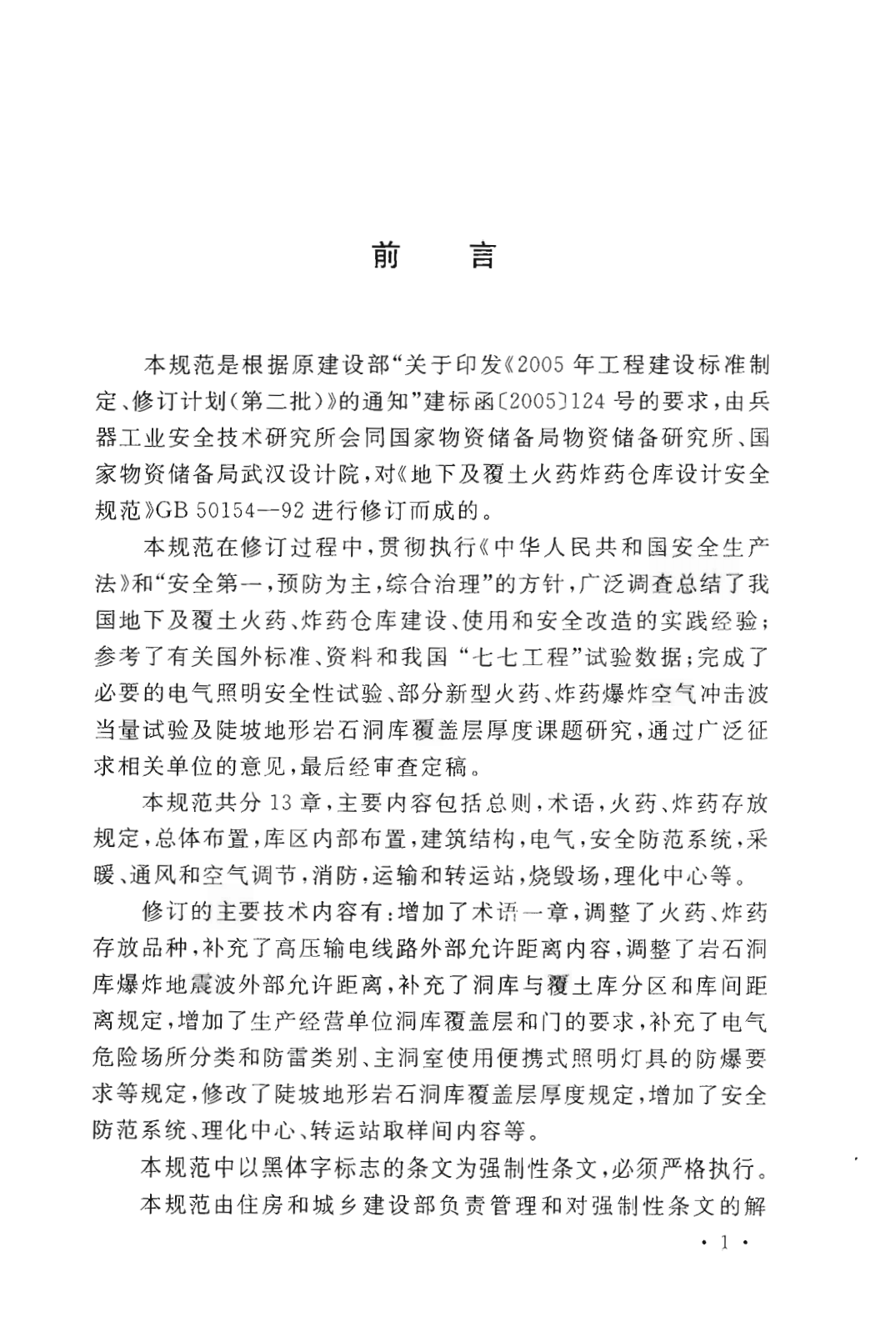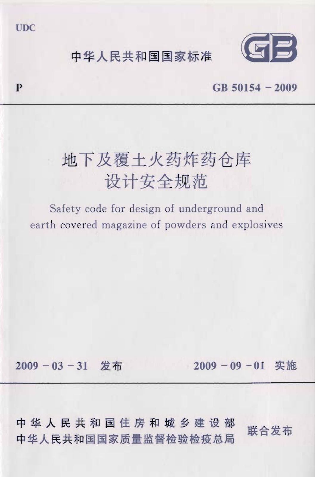 GB50154-2009地下及覆土火药炸药仓库设计安全规范