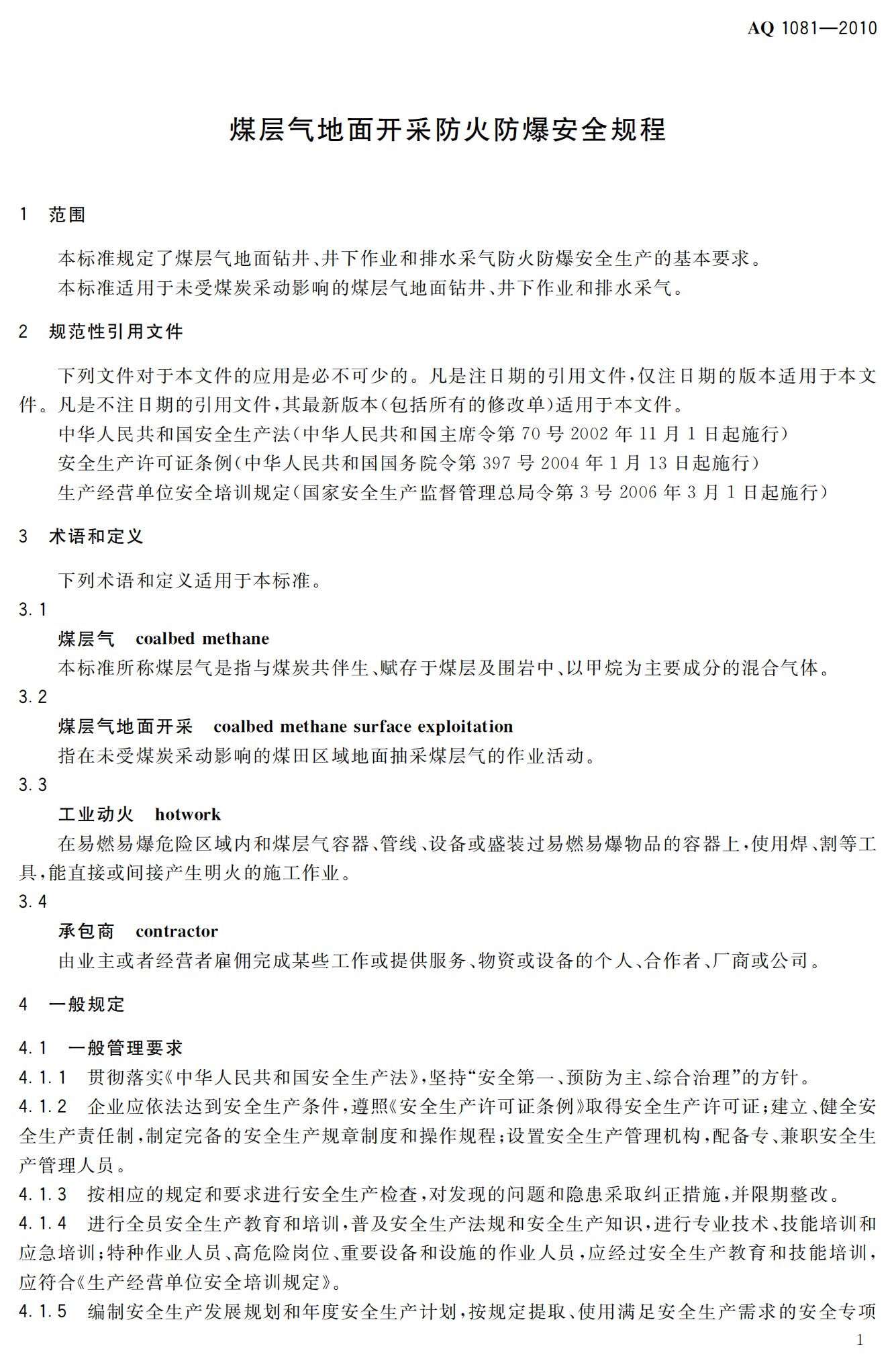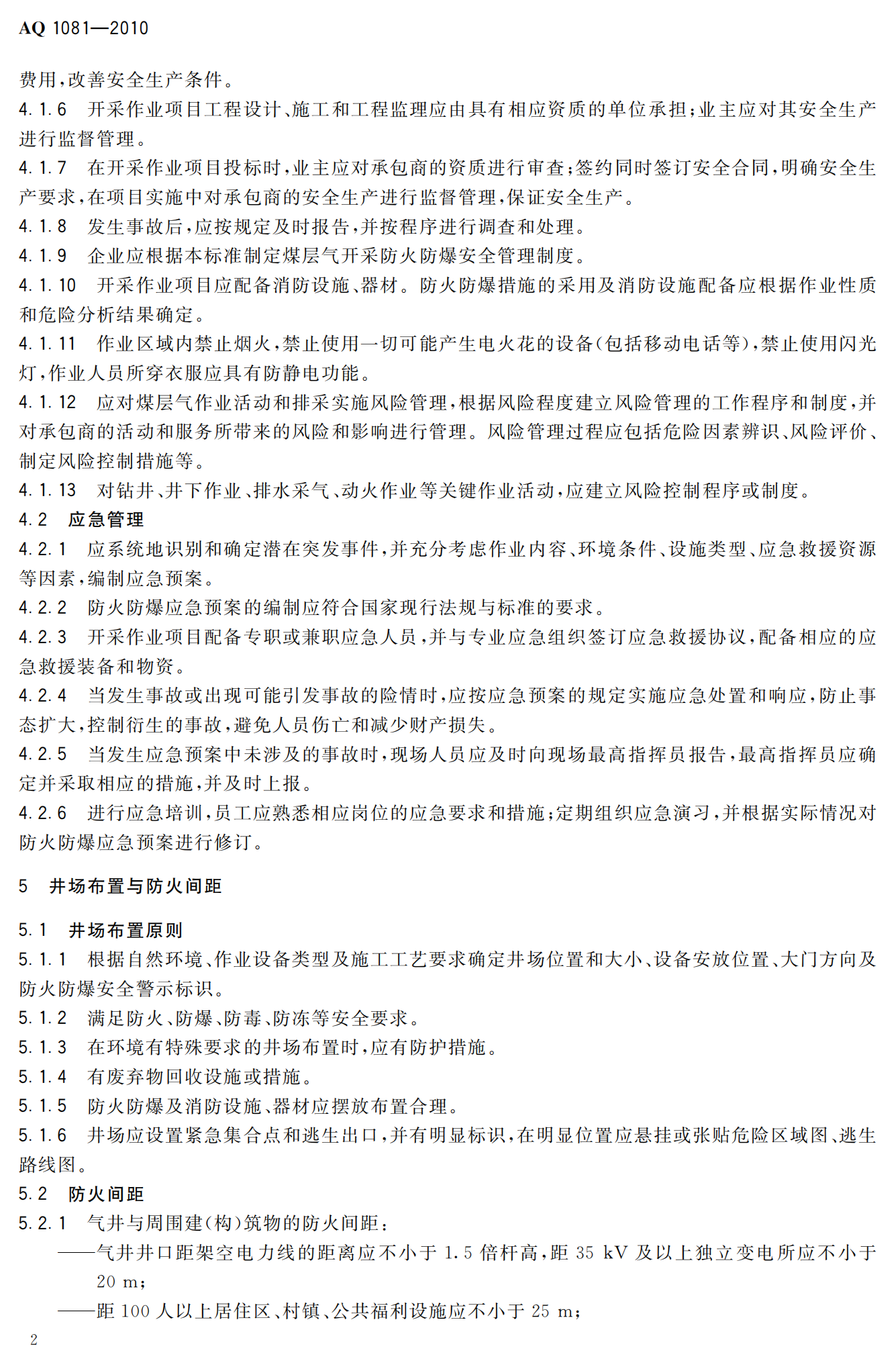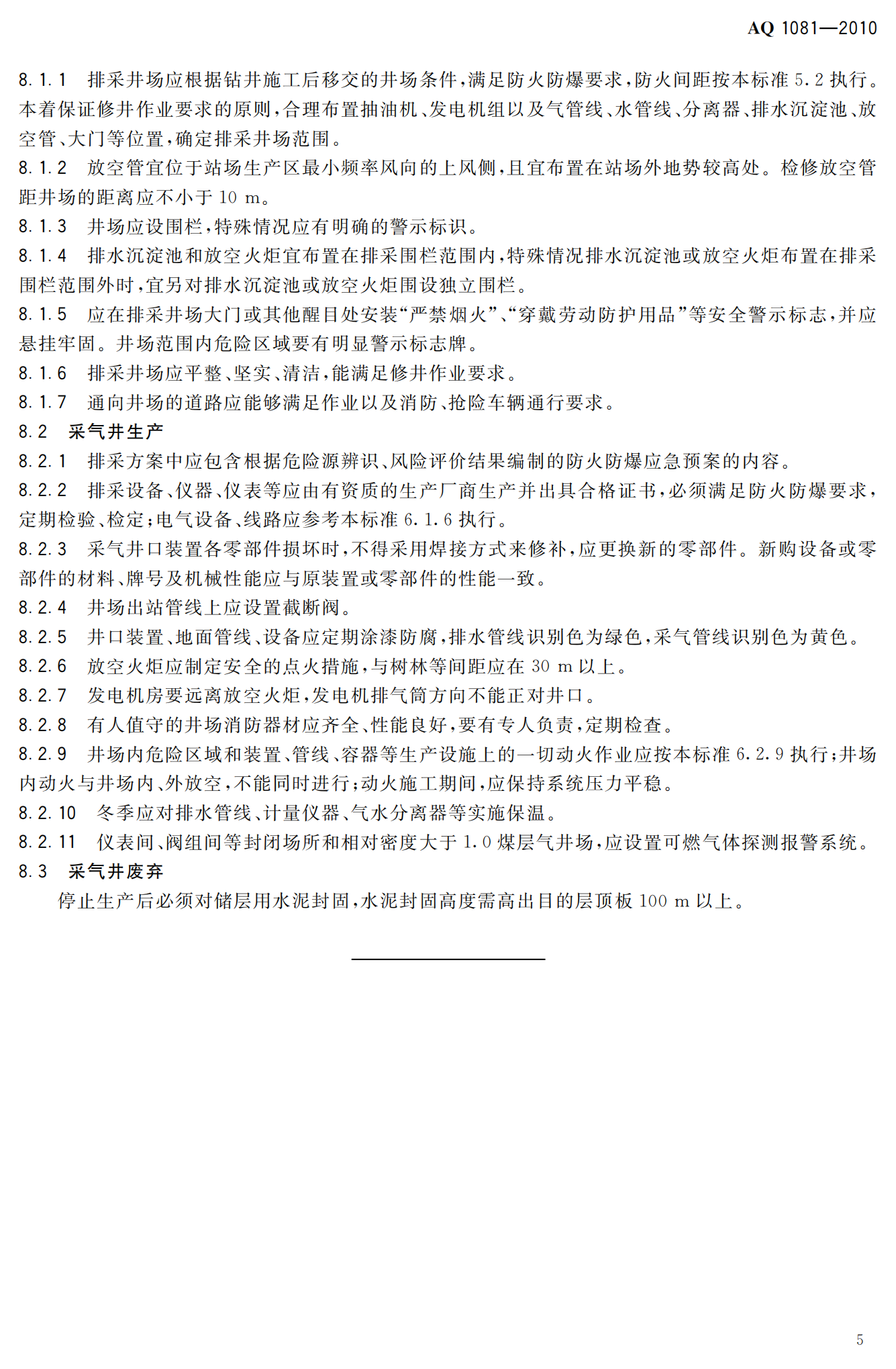 《煤层气地面开采防火防爆安全规程》(AQ1081-2010)