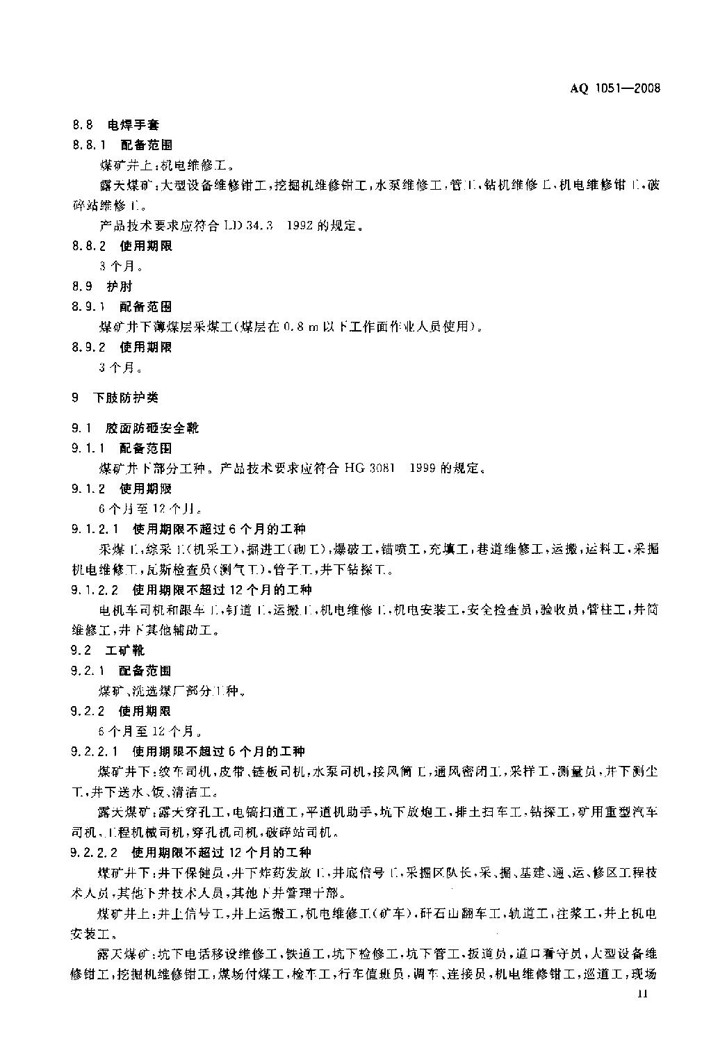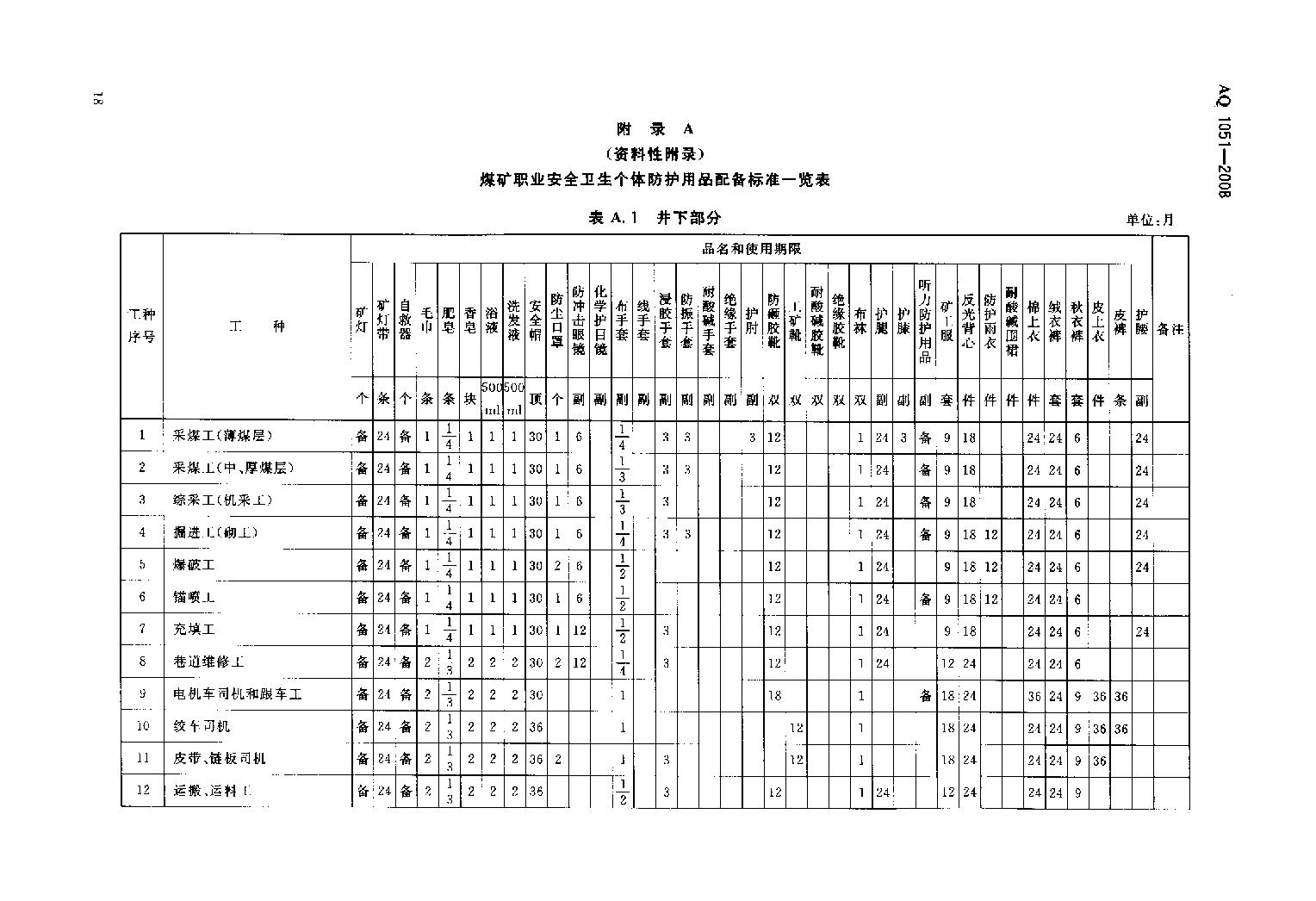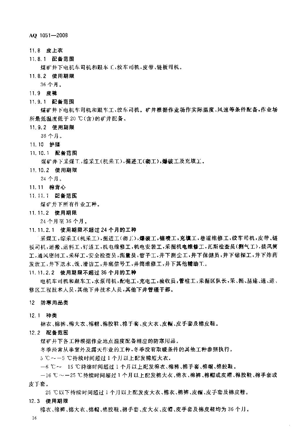 《煤矿职业安全卫生个体防护用品配备标准》(AQ1051-2008)