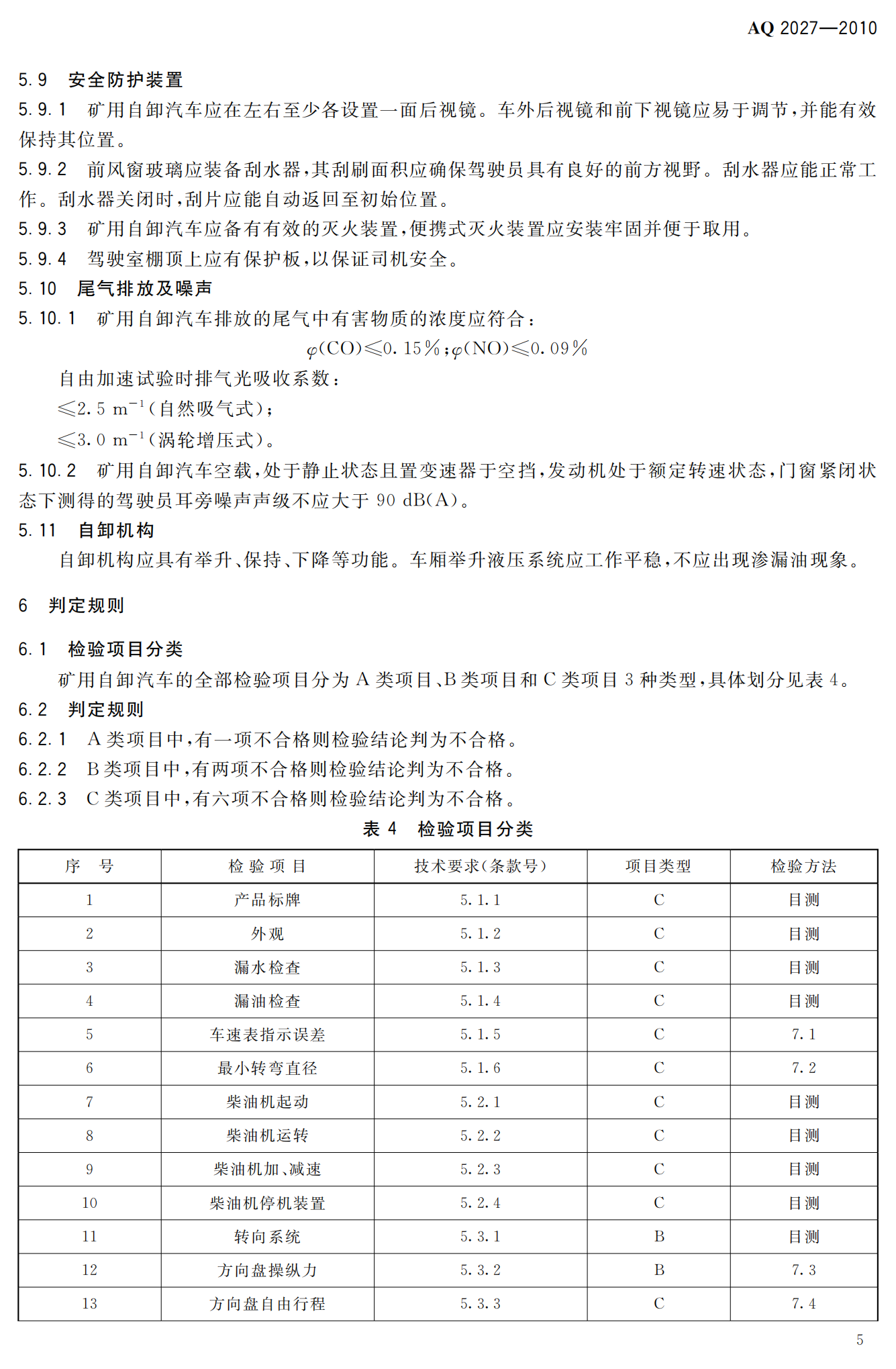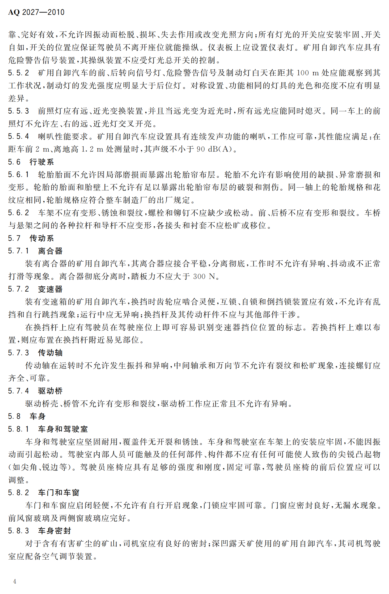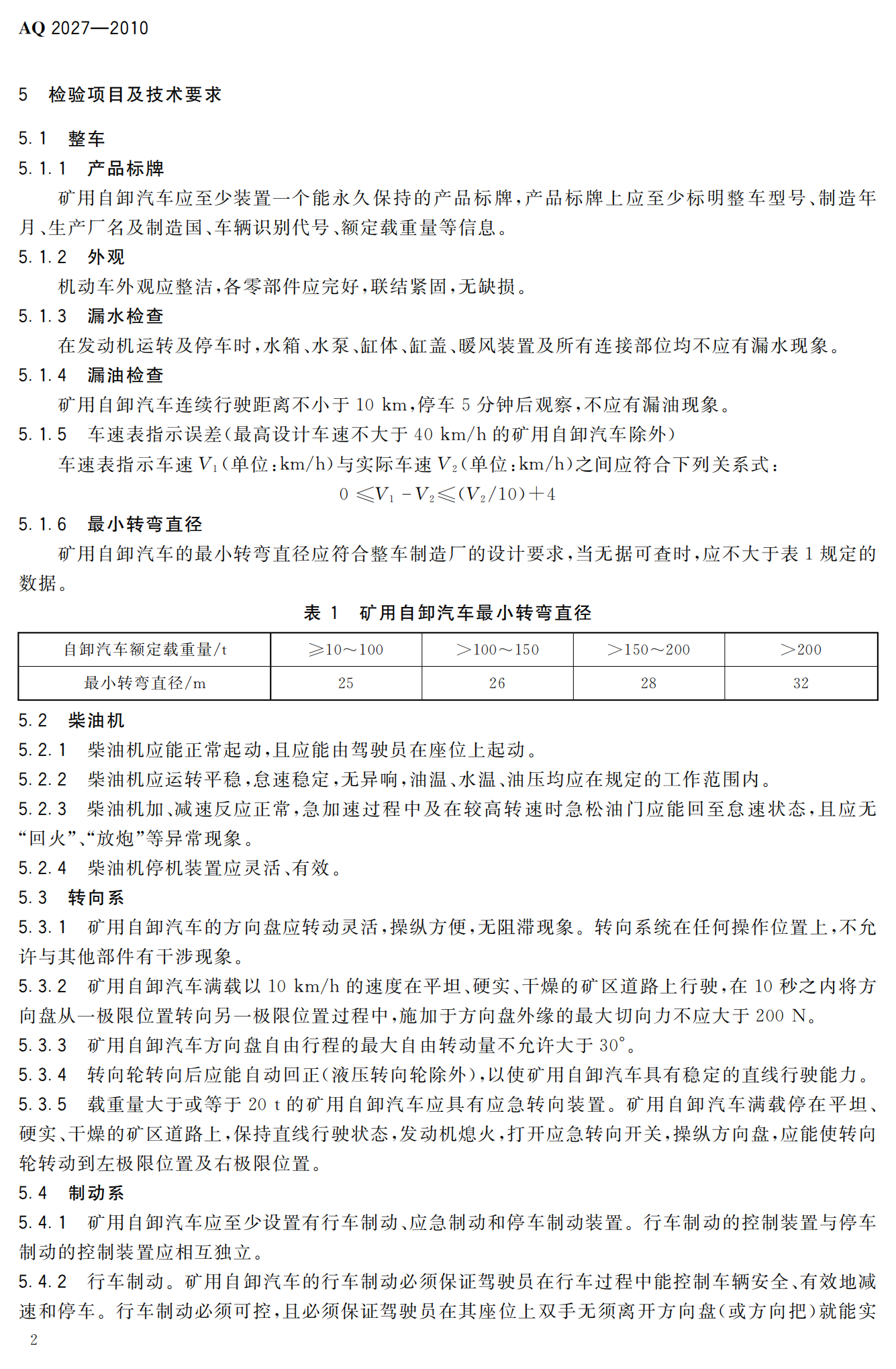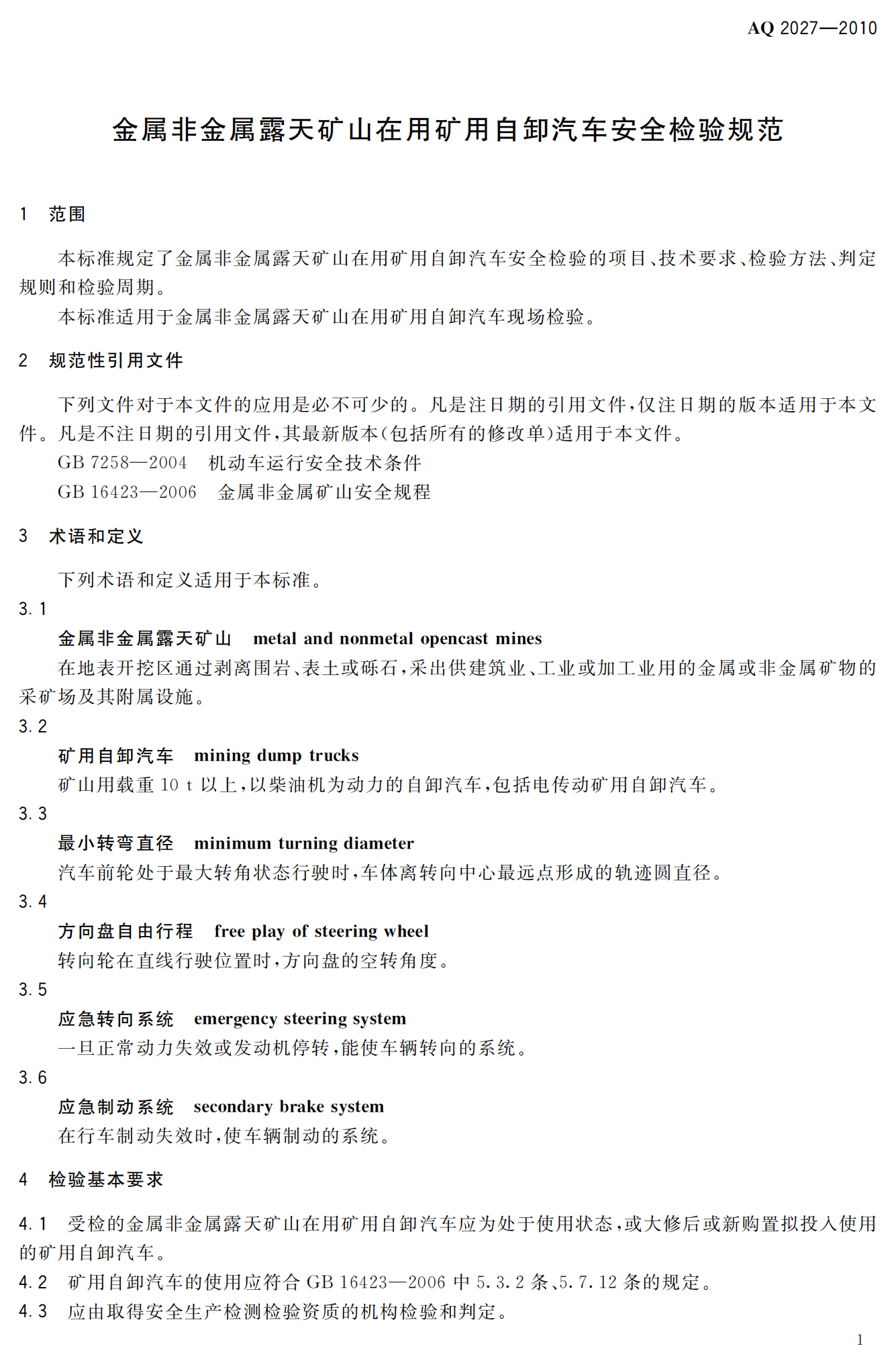 《金属非金属露天矿山在用矿用自卸汽车安全检验规范》(AQ2027-2010)