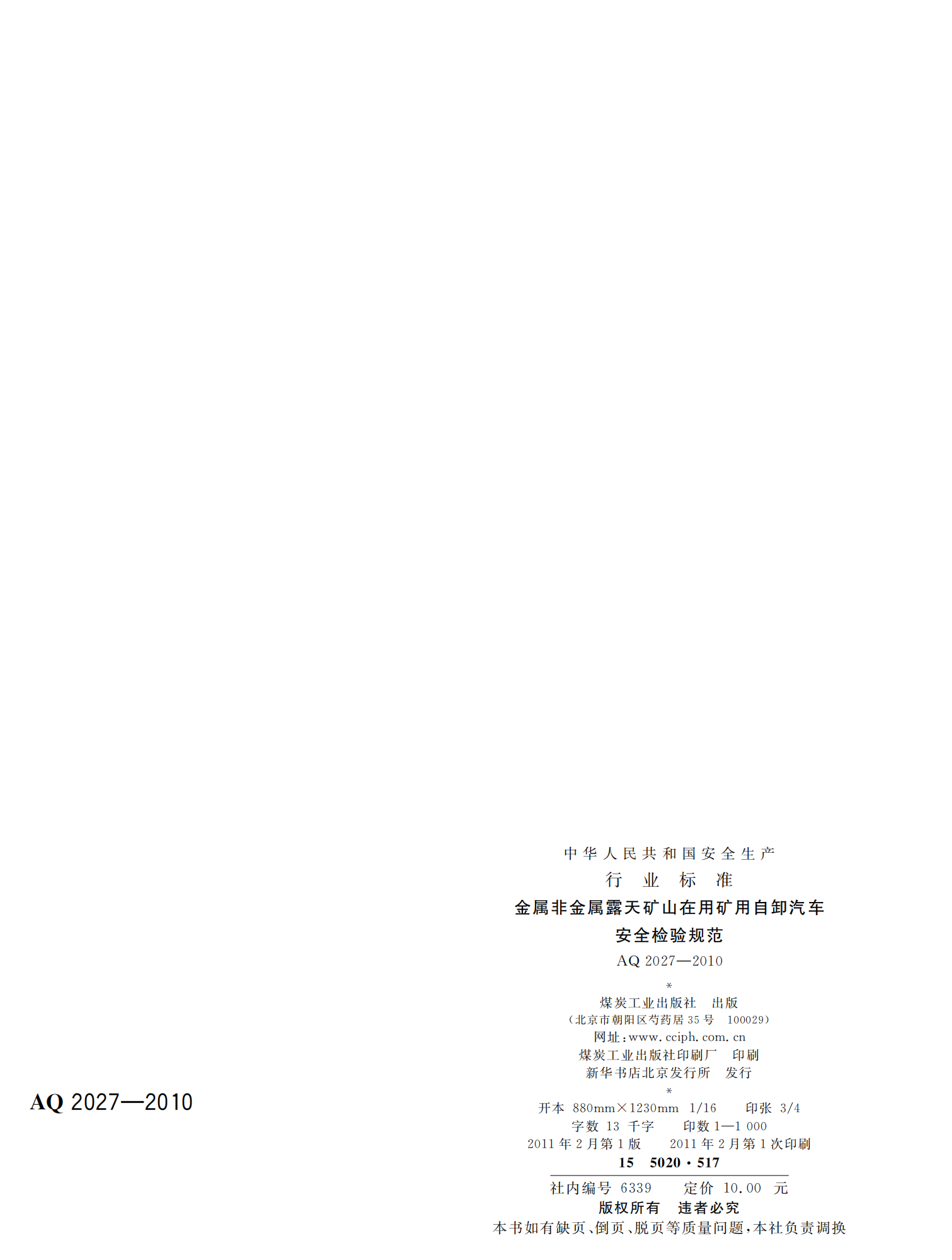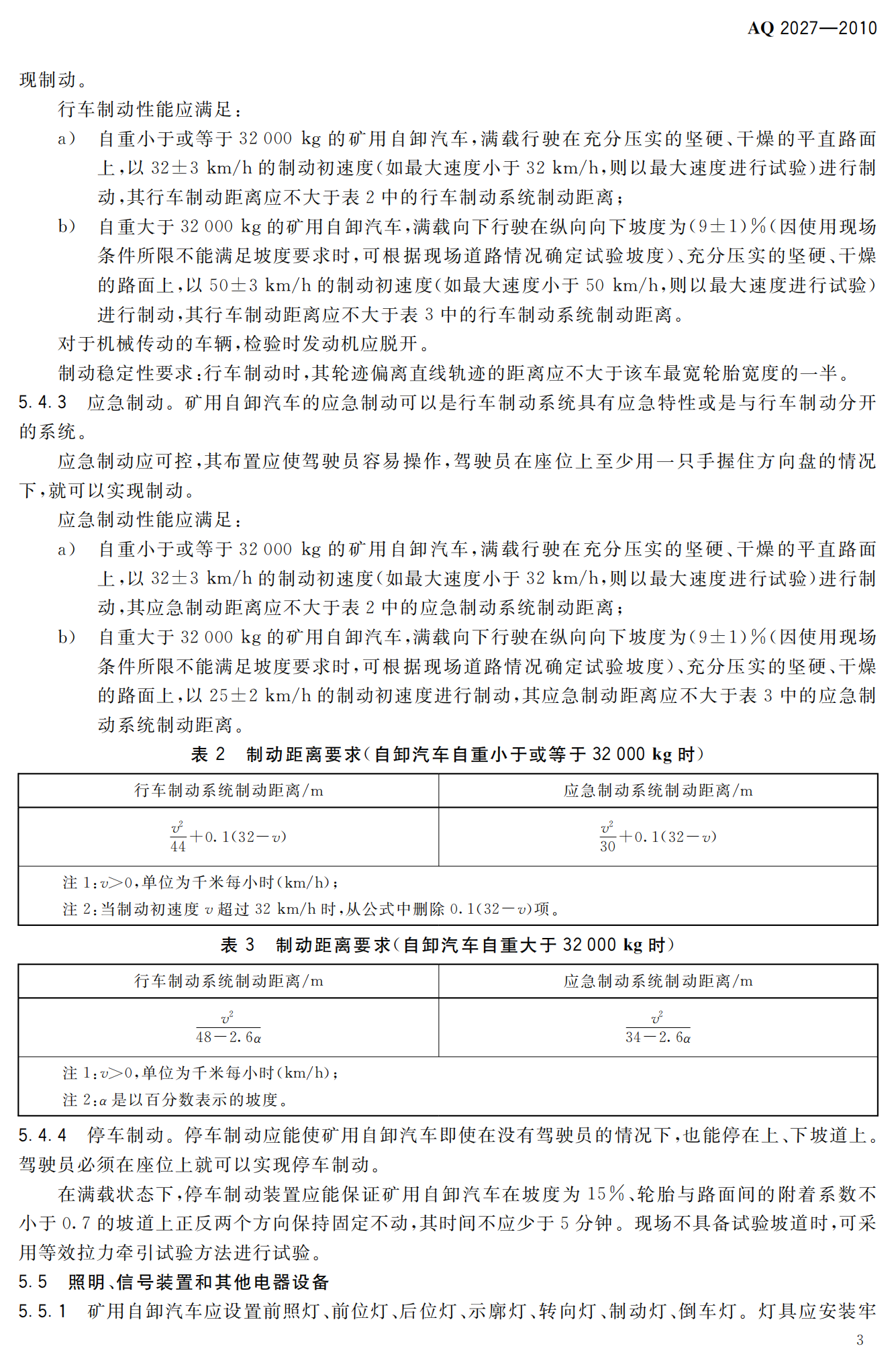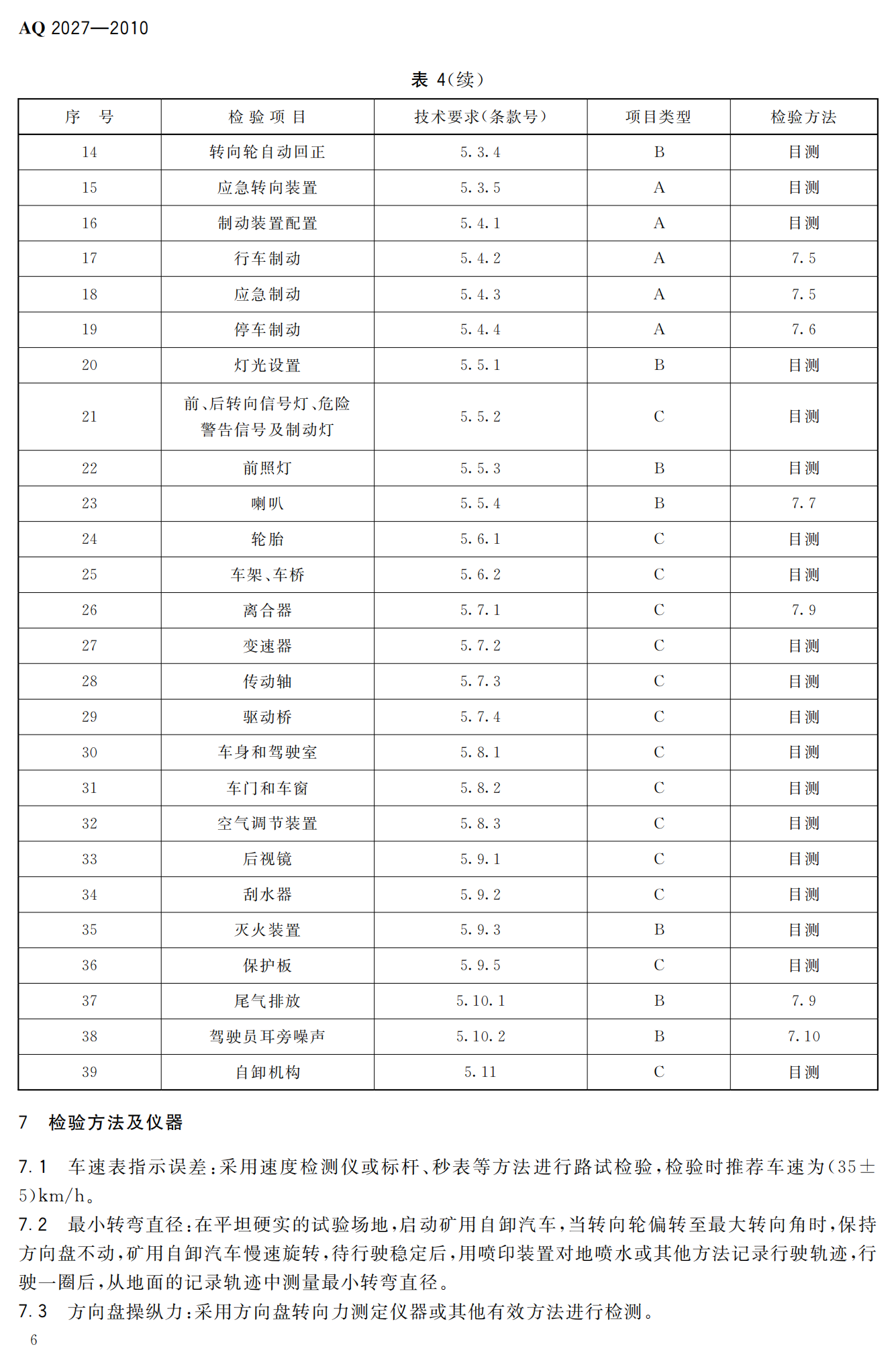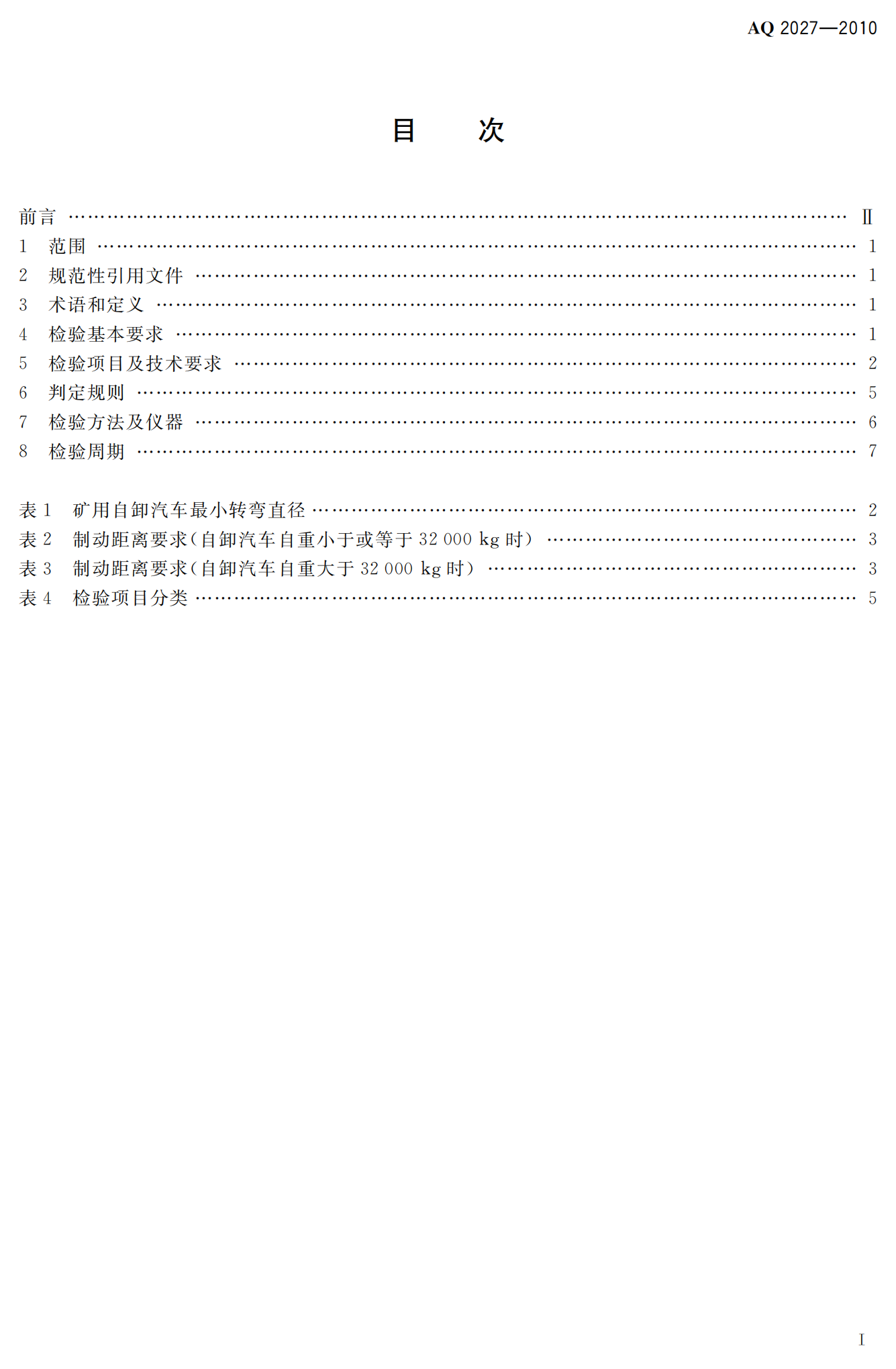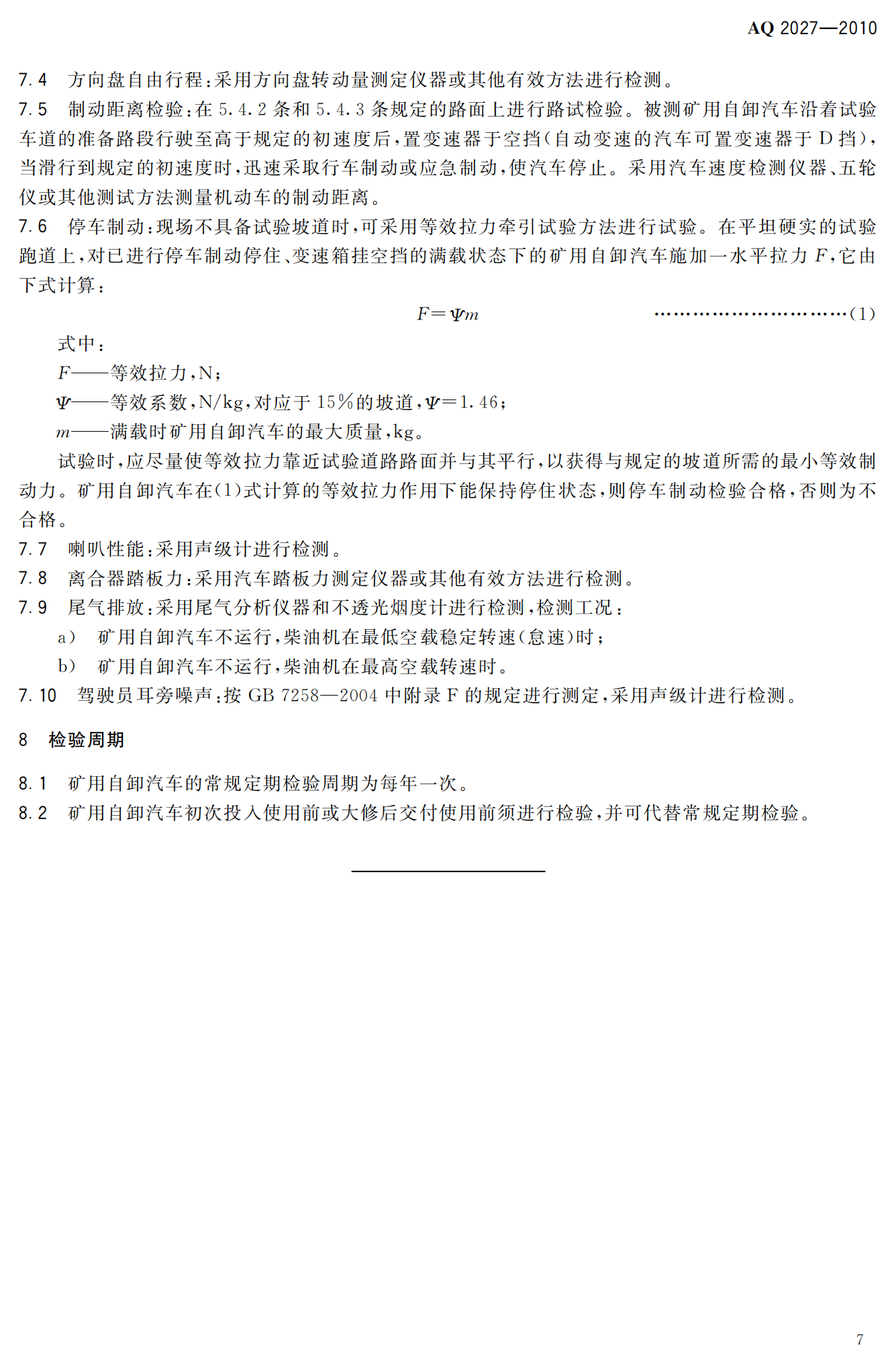 《金属非金属露天矿山在用矿用自卸汽车安全检验规范》(AQ2027-2010)