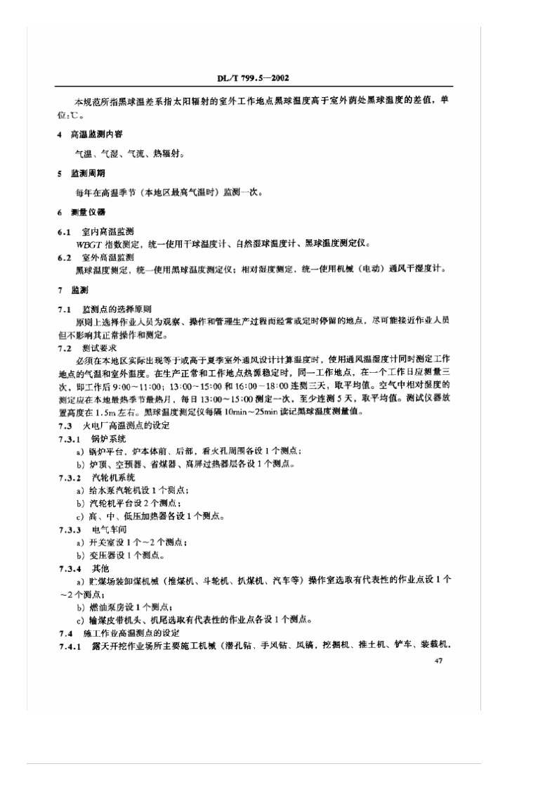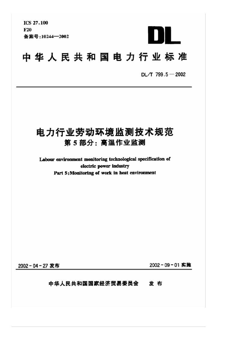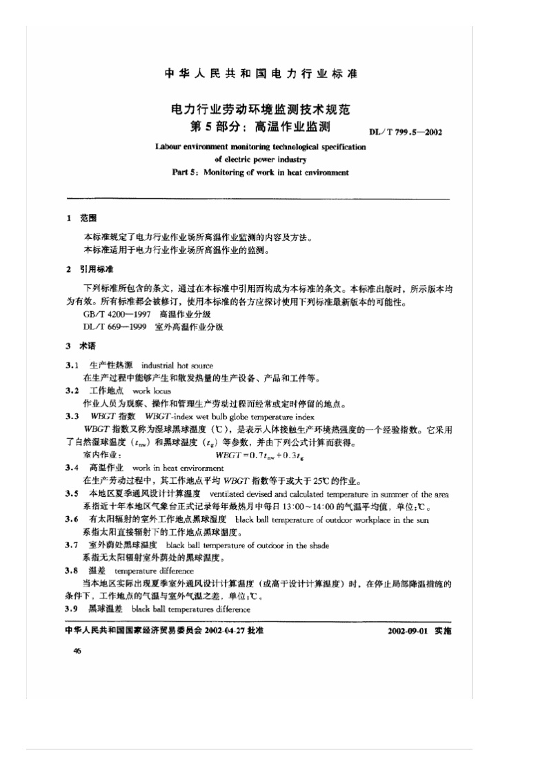 《电力行业劳动环境监测技术规范 第5部分:高温作业监测》(DL/T799.5-2002)