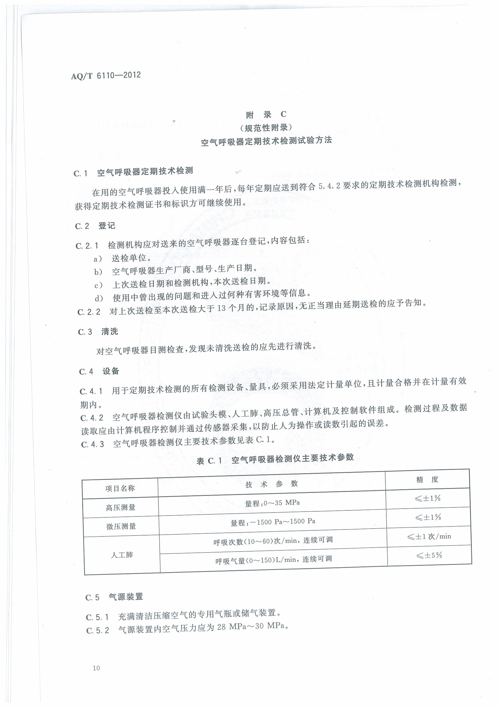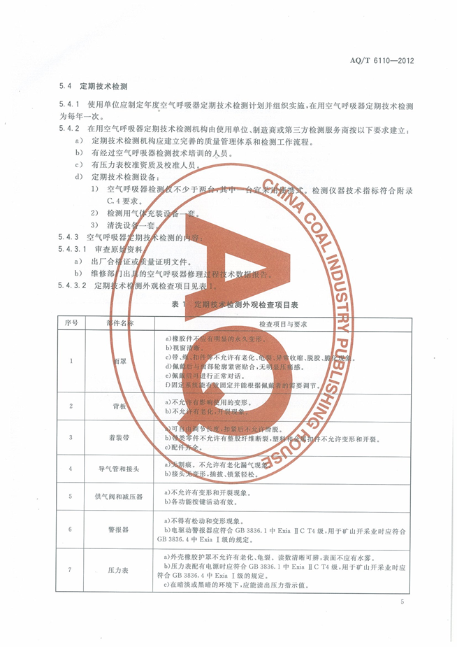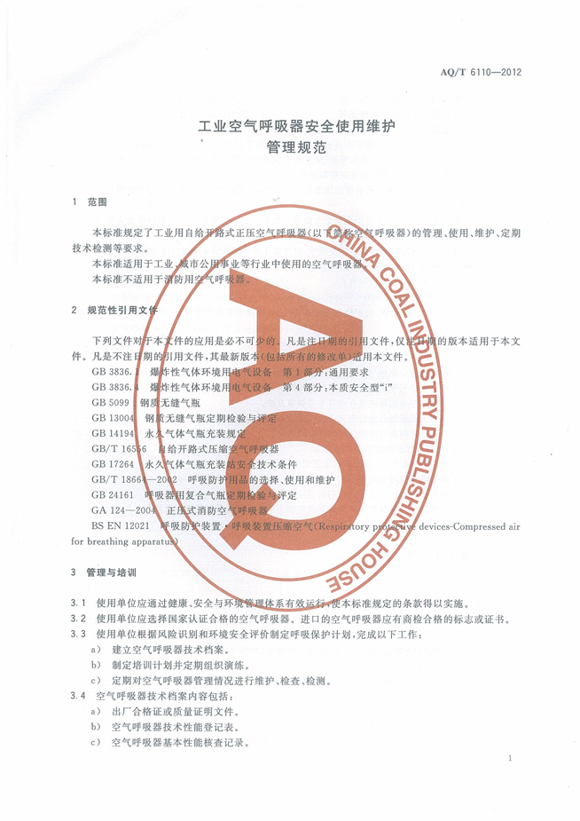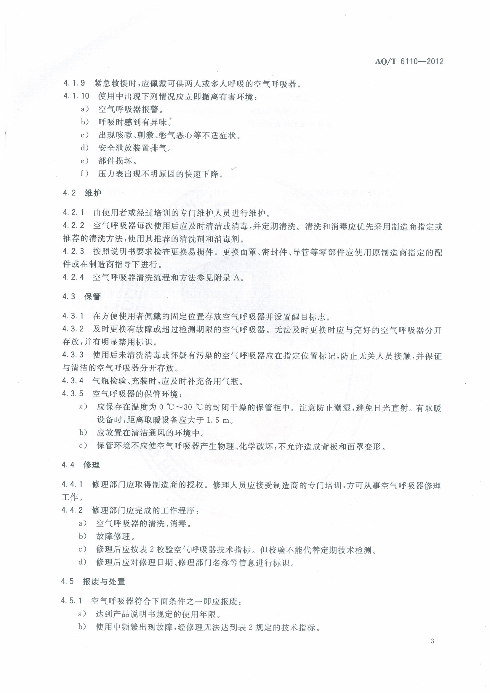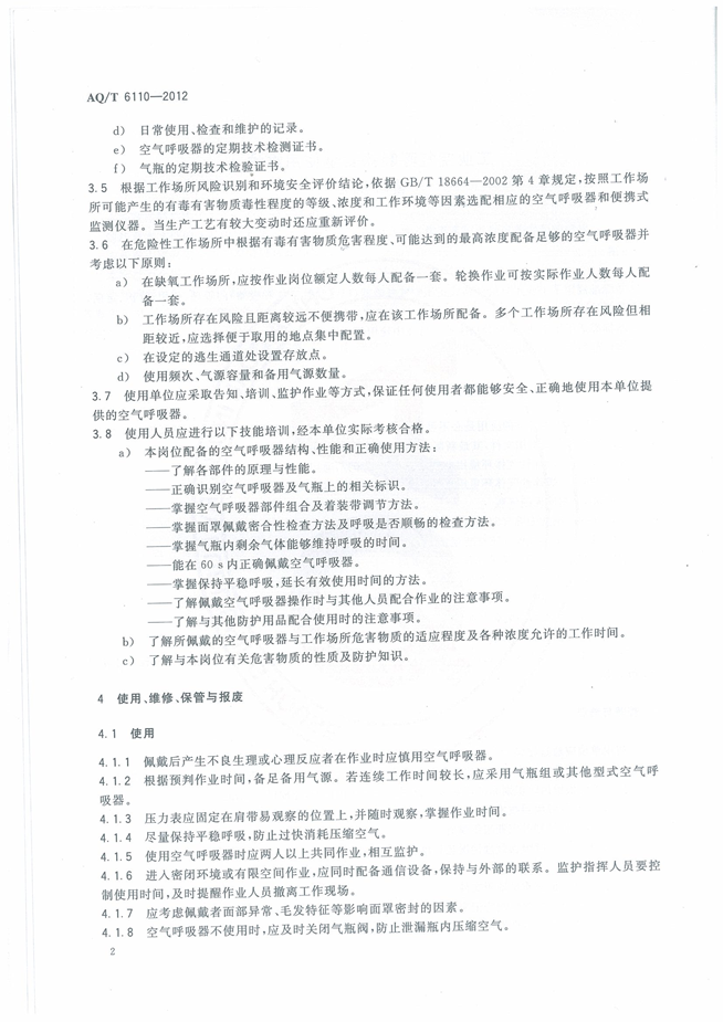 《工业空气呼吸器安全使用维护管理规范》(AQT6110-2012)