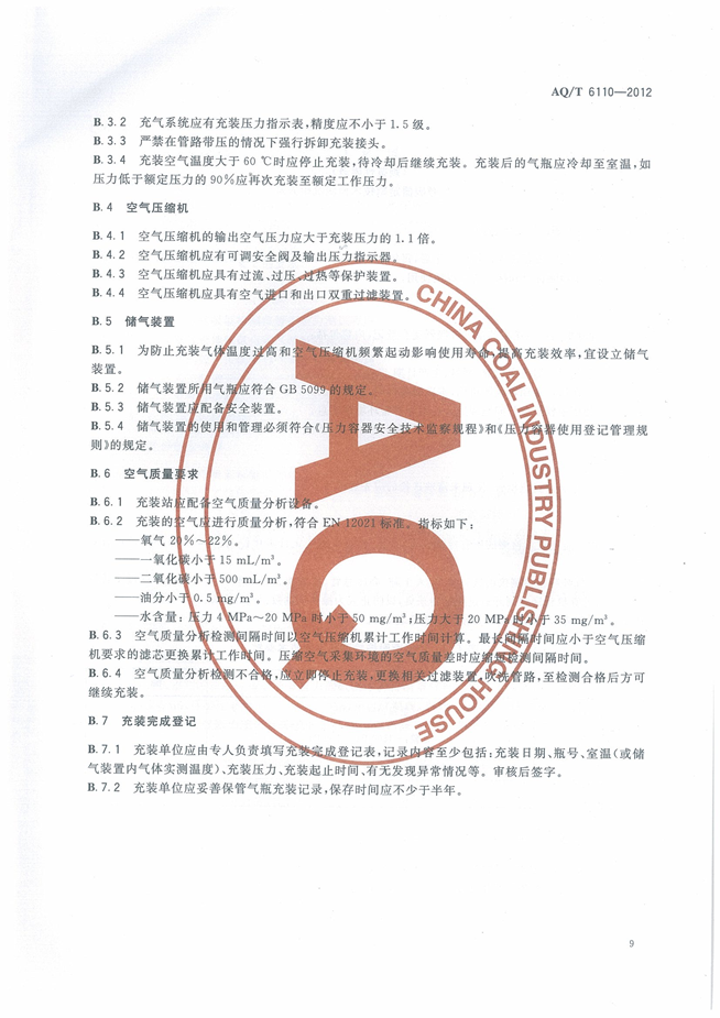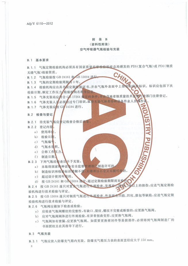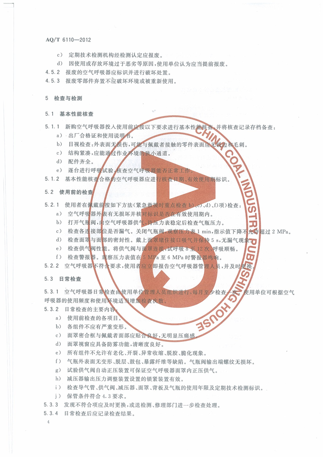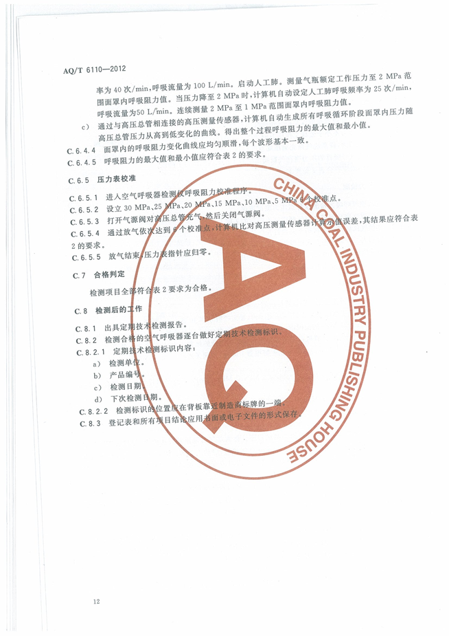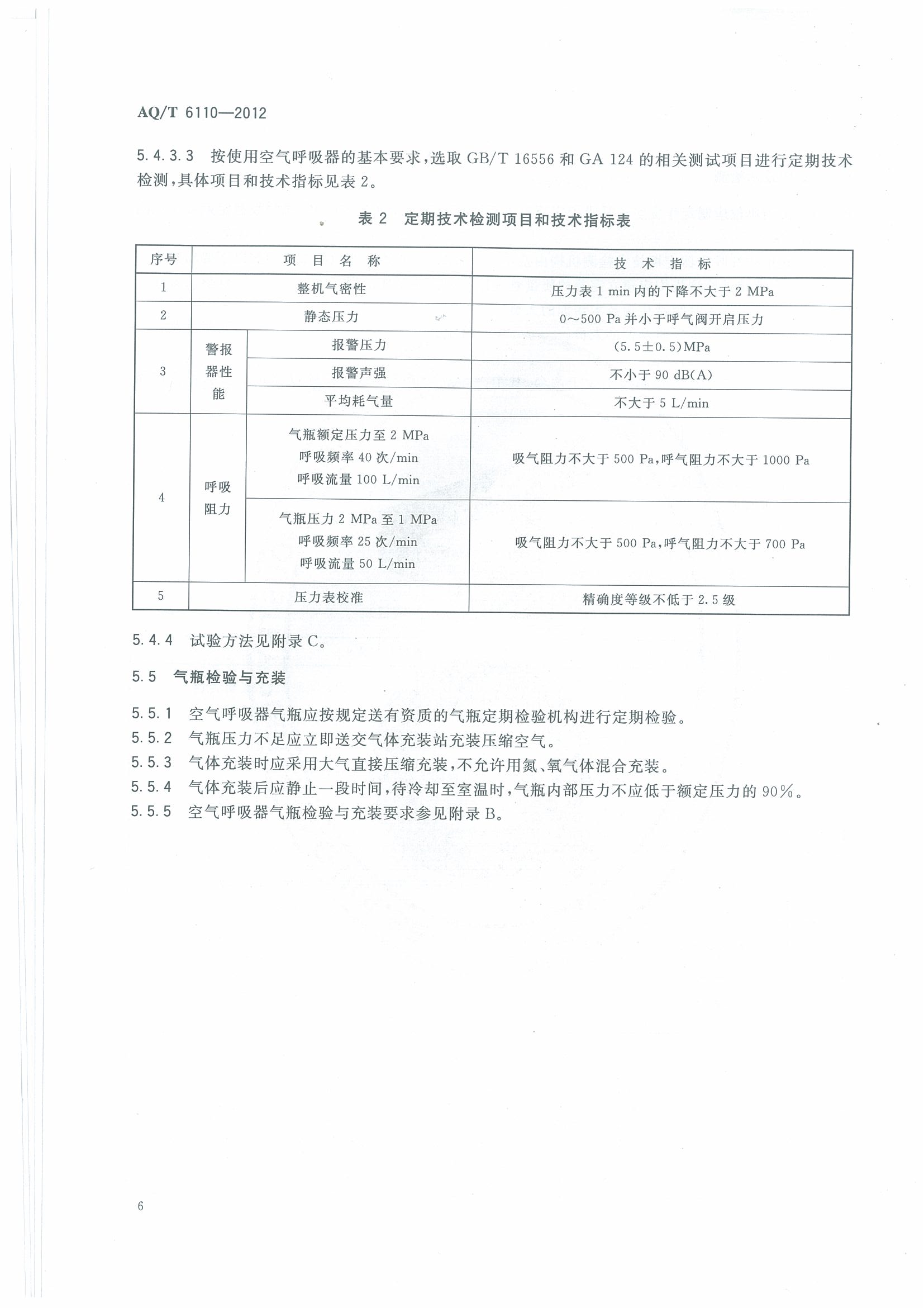 《工业空气呼吸器安全使用维护管理规范》(AQT6110-2012)