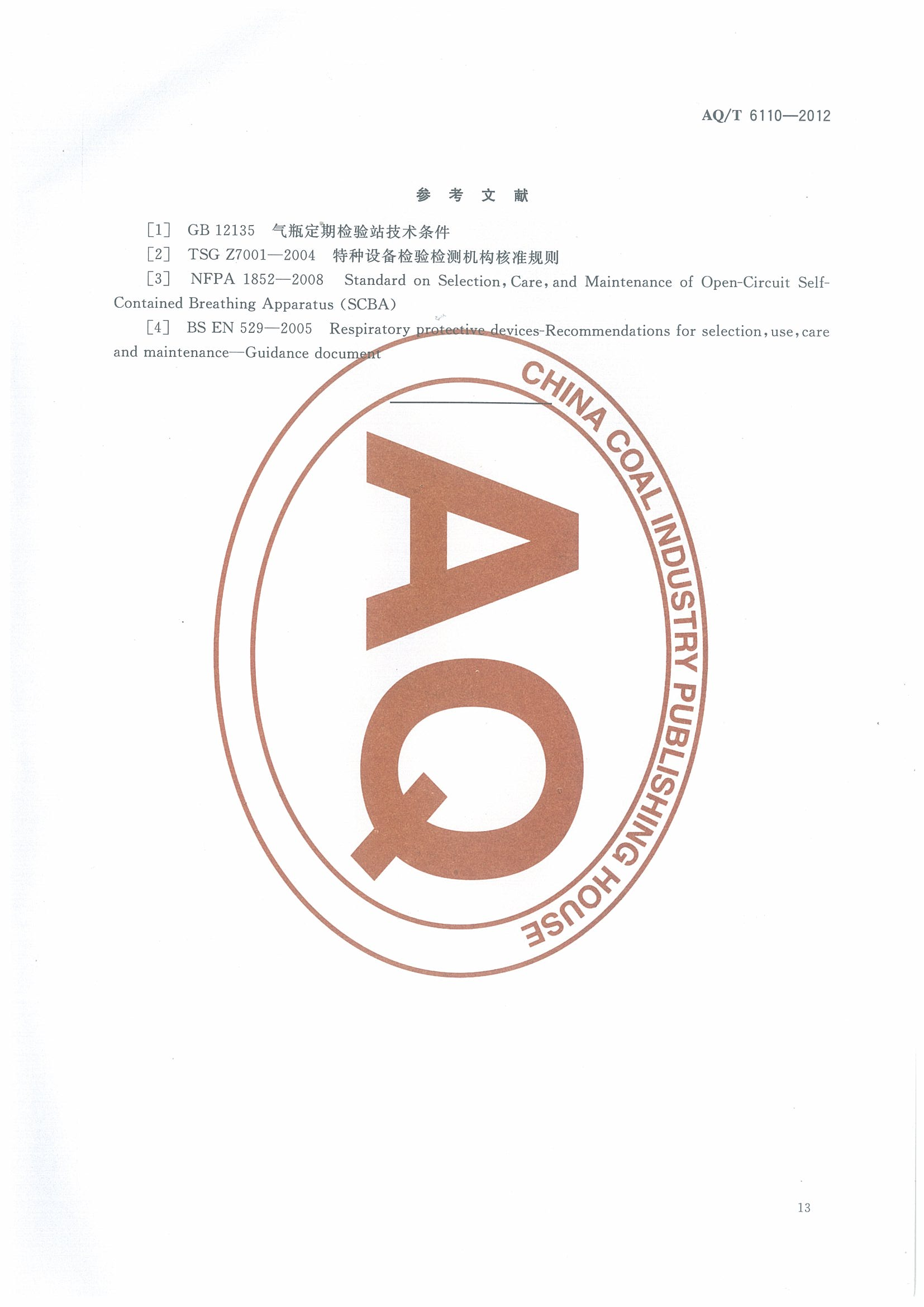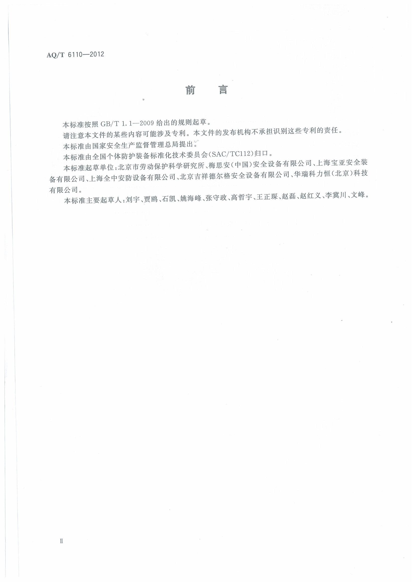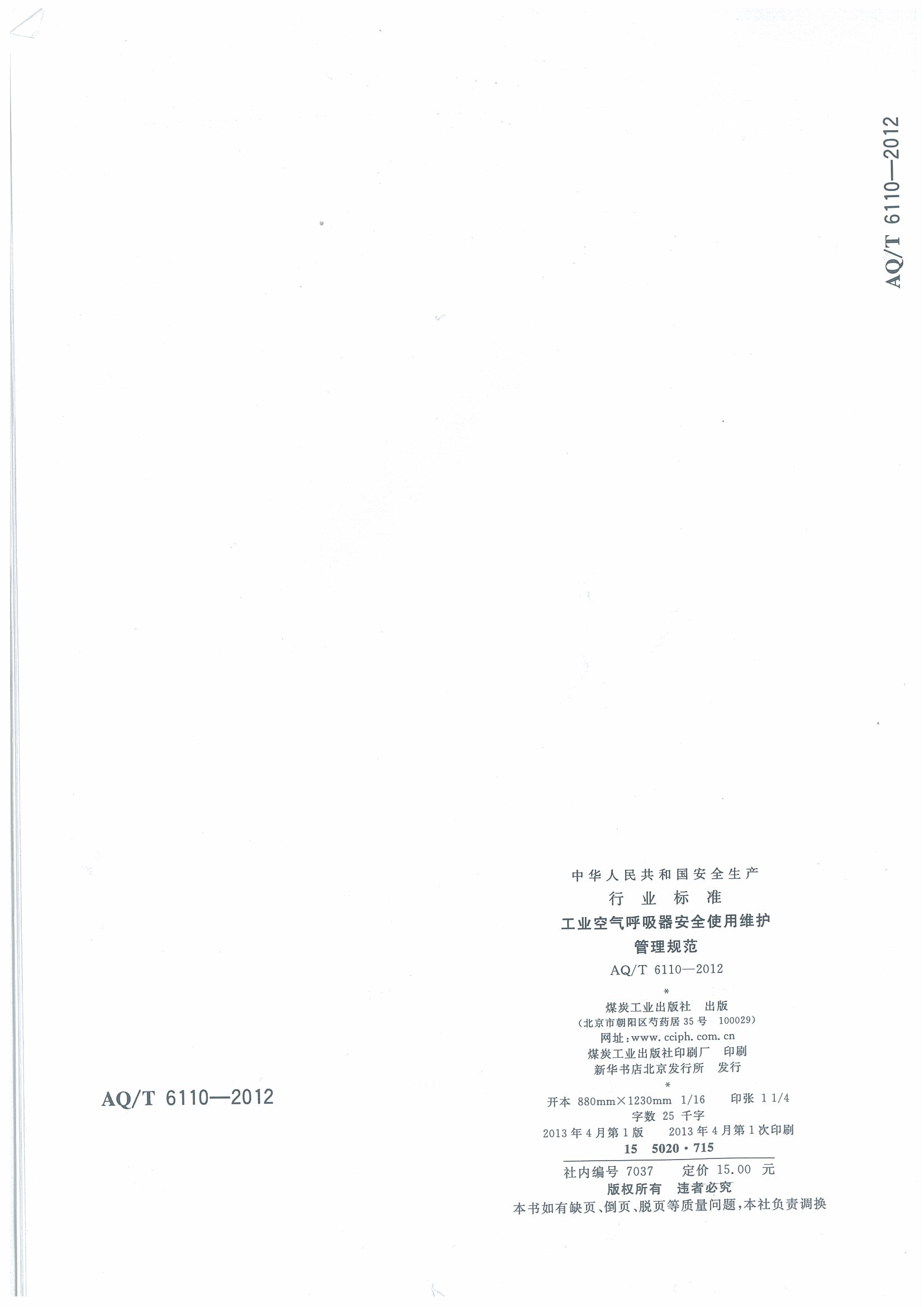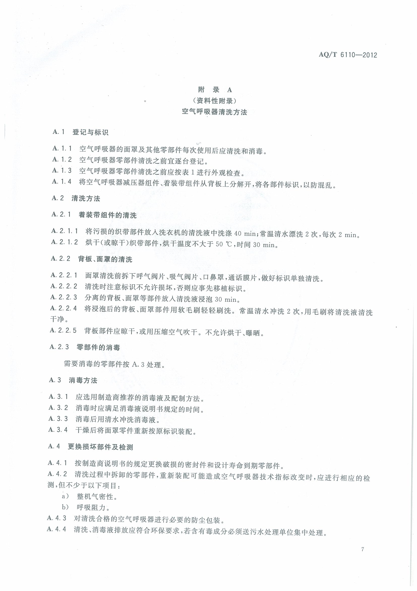 《工业空气呼吸器安全使用维护管理规范》(AQT6110-2012)