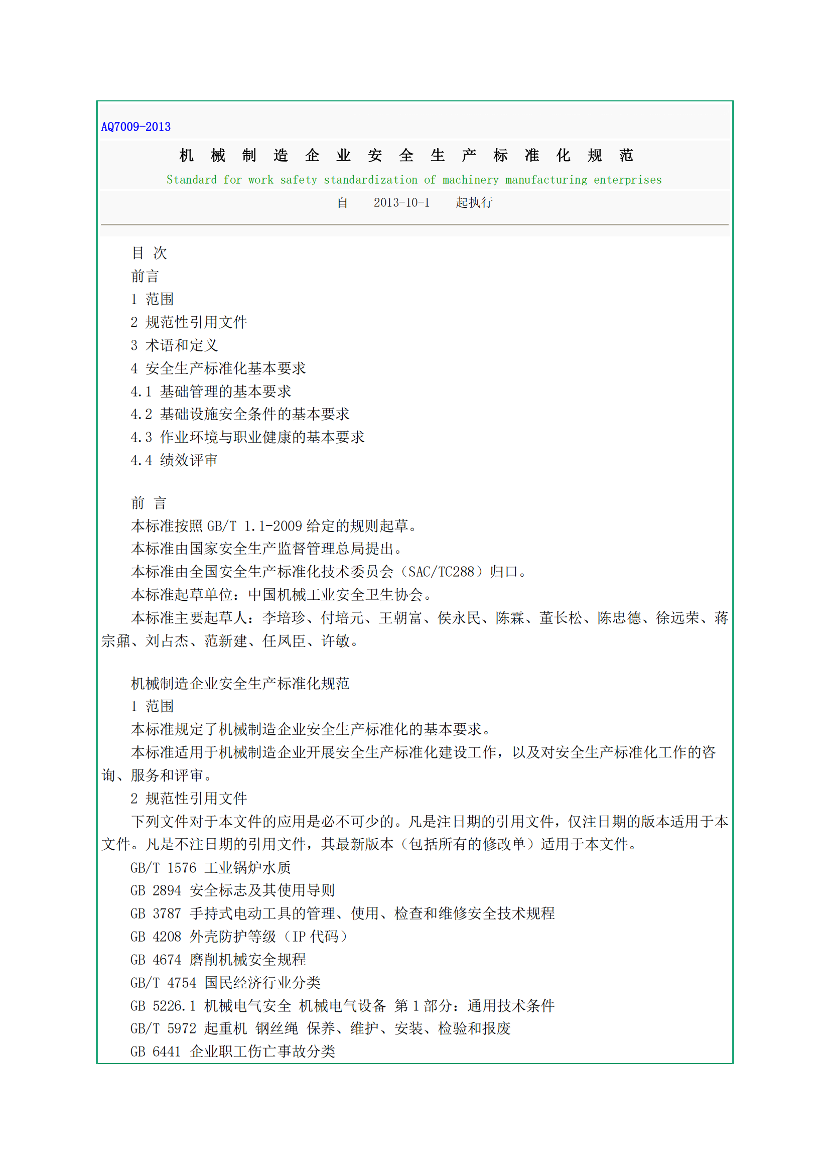 《机械制造企业安全生产标准化规范》(AQT7009-2013)