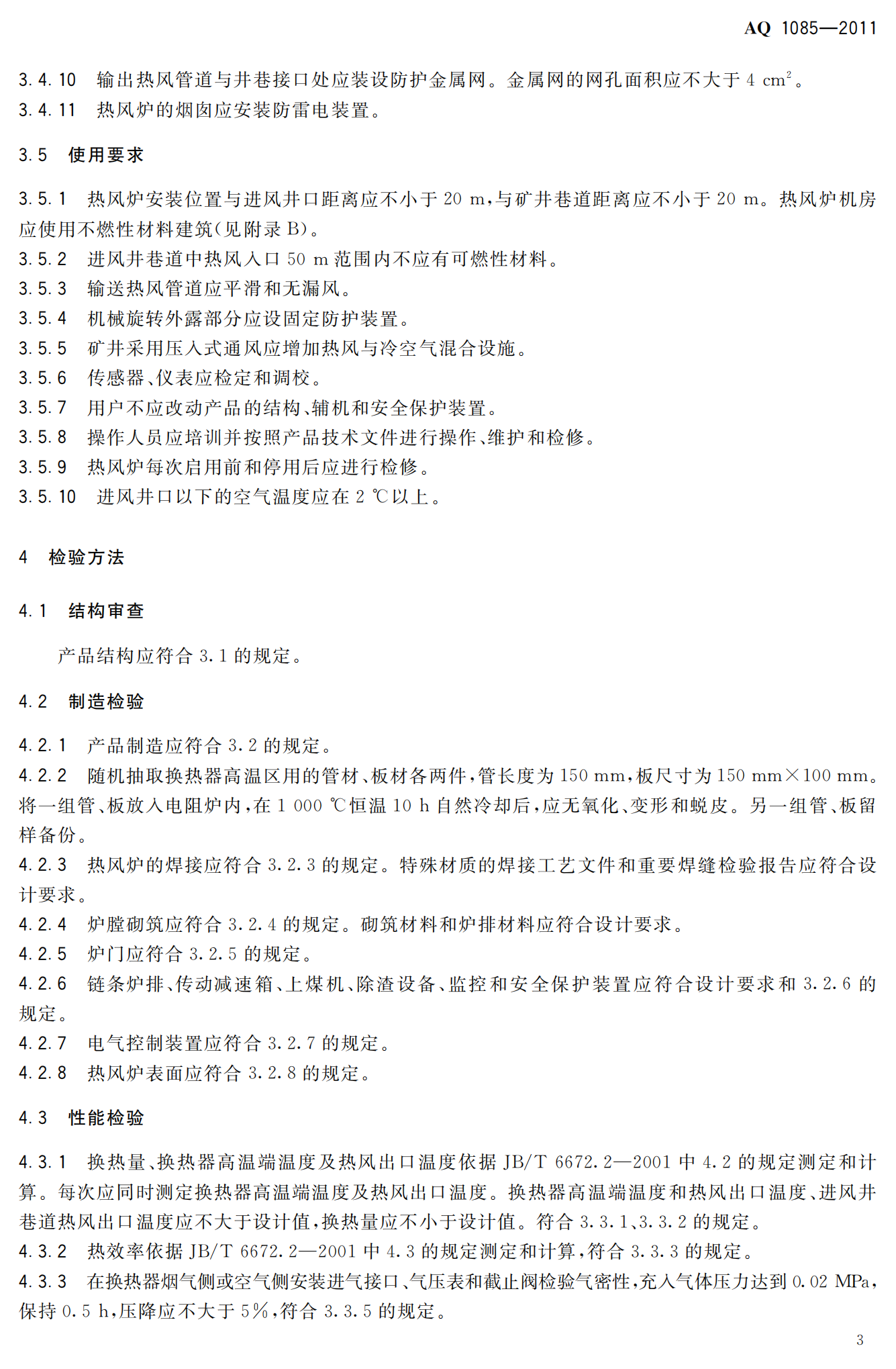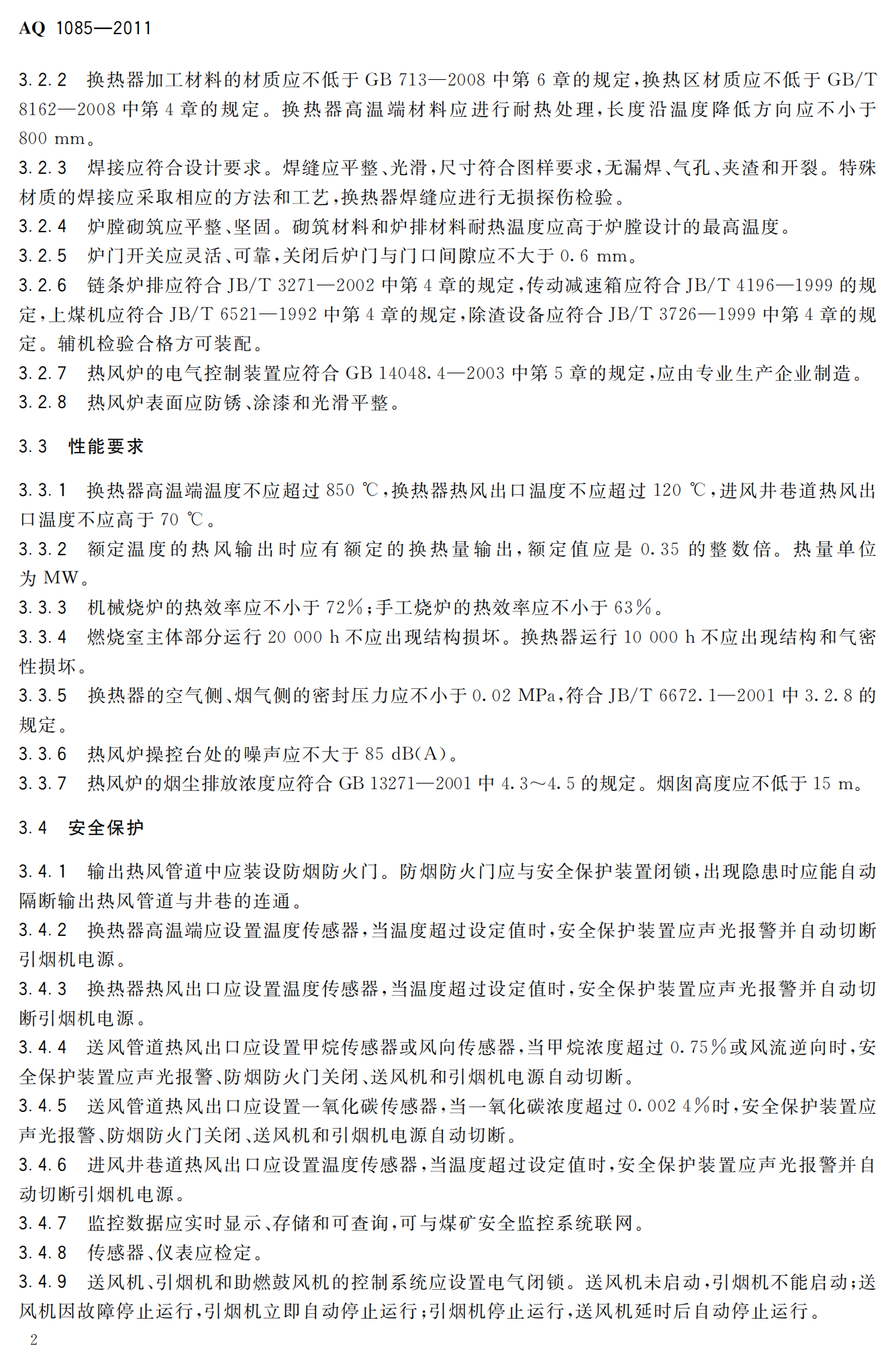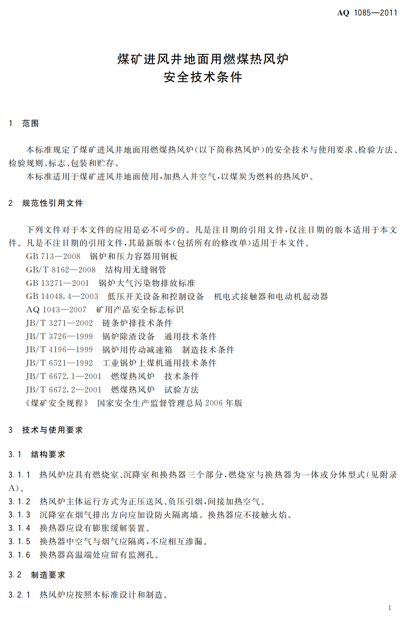 《煤矿进风井地面用燃煤热风炉安全技术条件》(AQ1085-2011)
